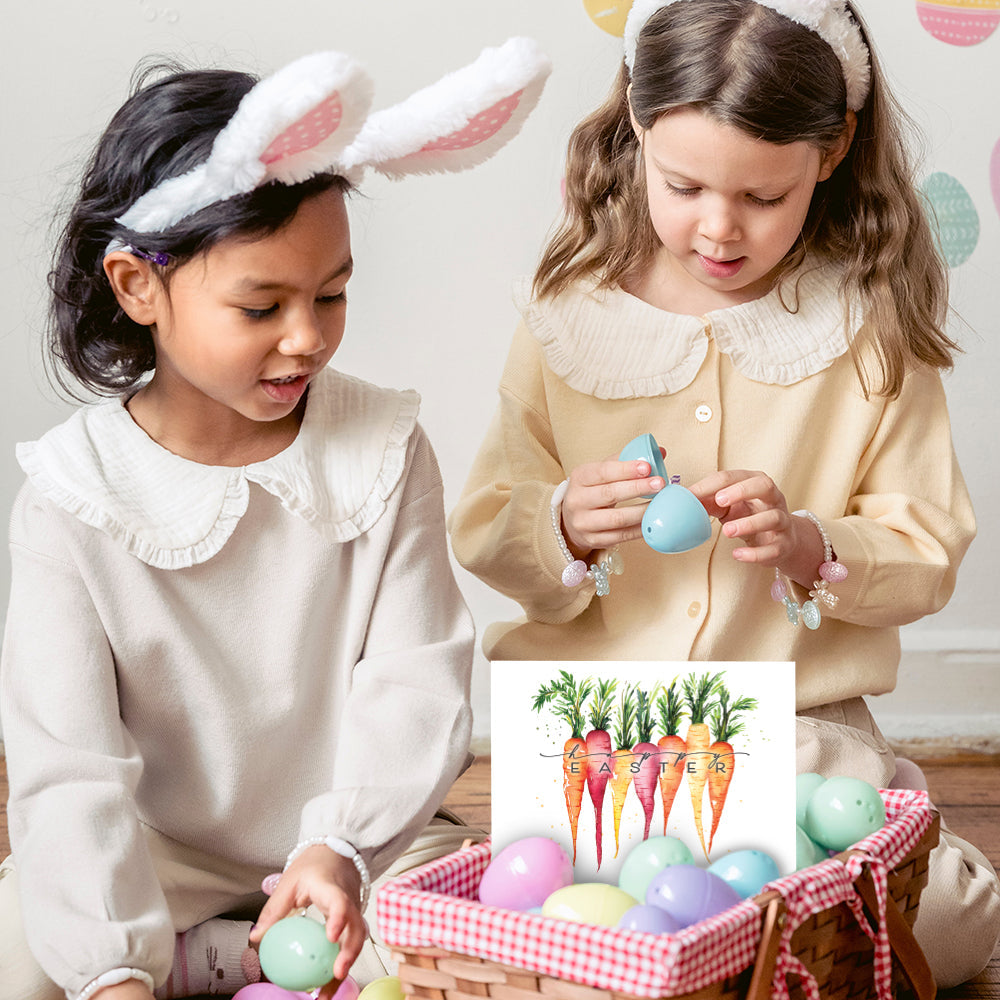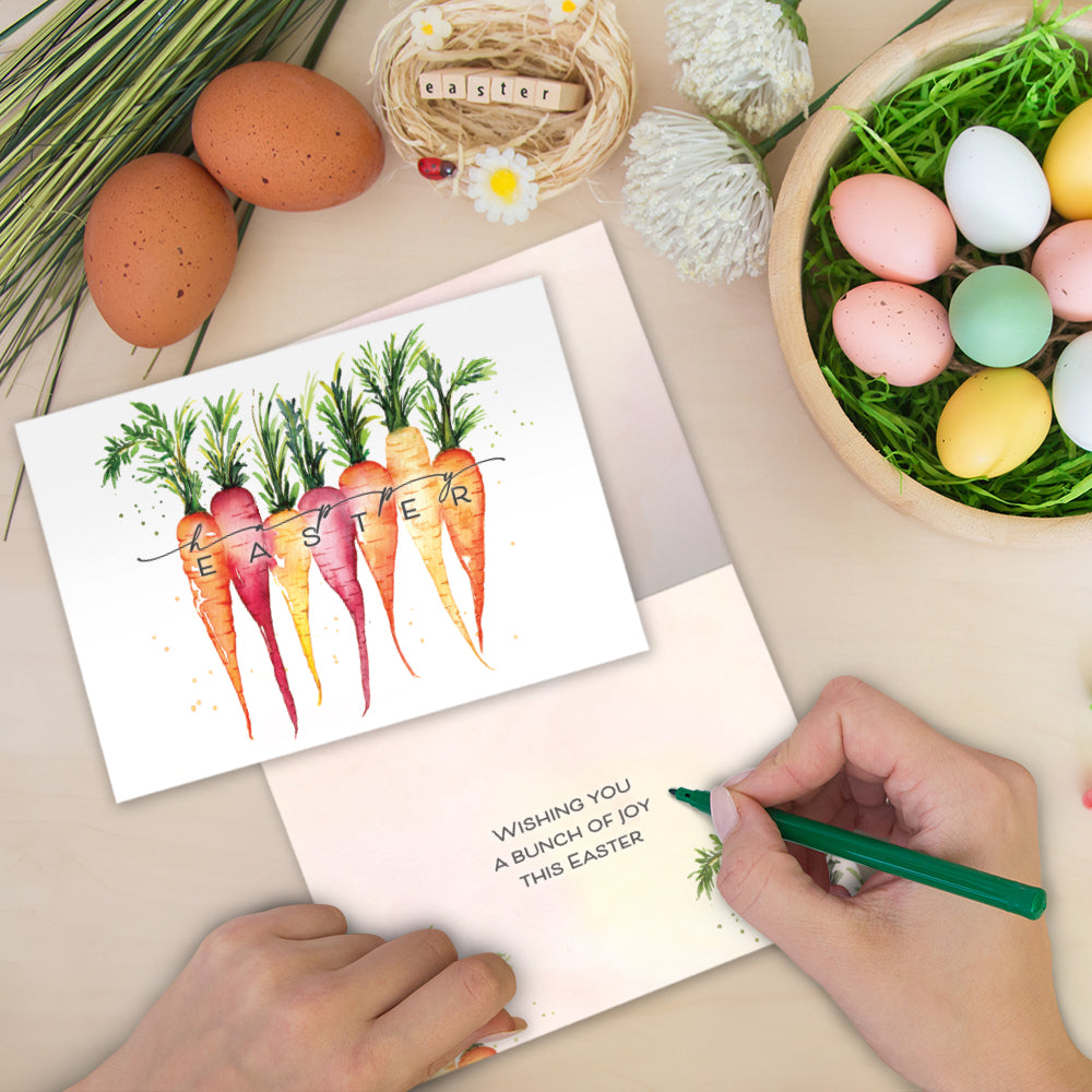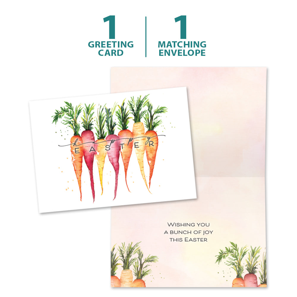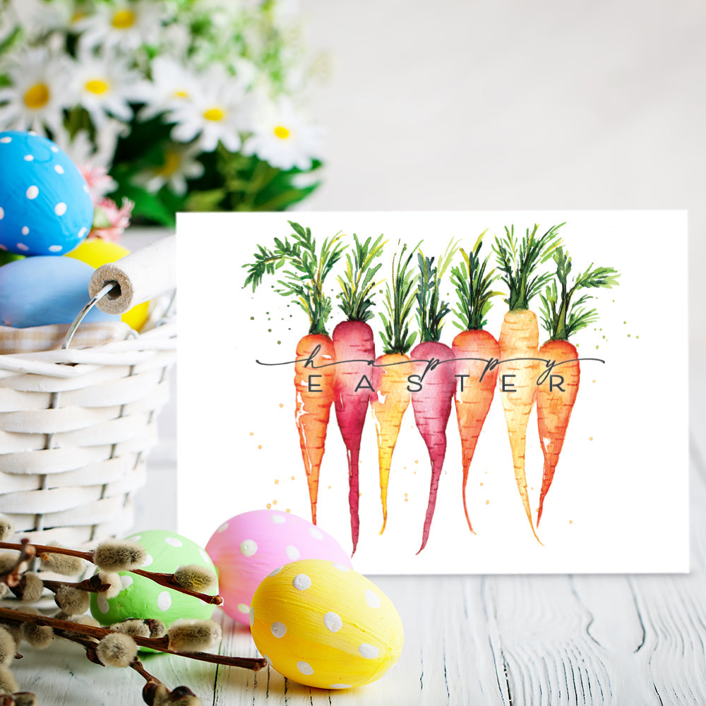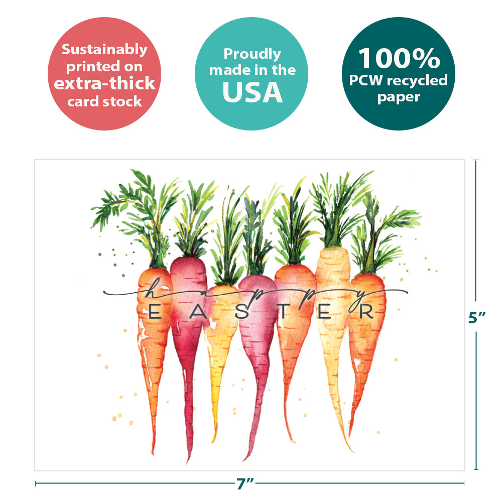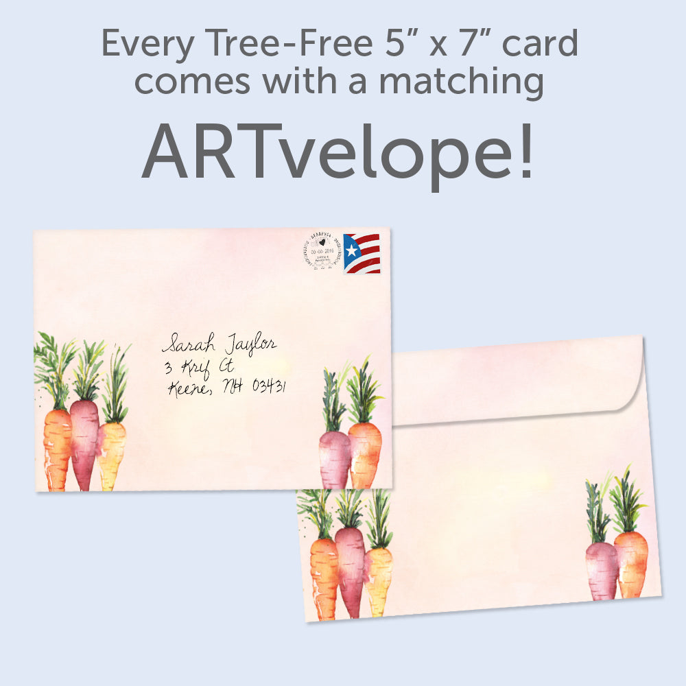 This Easter card set shares the message "Happy Easter" on the cover, and on the inside reads "Wishing you a bunch of joy this Easter". It features art by Maria Belen Galizzi and includes one 5 x 7 greeting card with a matching ARTvelope (all our 5 x 7 envelopes are designed to match the greeting card cover art). Printing powered by solar energy. 100% Post-consumer recycled. Proudly Made in the USA