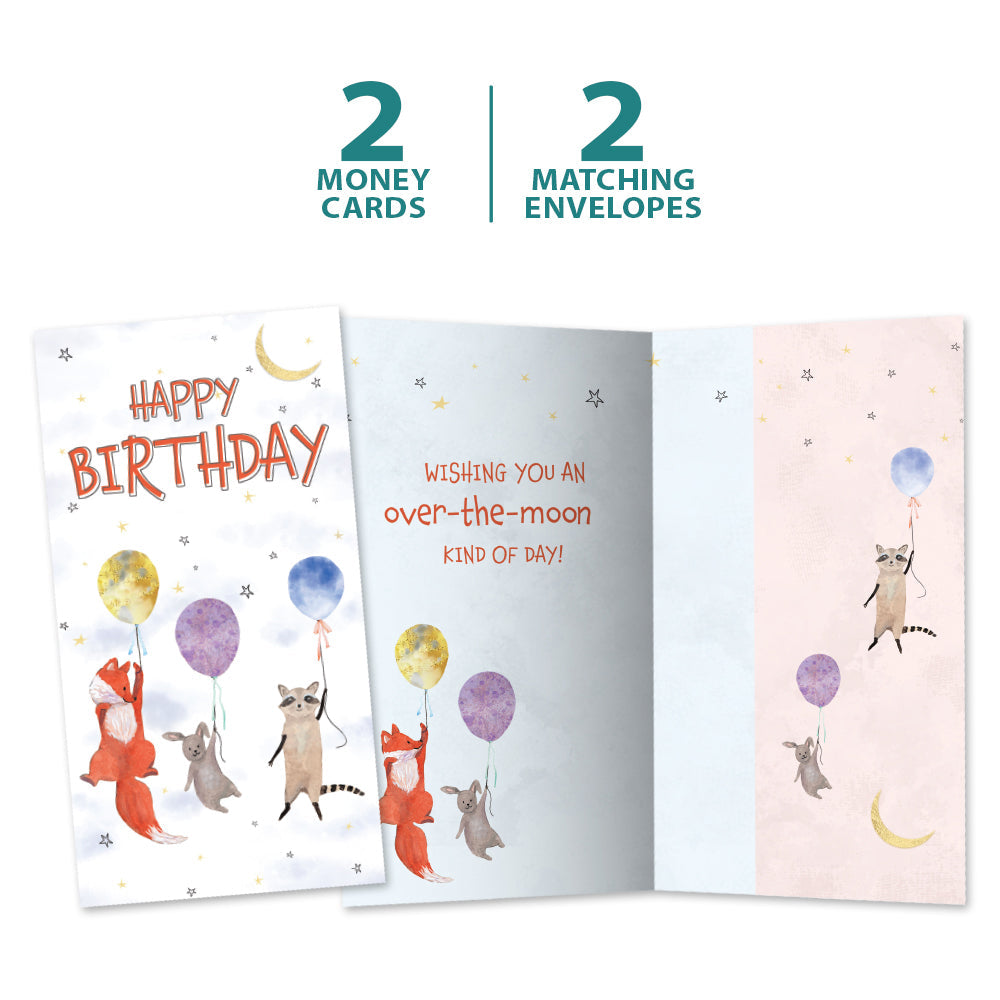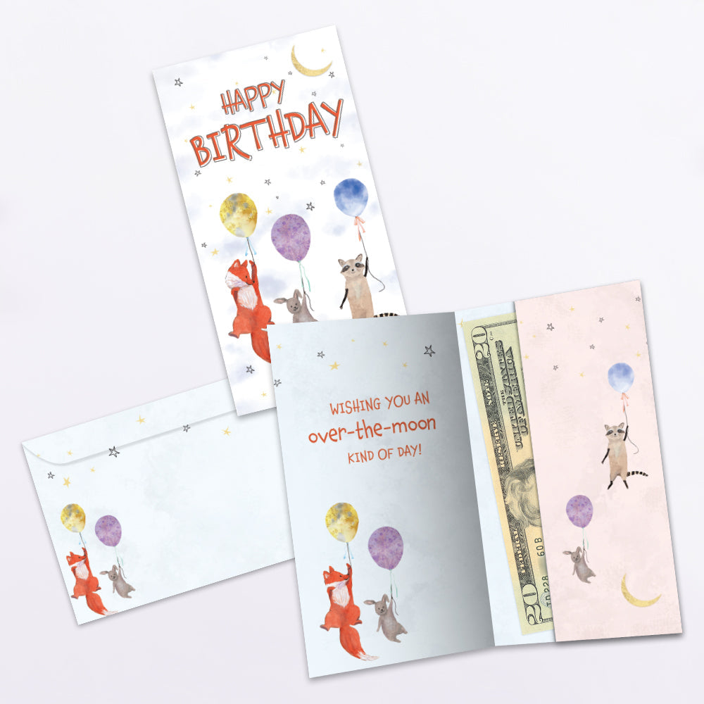 This Birthday money holder greeting card set shares the message "Happy birthday" on the cover, and on the inside reads "Wishing you an over-the-moon kind of day!". It features art by Tina van Dijk and includes two 3.7 x 7 money holder greeting cards with matching ARTvelope (all our 3.7 x 7 envelopes are designed to match the greeting card cover art). Printing powered by solar energy. 100% Post-consumer recycled. Proudly Made in the USA