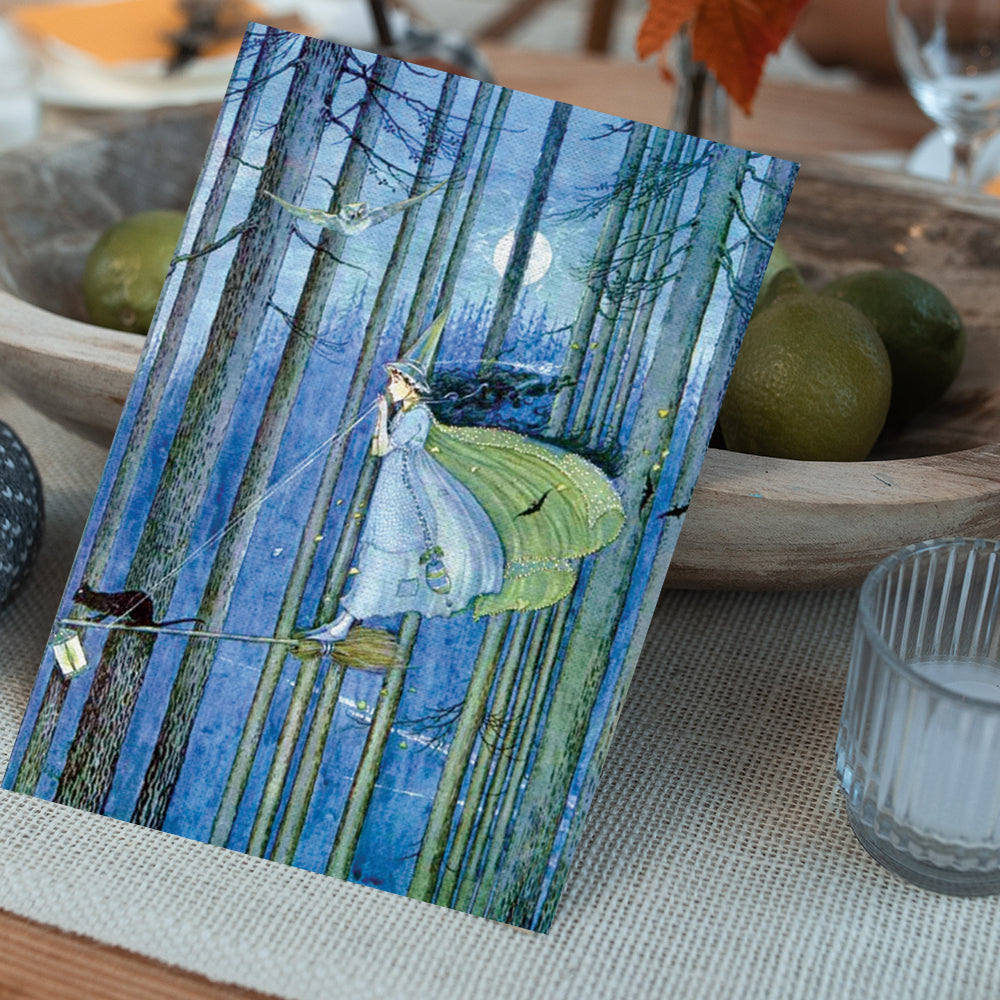 This 5 x 7 Halloween greeting card is blank on the cover, and on the inside shares the message "May all your Halloween witches come true!". It features art by Ida Rentoul Outhwaite, includes a fully printed matching ARTvelope, and is made from 100% post-consumer recycled material. Our printing processes are powered by solar energy and are proudly made in the USA. This is for a retail ready 4 Pack