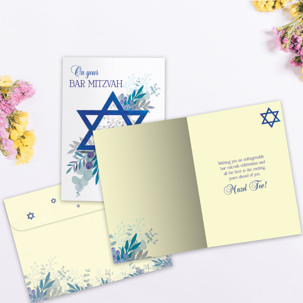 This Bar Mitzvah card set shares the message "On your bar mitzvah" on the cover, and on the inside reads "Wishing you an unforgettable bar mitzvah celebration and all the best in the exciting years ahead of you. Mazel tov!". It features art by Debbie Edwards and includes six 5 x 7 greeting cards with matching ARTvelopes (all our 5 x 7 envelopes are designed to match the greeting card cover art). Printing powered by solar energy. 100% Post-consumer recycled. Proudly Made in the USA