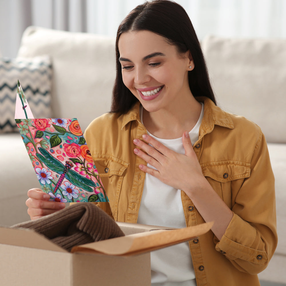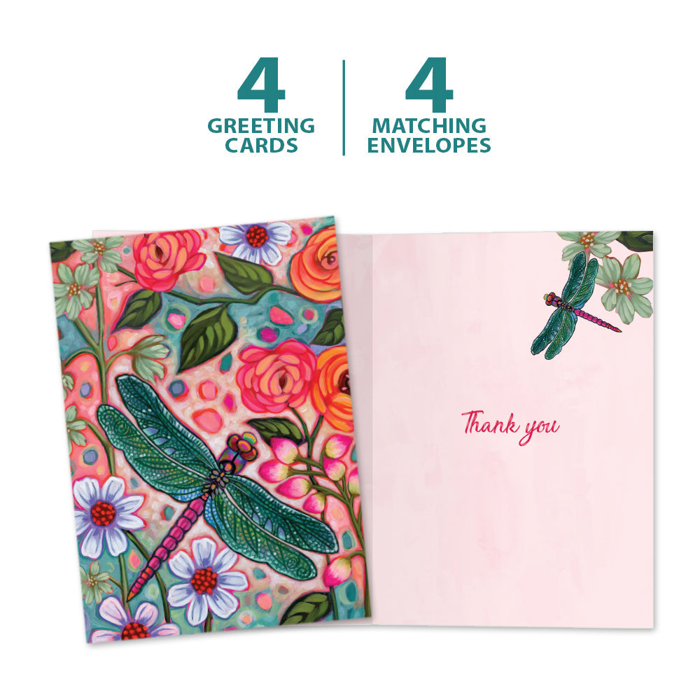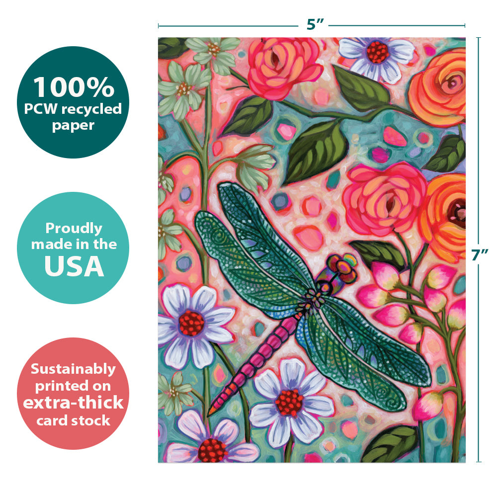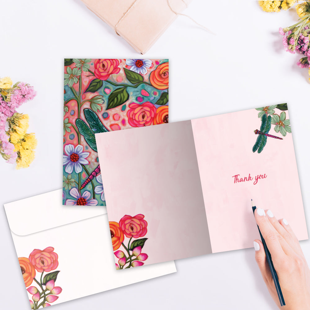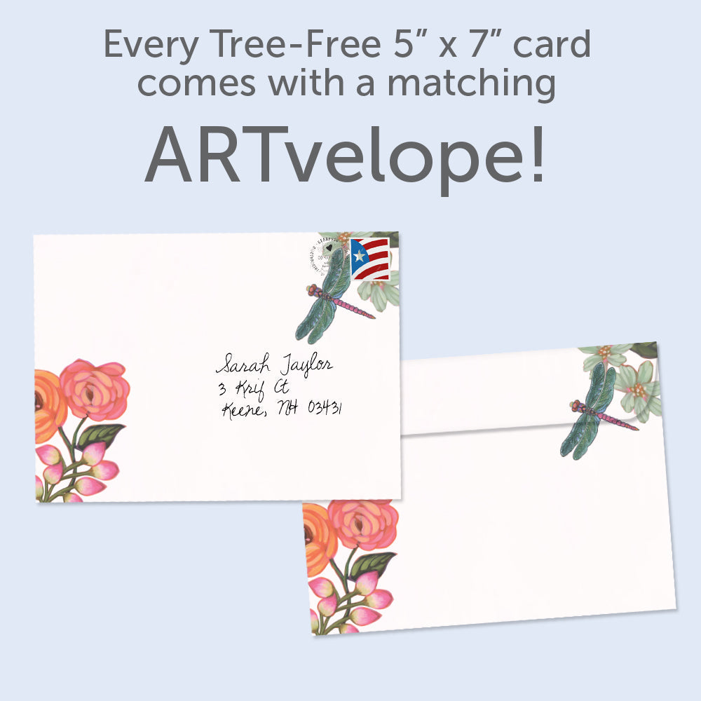 This Thank You card set is blank on the cover, and on the inside reads "Thank you". It features art by Peggy Davis and includes six 5 x 7 greeting cards with matching ARTvelopes (all our 5 x 7 envelopes are designed to match the greeting card cover art). Printing powered by solar energy. 100% Post-consumer recycled. Proudly Made in the USA