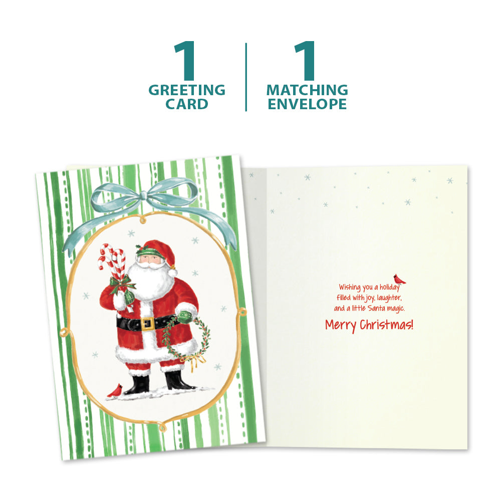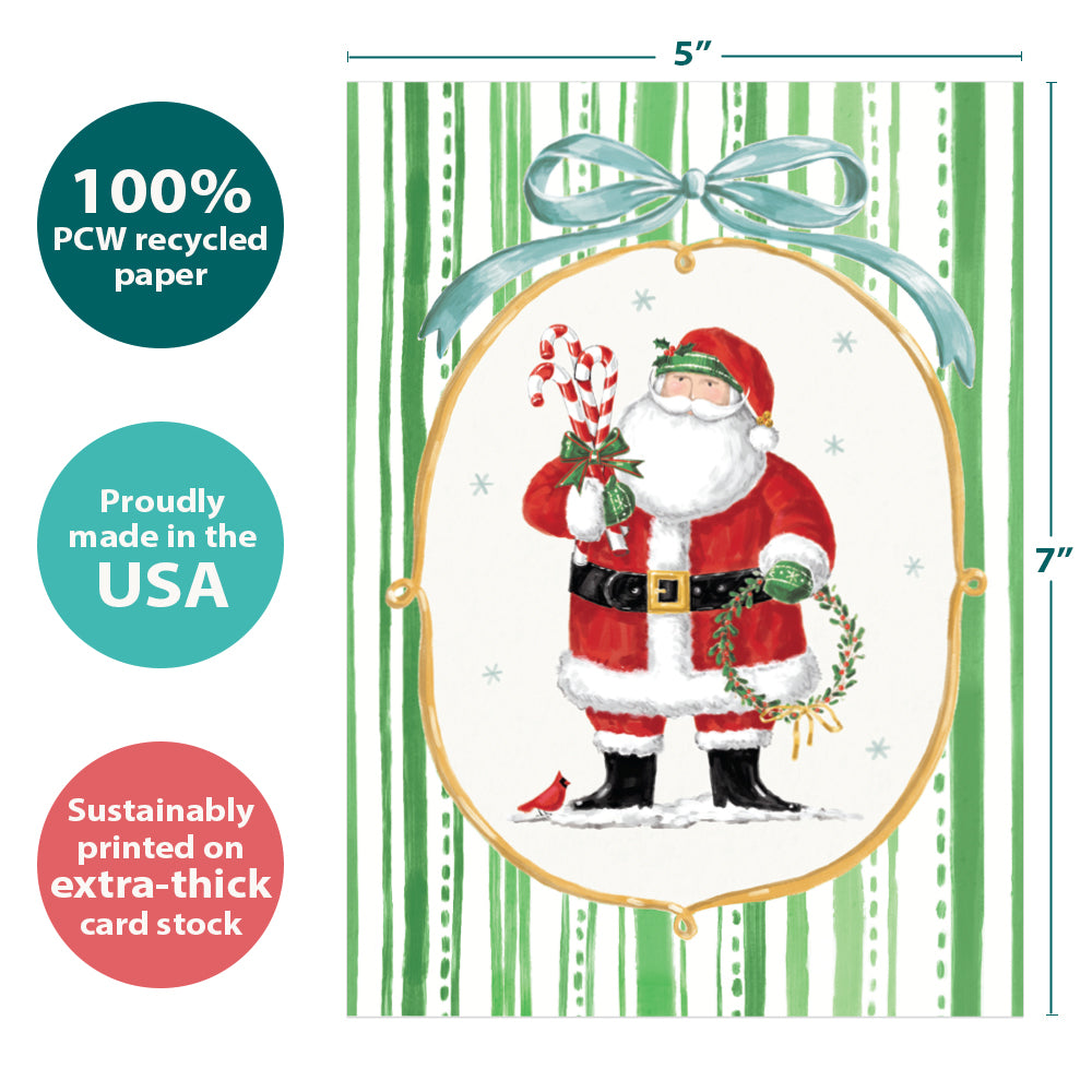 This Christmas card set is blank on the cover, and on the inside reads "Wishing you a holiday filled with joy, laughter, and a little Santa magic. Merry Christmas!". It features art by Anne Tavoletti and includes one 5 x 7 greeting card with a matching ARTvelope (all our 5 x 7 envelopes are designed to match the greeting card cover art). Printing powered by solar energy. 100% Post-consumer recycled. Proudly Made in the USA