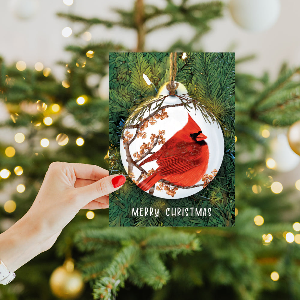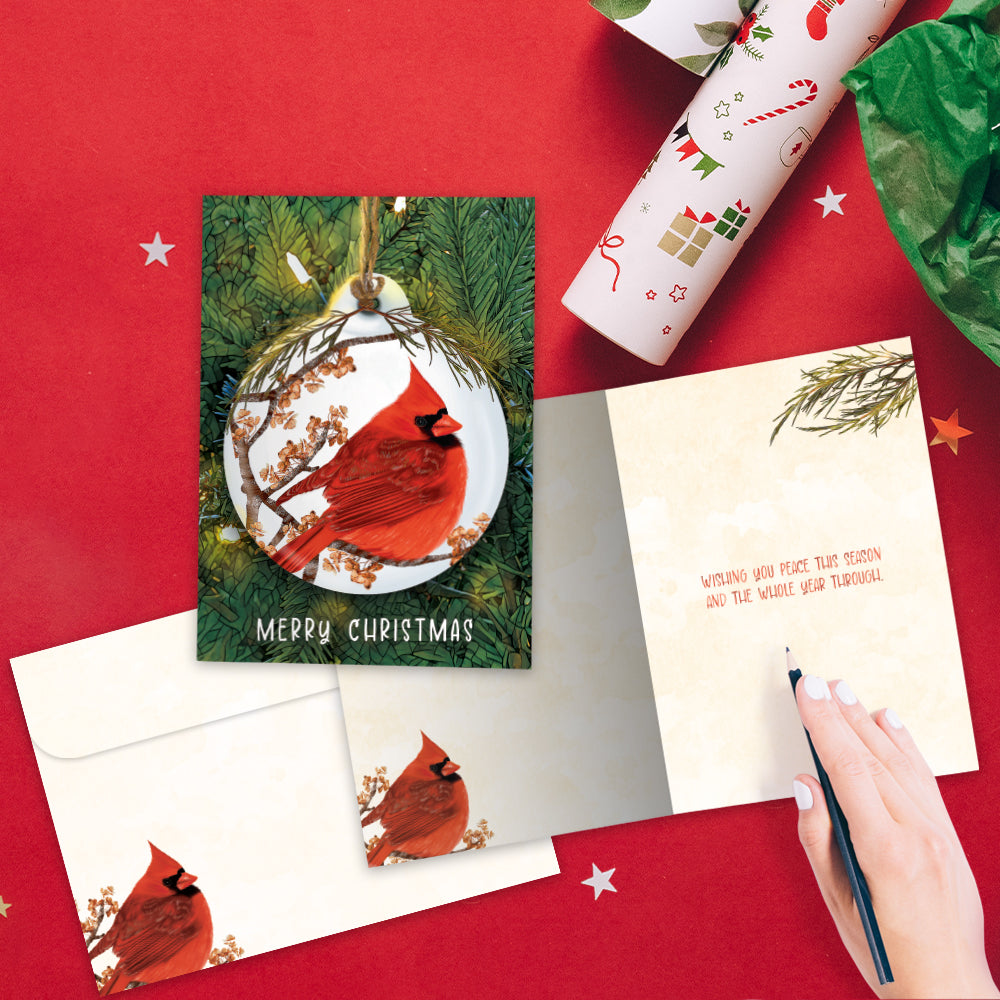 This Christmas card set shares the message "Merry Christmas" on the cover, and on the inside reads "Wishing you peace this season and the whole year through". It features art by Jessica Chaves and includes sixteen 5 x 7 greeting cards with matching ARTvelopes (all our 5 x 7 envelopes are designed to match the greeting card cover art). Printing powered by solar energy. 100% Post-consumer recycled. Proudly Made in the USA