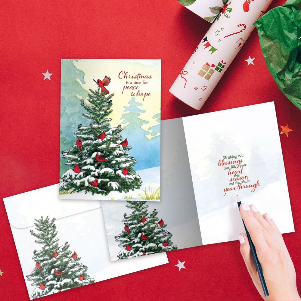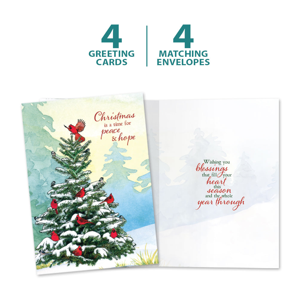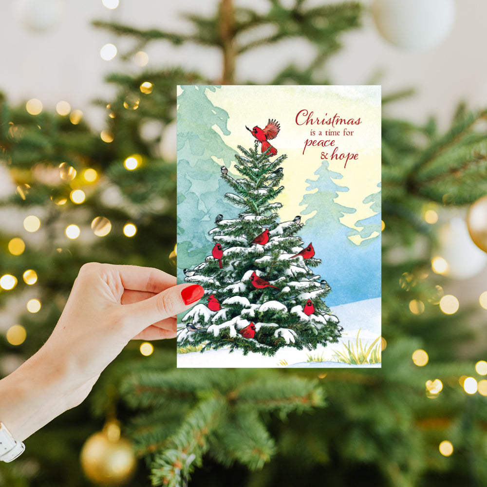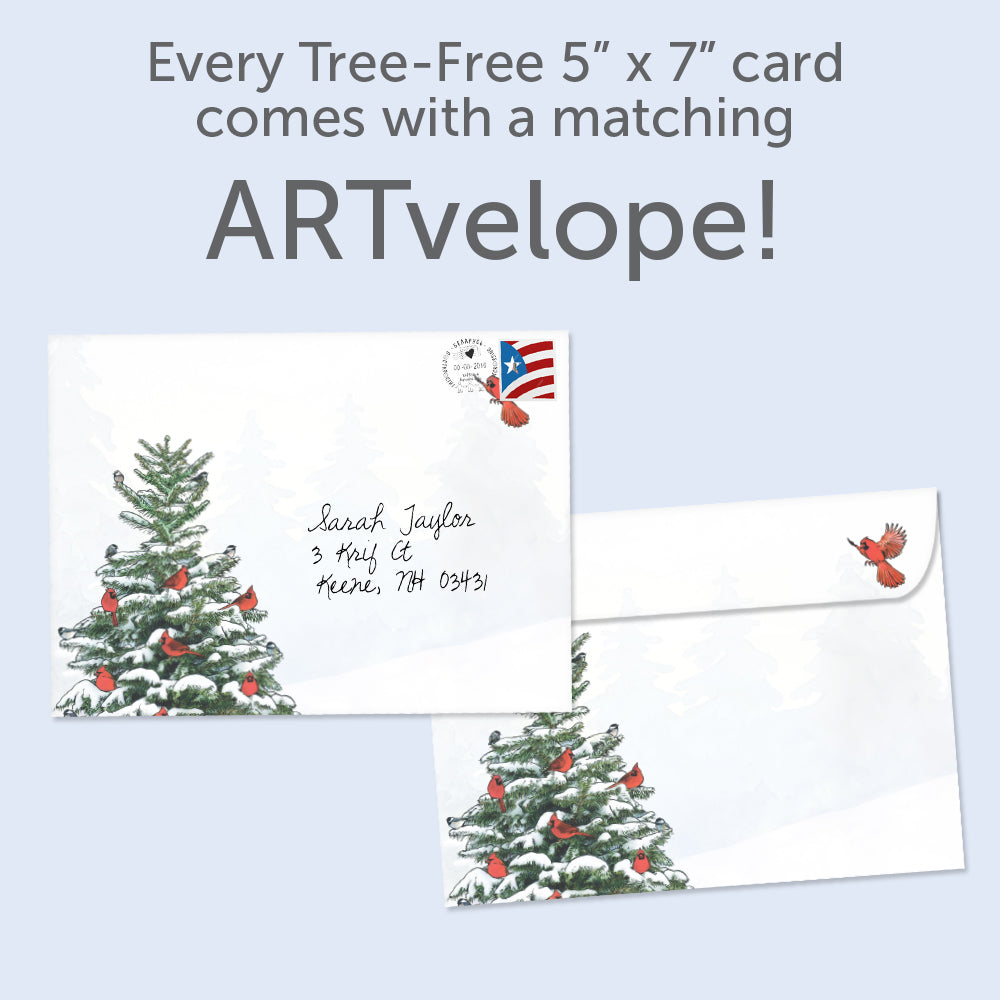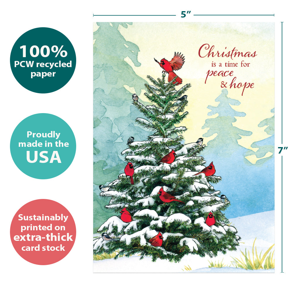 This Christmas card set shares the message "Christmas is a time for peace and hope" on the cover, and on the inside reads "Wishing you blessings that fill your heart this season and the whole year through". It features art by Shawn Braley and includes four 5 x 7 greeting cards with matching ARTvelopes (all our 5 x 7 envelopes are designed to match the greeting card cover art). Printing powered by solar energy. 100% Post-consumer recycled. Proudly Made in the USA
