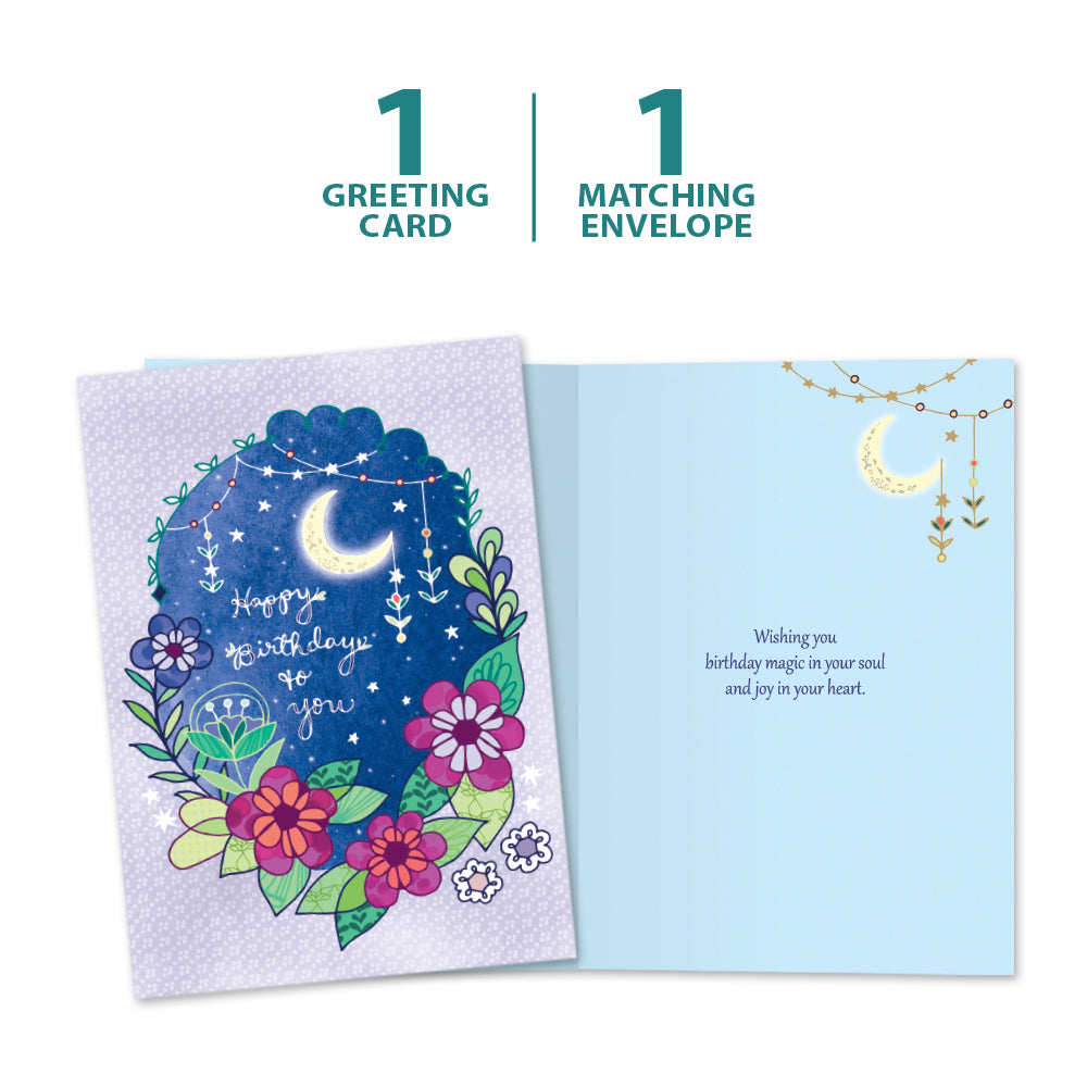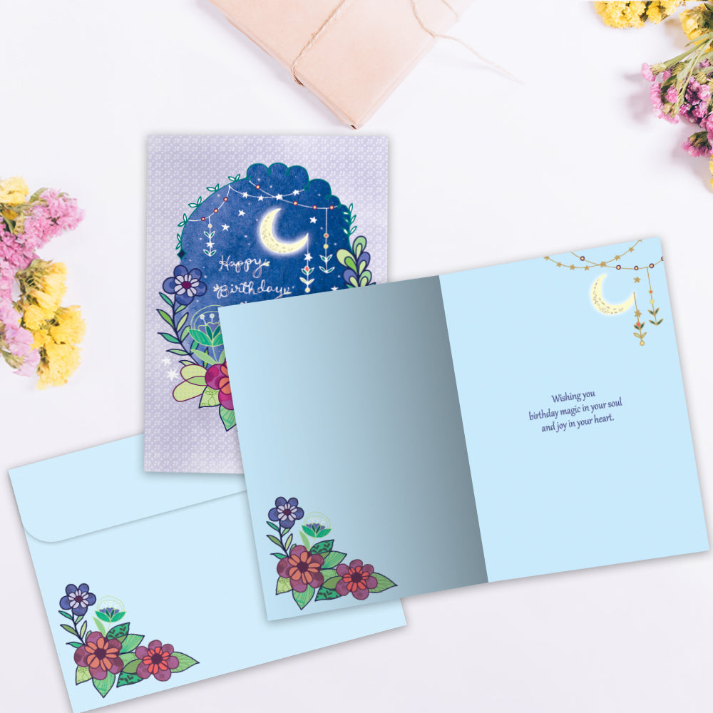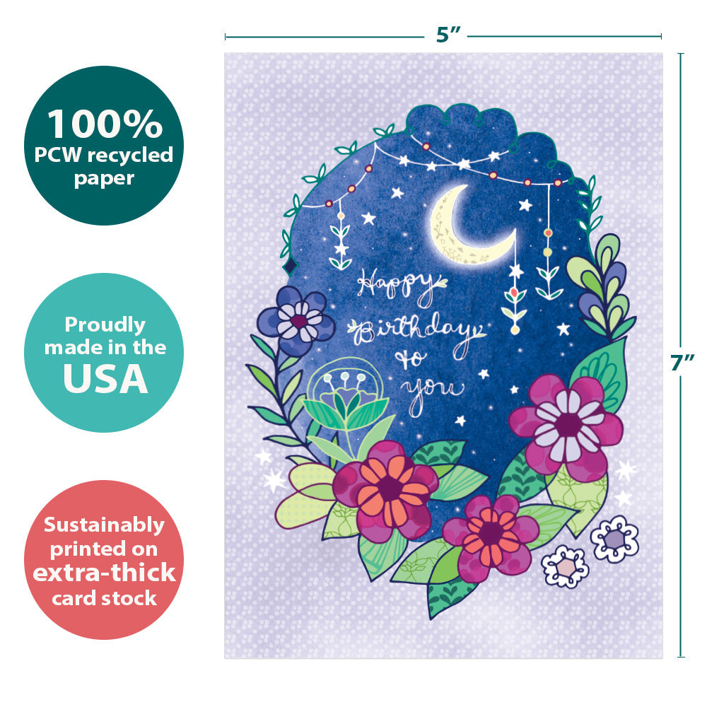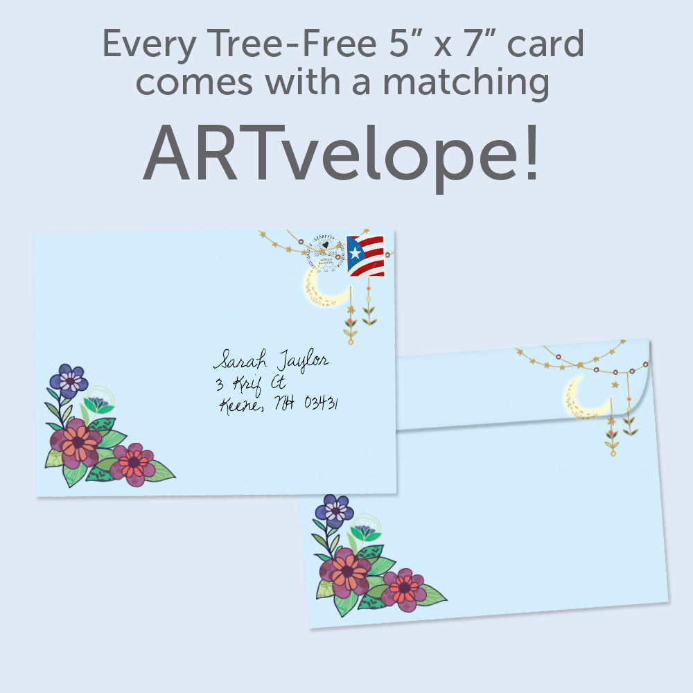 This Birthday card set shares the message "Happy birthday to you" on the cover, and on the inside reads "Wishing you birthday magic in your soul and joy in your heart". It features art by Cindy LaColla and includes one 5 x 7 greeting card with a matching ARTvelope (all our 5 x 7 envelopes are designed to match the greeting card cover art). Printing powered by solar energy. 100% Post-consumer recycled. Proudly Made in the USA