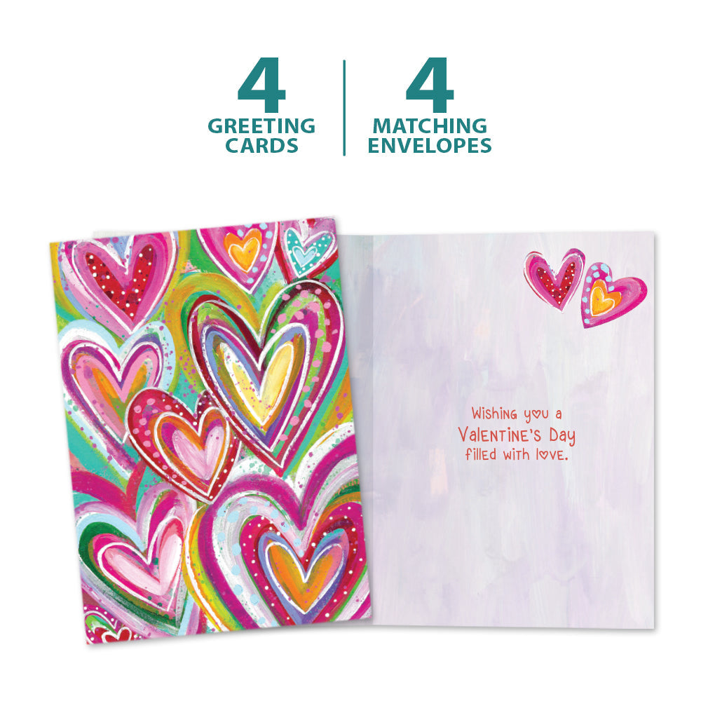 This Valentine's Day card set is blank on the cover, and on the inside reads "Wishing you a Valentine's Day filled with love". It features art by Bethany Joy and includes four 5 x 7 greeting cards with matching ARTvelopes (all our 5 x 7 envelopes are designed to match the greeting card cover art). Printing powered by solar energy. 100% Post-consumer recycled. Proudly Made in the USA
