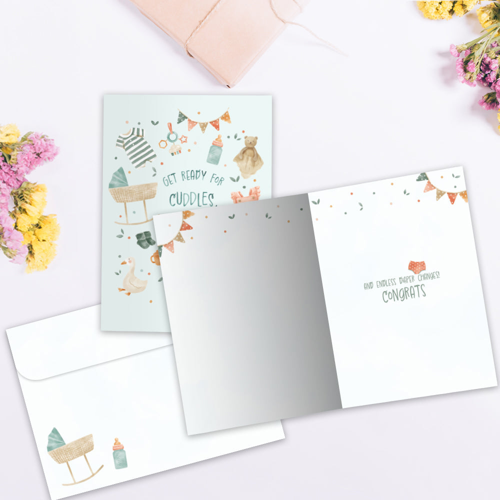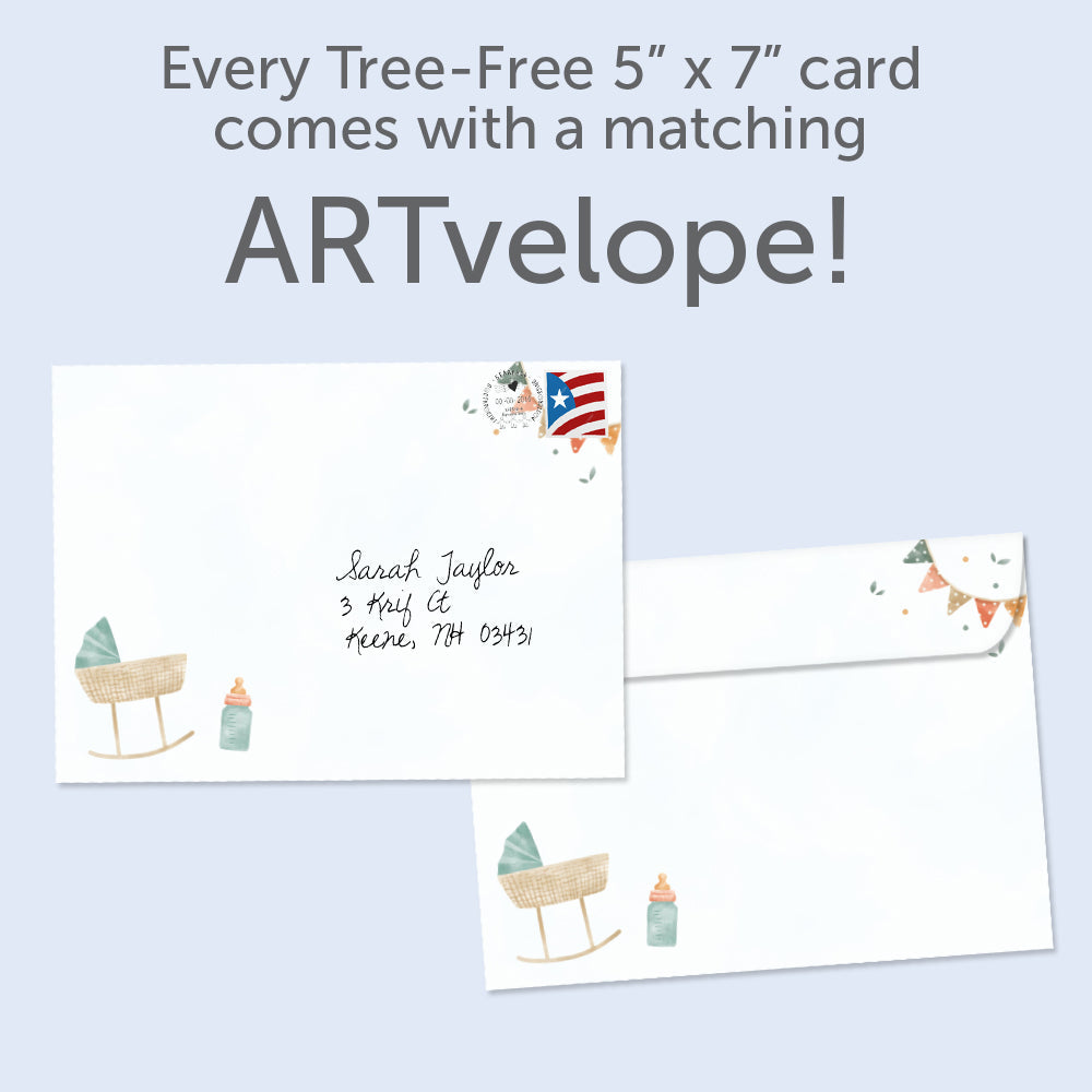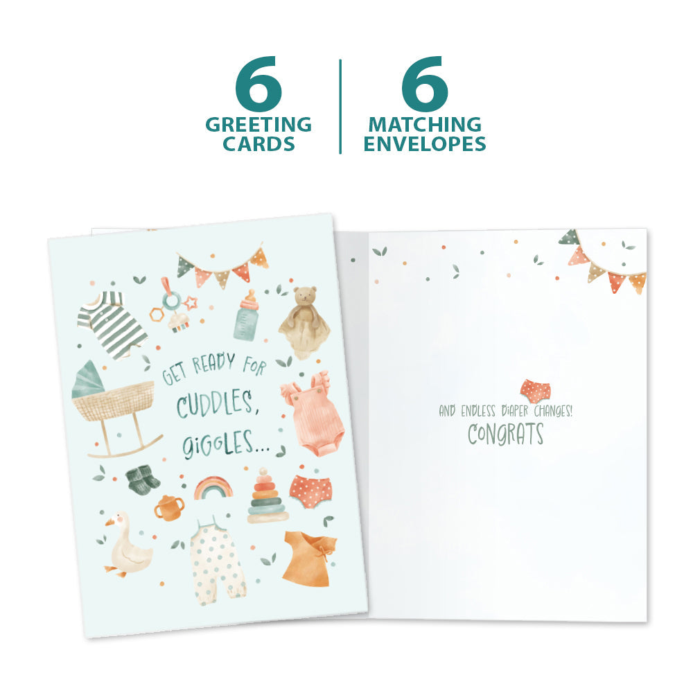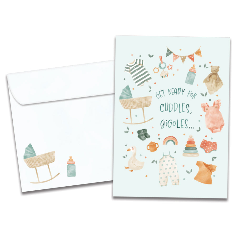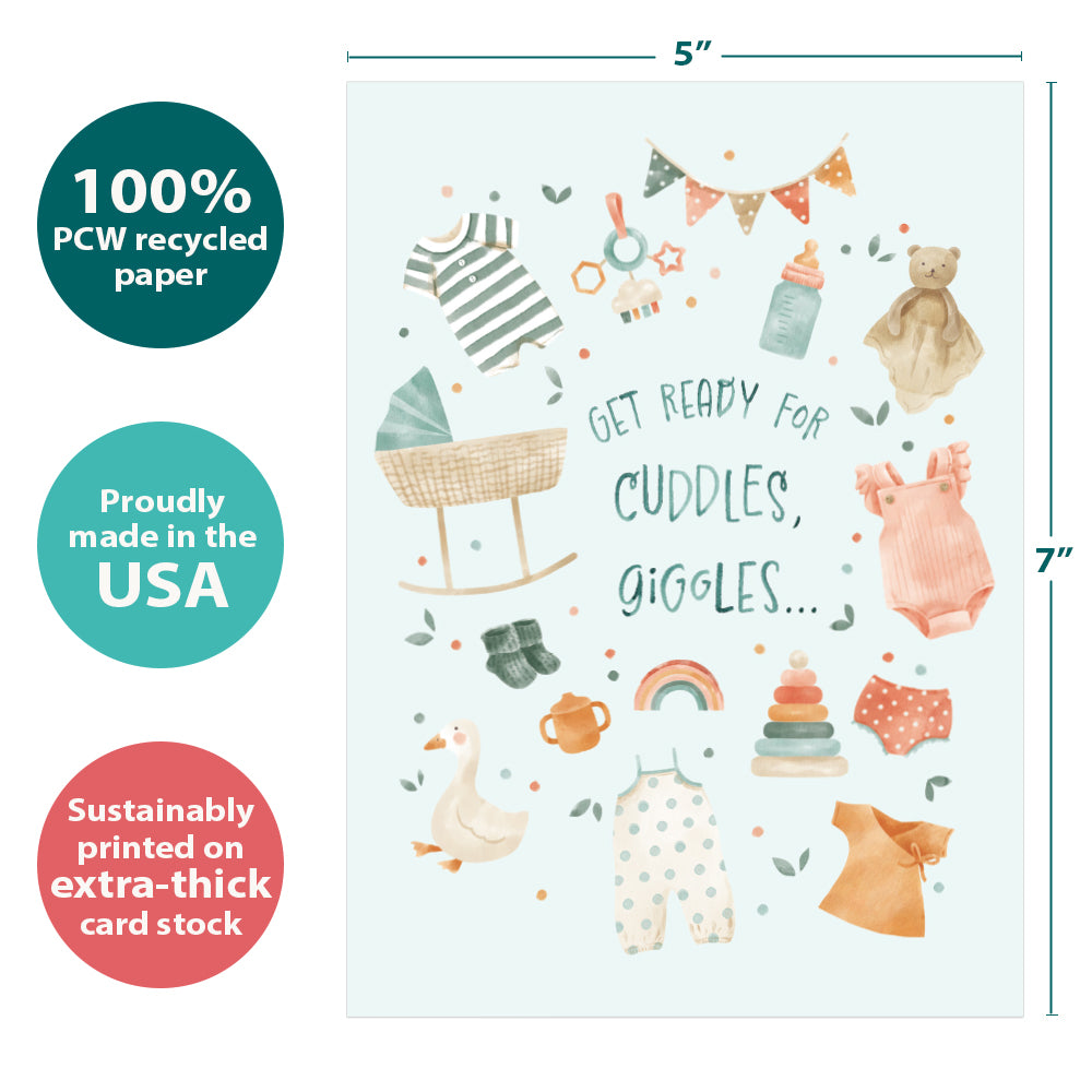 This New Baby card set shares the message "Get ready for cuddles, giggles..." on the cover, and on the inside reads "And endless diaper changes. Congrats!". It features art by Wendy Deubert and includes six 5 x 7 greeting cards with matching ARTvelopes (all our 5 x 7 envelopes are designed to match the greeting card cover art). Printing powered by solar energy. 100% Post-consumer recycled. Proudly Made in the USA