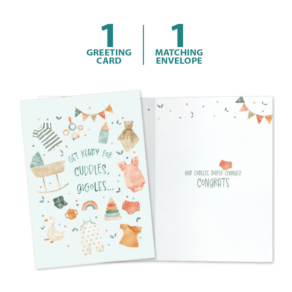 This New Baby card set shares the message "Get ready for cuddles, giggles..." on the cover, and on the inside reads "And endless diaper changes. Congrats!". It features art by Wendy Deubert and includes one 5 x 7 greeting card with a matching ARTvelope (all our 5 x 7 envelopes are designed to match the greeting card cover art). Printing powered by solar energy. 100% Post-consumer recycled. Proudly Made in the USA