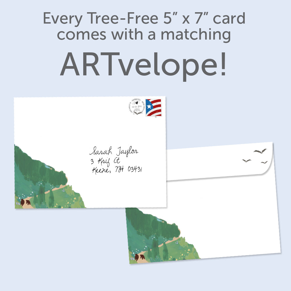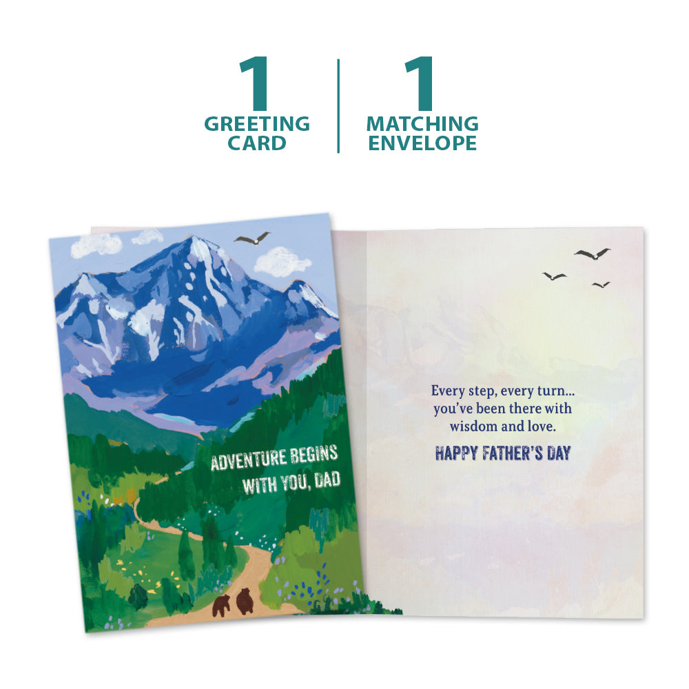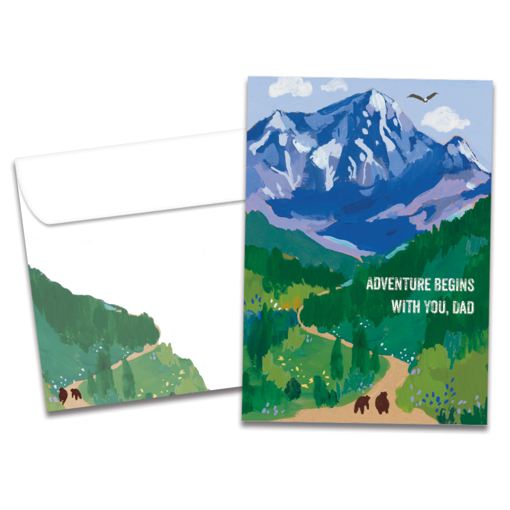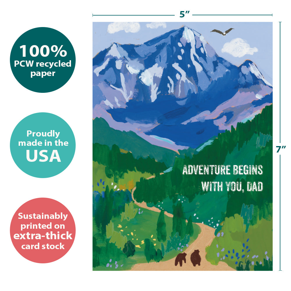 This Father's Day card set shares the message "Adventure begins with you, Dad" on the cover, and on the inside reads "Every step, every turn...you’ve been there with wisdom and love. Happy Father’s Day". It features art by Sharon Montgomery and includes one 5 x 7 greeting card with a matching ARTvelope (all our 5 x 7 envelopes are designed to match the greeting card cover art). Printing powered by solar energy. 100% Post-consumer recycled. Proudly Made in the USA