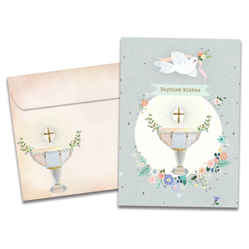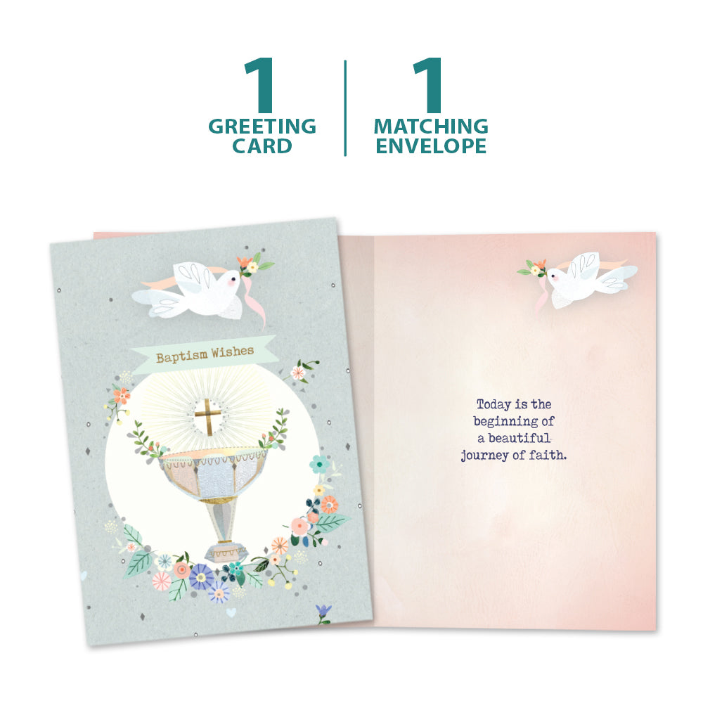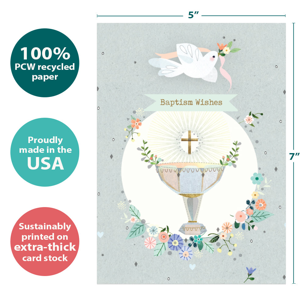 This Baptism card set shares the message "Baptism wishes" on the cover, and on the inside reads "Today is the beginning of a beautiful journey of faith". It features art by Lynn Horrabin and includes one 5 x 7 greeting card with a matching ARTvelope (all our 5 x 7 envelopes are designed to match the greeting card cover art). Printing powered by solar energy. 100% Post-consumer recycled. Proudly Made in the USA