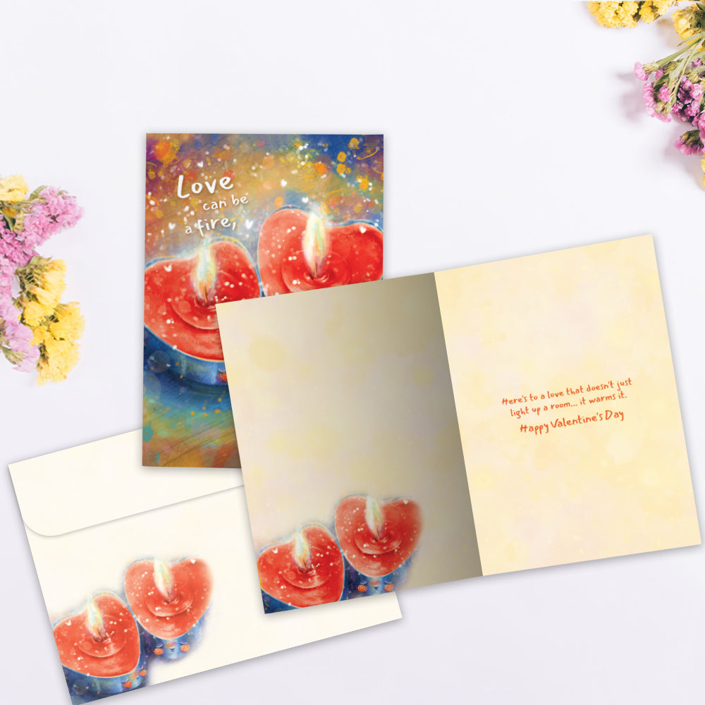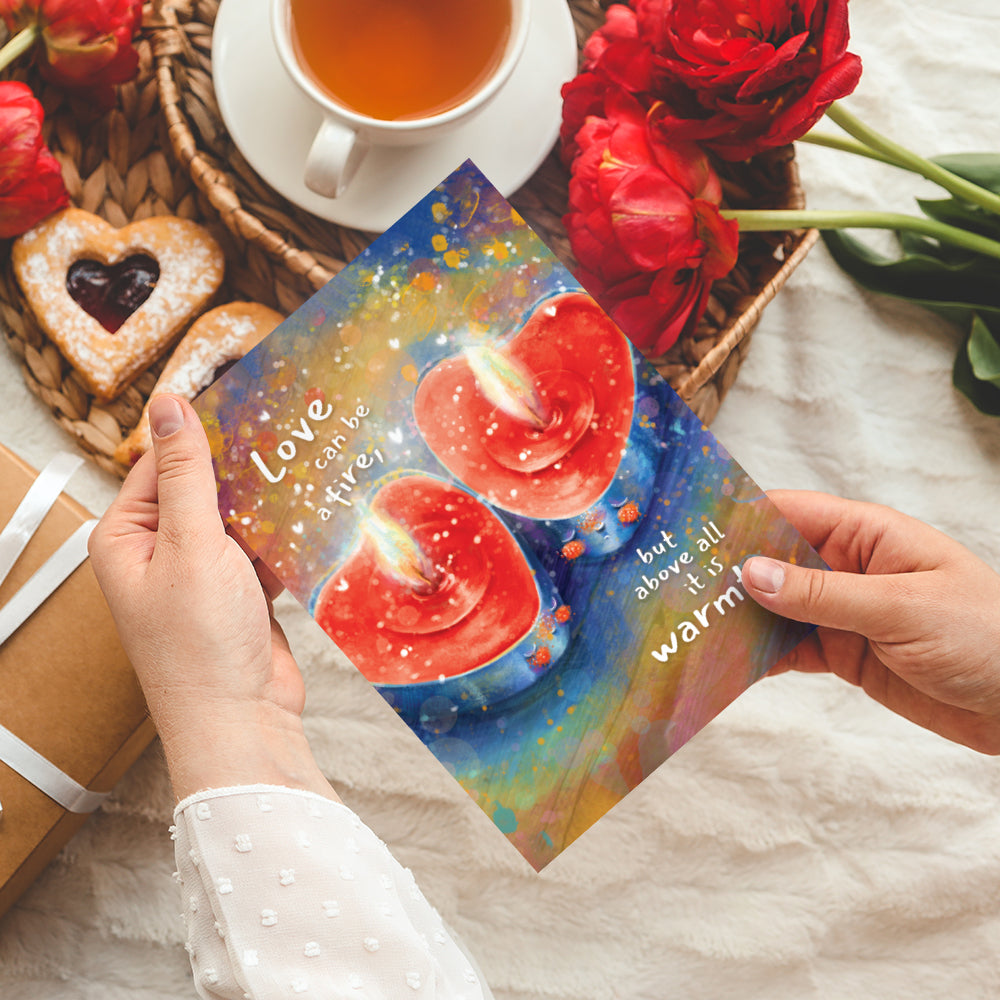 This Valentine's Day card set shares the message "Love can be a fire, but above all it is warmth" on the cover, and on the inside reads "Here's to a love that doesn't just light up a room...it warms it. Happy Valentine's Day ". It features art by Anna Świetlik-Horodecka and includes four 5 x 7 greeting cards with matching ARTvelopes (all our 5 x 7 envelopes are designed to match the greeting card cover art). Printing powered by solar energy. 100% Post-consumer recycled. Proudly Made in the USA