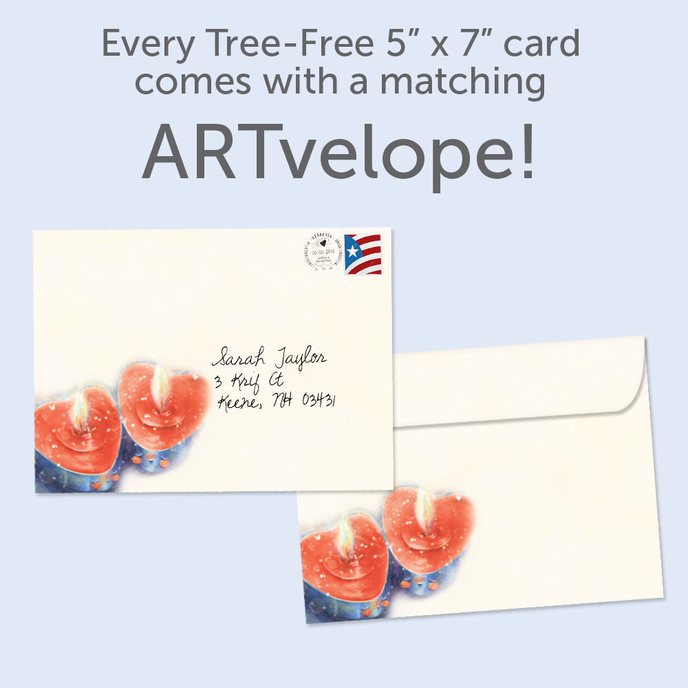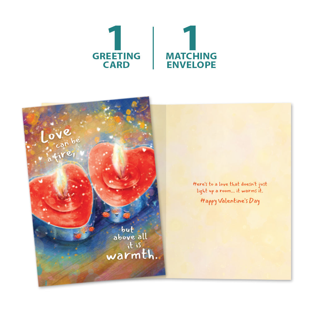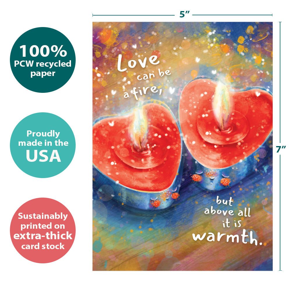 This Valentine's Day card set shares the message "Love can be a fire, but above all it is warmth" on the cover, and on the inside reads "Here's to a love that doesn't just light up a room...it warms it. Happy Valentine's Day ". It features art by Anna Świetlik-Horodecka and includes one 5 x 7 greeting card with a matching ARTvelope (all our 5 x 7 envelopes are designed to match the greeting card cover art). Printing powered by solar energy. 100% Post-consumer recycled. Proudly Made in the USA
