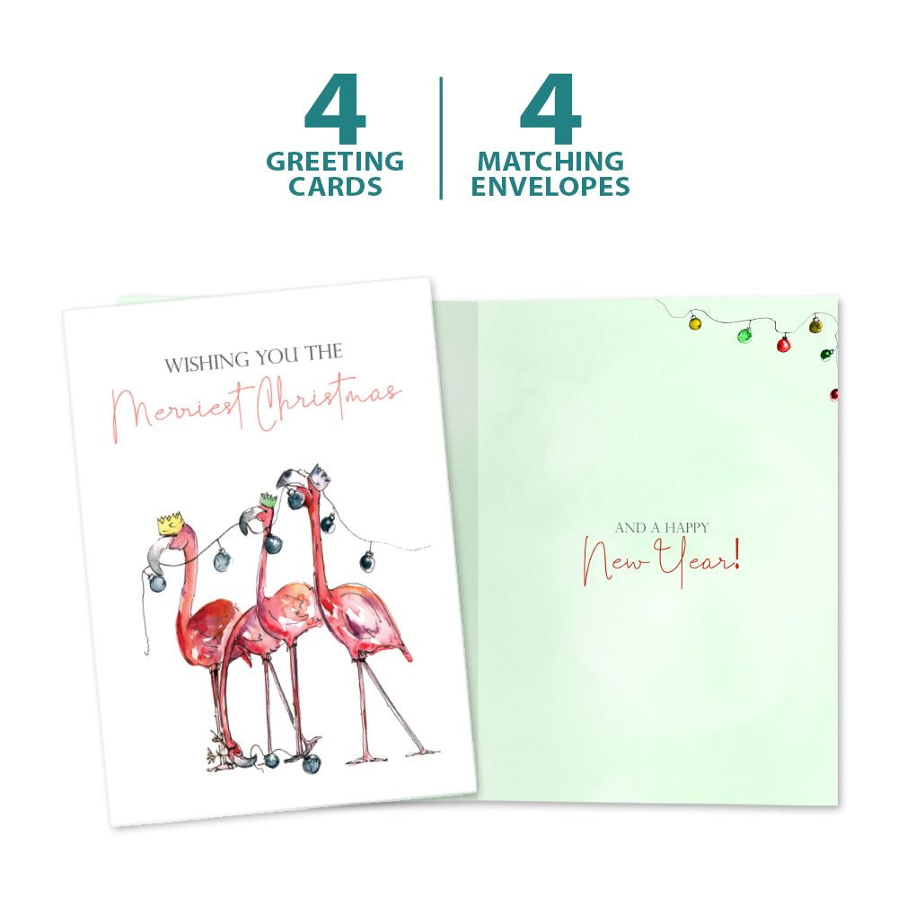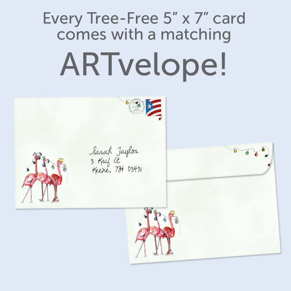 This Christmas card set shares the message "Wishing you the merriest Christmas" on the cover, and on the inside reads "And a happy new year!". It features art by Meg Hawkins and includes four 5 x 7 greeting cards with matching ARTvelopes (all our 5 x 7 envelopes are designed to match the greeting card cover art). Printing powered by solar energy. 100% Post-consumer recycled. Proudly Made in the USA