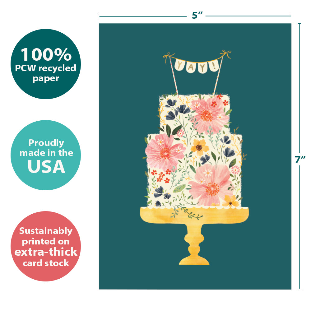 This Birthday card set shares the message "Yay!" on the cover, and on the inside reads "Happy birthday to someone worth celebrating every single day". It features art by Wendy Deubert and includes one 5 x 7 greeting card with a matching ARTvelope (all our 5 x 7 envelopes are designed to match the greeting card cover art). Printing powered by solar energy. 100% Post-consumer recycled. Proudly Made in the USA