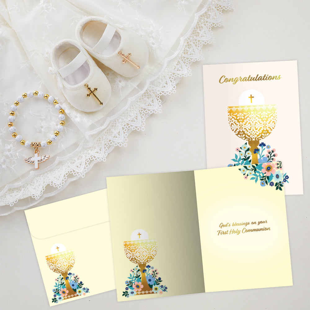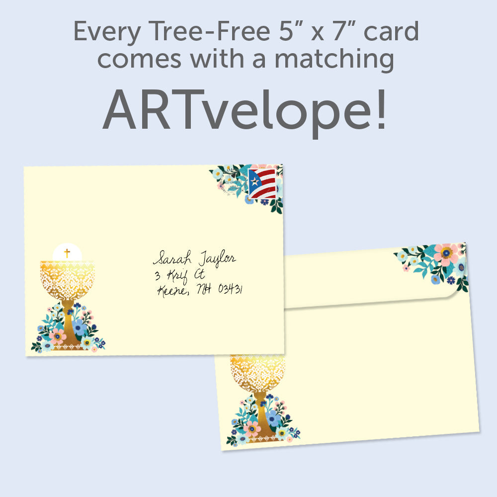 This First Communion card set shares the message "Congratulations" on the cover, and on the inside reads "God's blessings on your First Holy Communion". It features art by Jane Ryder-Gray and includes six 5 x 7 greeting cards with matching ARTvelopes (all our 5 x 7 envelopes are designed to match the greeting card cover art). Printing powered by solar energy. 100% Post-consumer recycled. Proudly Made in the USA