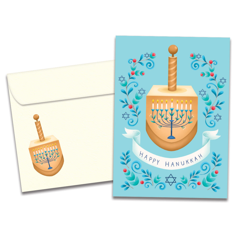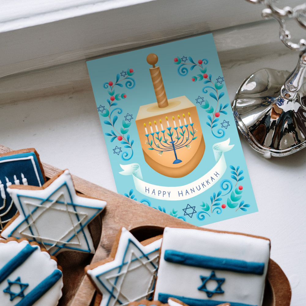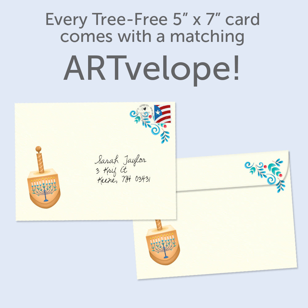 This Hanukkah card set shares the message "Happy Hanukkah" on the cover, and on the inside reads "Wishing you a season filled with light, love, and cherished traditions". It features art by Pimlada Phuapradit and includes one 5 x 7 greeting card with a matching ARTvelope (all our 5 x 7 envelopes are designed to match the greeting card cover art). Printing powered by solar energy. 100% Post-consumer recycled. Proudly Made in the USA