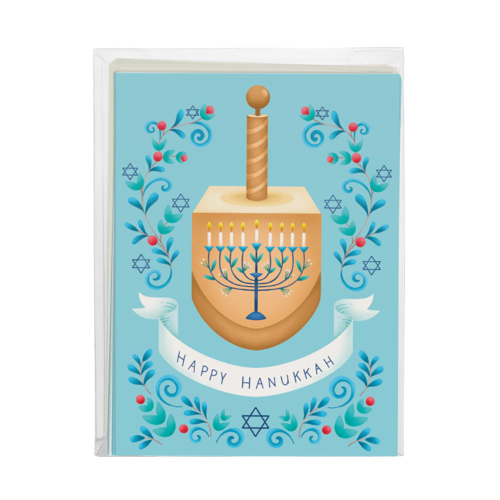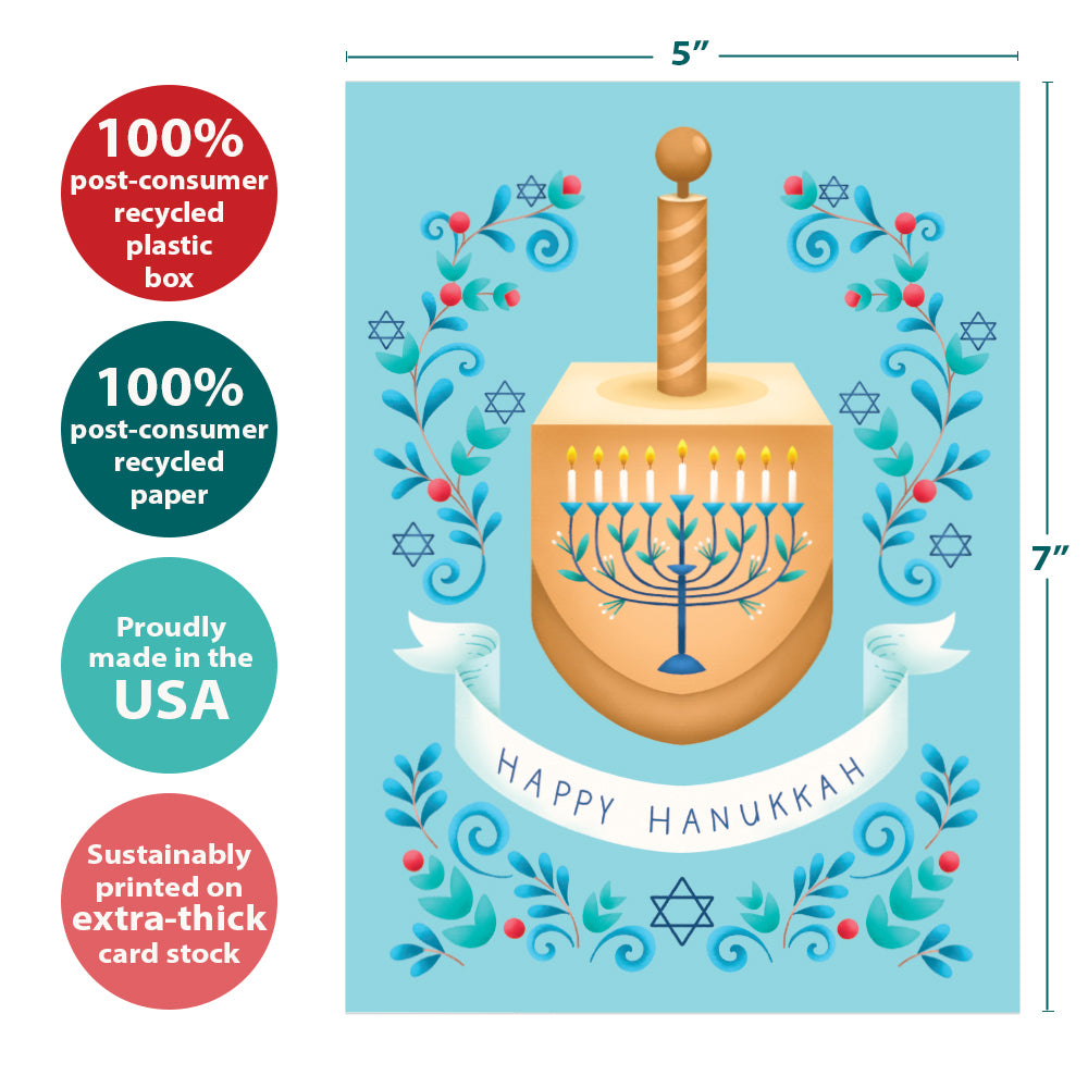 This Hanukkah card set shares the message "Happy Hanukkah" on the cover, and on the inside reads "Wishing you a season filled with light, love, and cherished traditions". It features art by Pimlada Phuapradit and includes sixteen 5 x 7 greeting cards with matching ARTvelopes (all our 5 x 7 envelopes are designed to match the greeting card cover art). Printing powered by solar energy. 100% Post-consumer recycled. Proudly Made in the USA