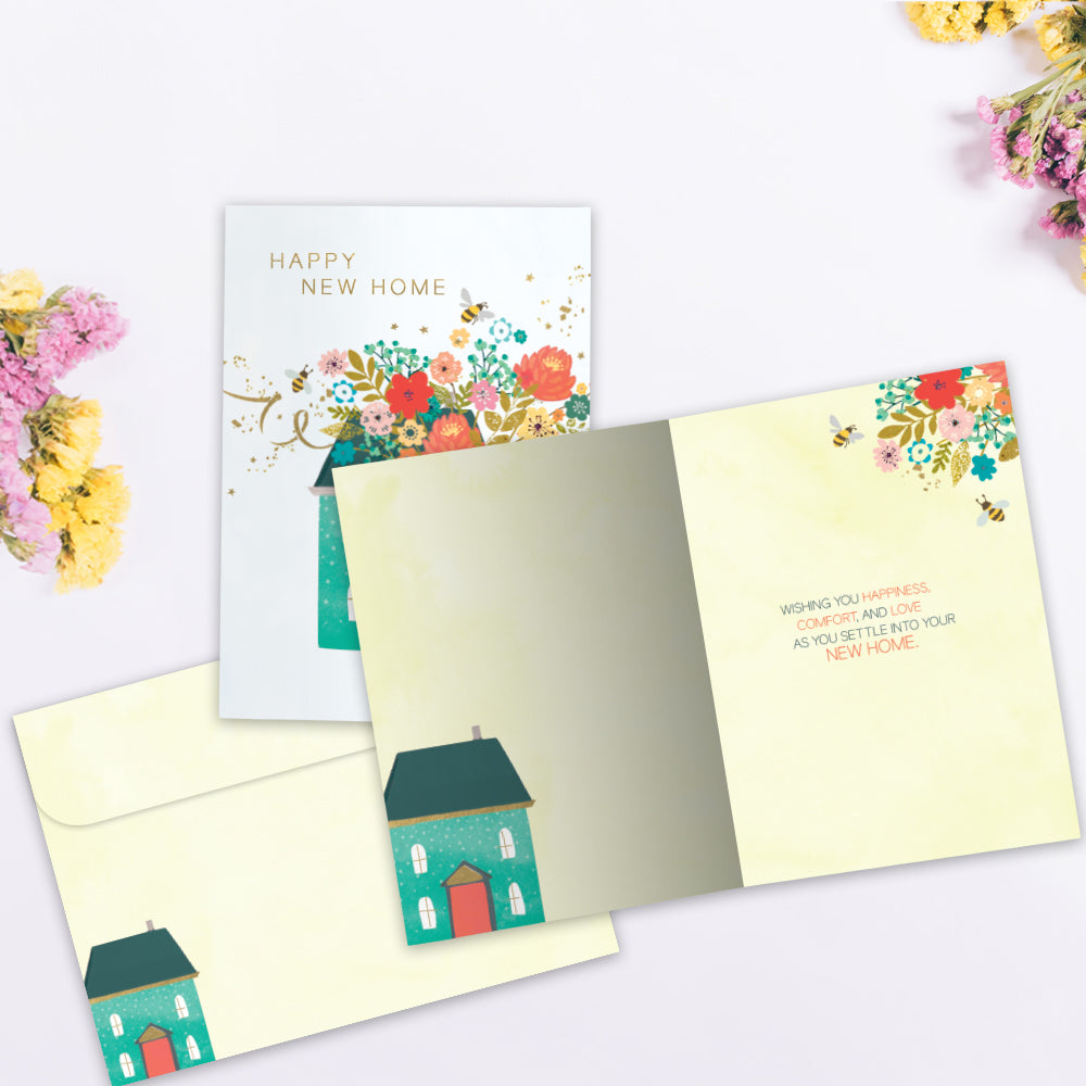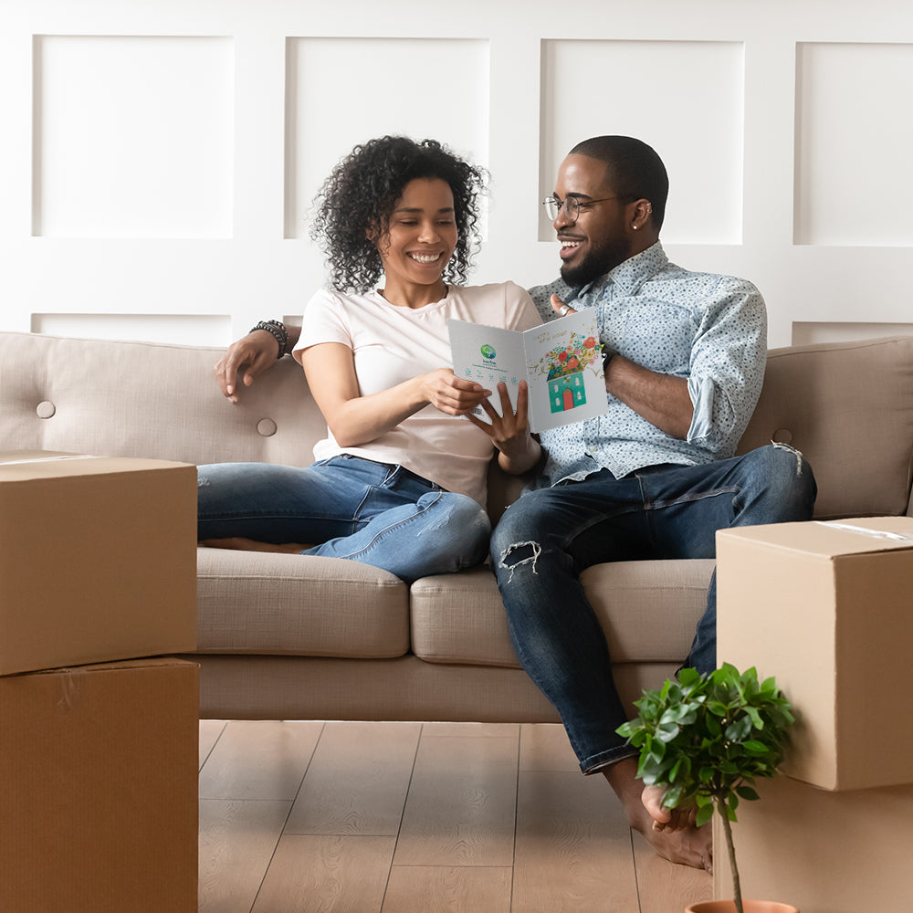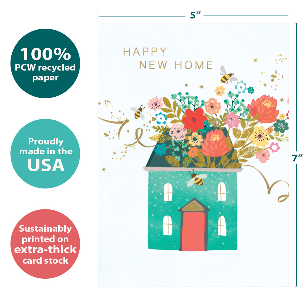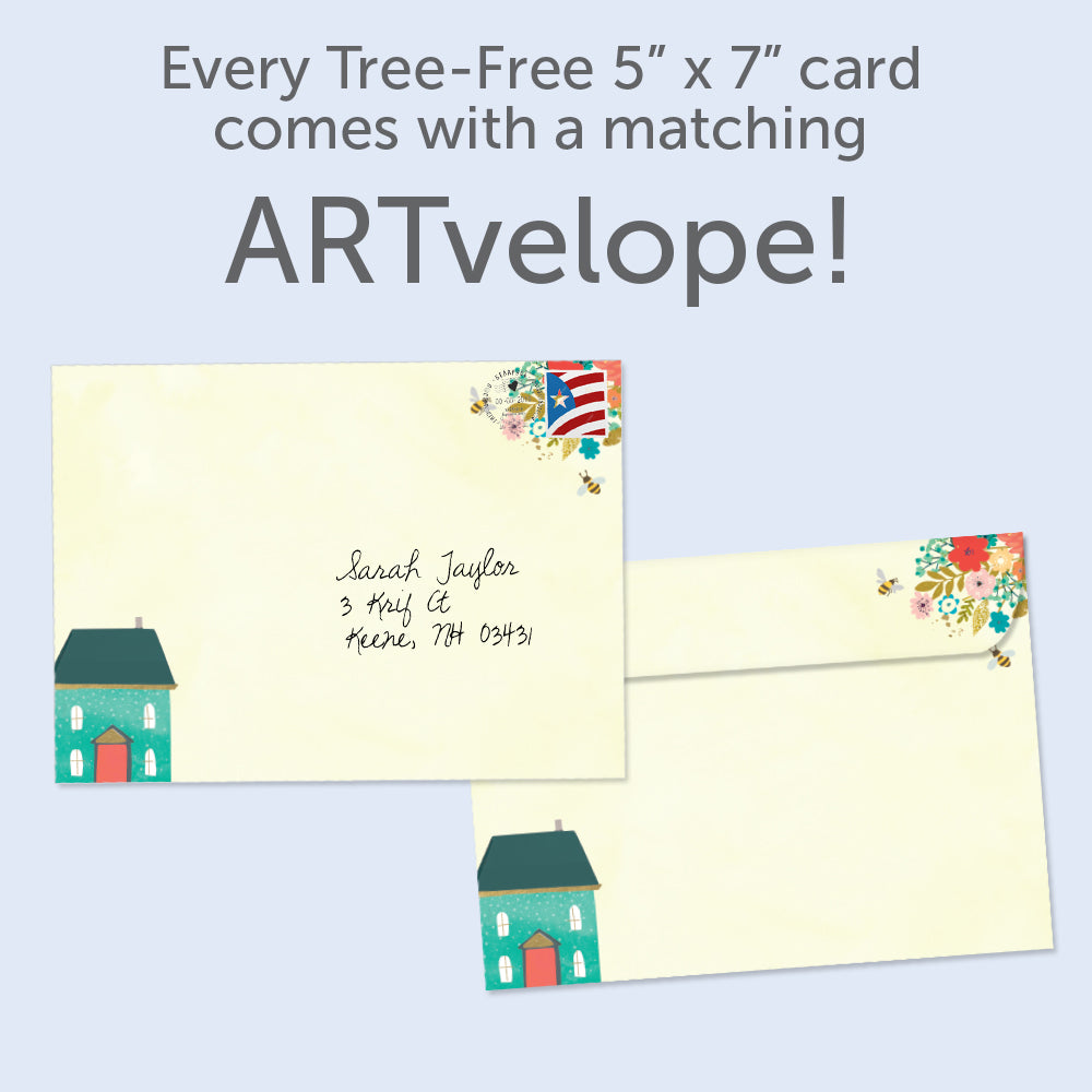 This New Home card set shares the message "Happy new home" on the cover, and on the inside reads "Wishing you happiness, comfort, and love as you settle into your new home". It features art by Hammond Gower Publications and includes six 5 x 7 greeting cards with matching ARTvelopes (all our 5 x 7 envelopes are designed to match the greeting card cover art). Printing powered by solar energy. 100% Post-consumer recycled. Proudly Made in the USA