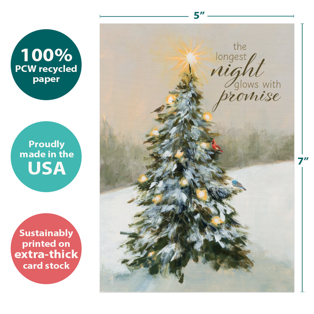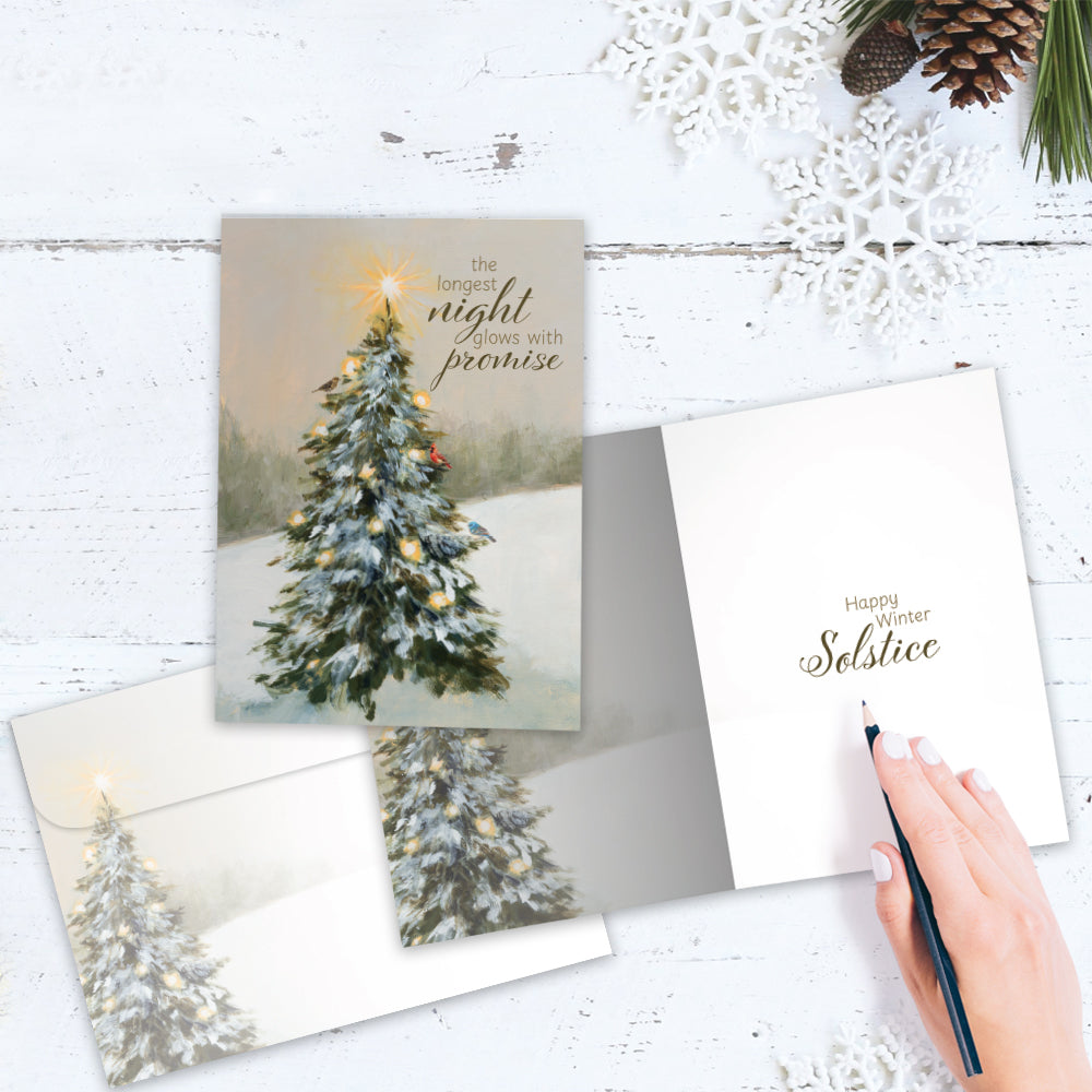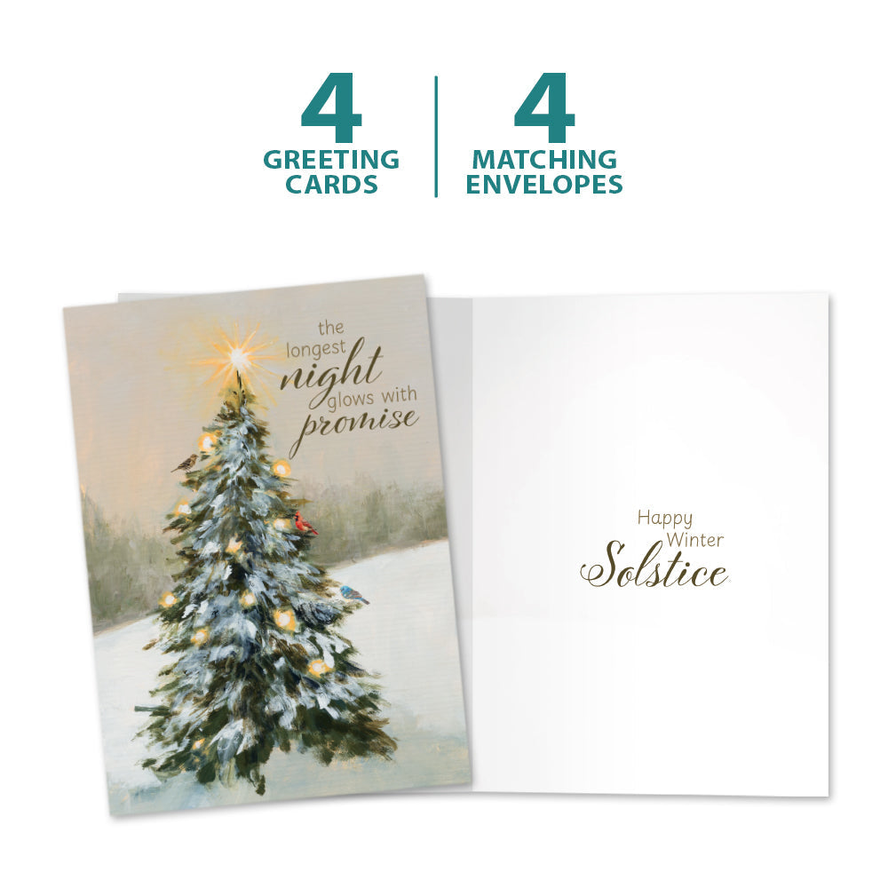 This Solstice card set shares the message "The longest night glows with promise" on the cover, and on the inside reads "Happy winter solstice". It features art by Julia Purinton and includes four 5 x 7 greeting cards with matching ARTvelopes (all our 5 x 7 envelopes are designed to match the greeting card cover art). Printing powered by solar energy. 100% Post-consumer recycled. Proudly Made in the USA