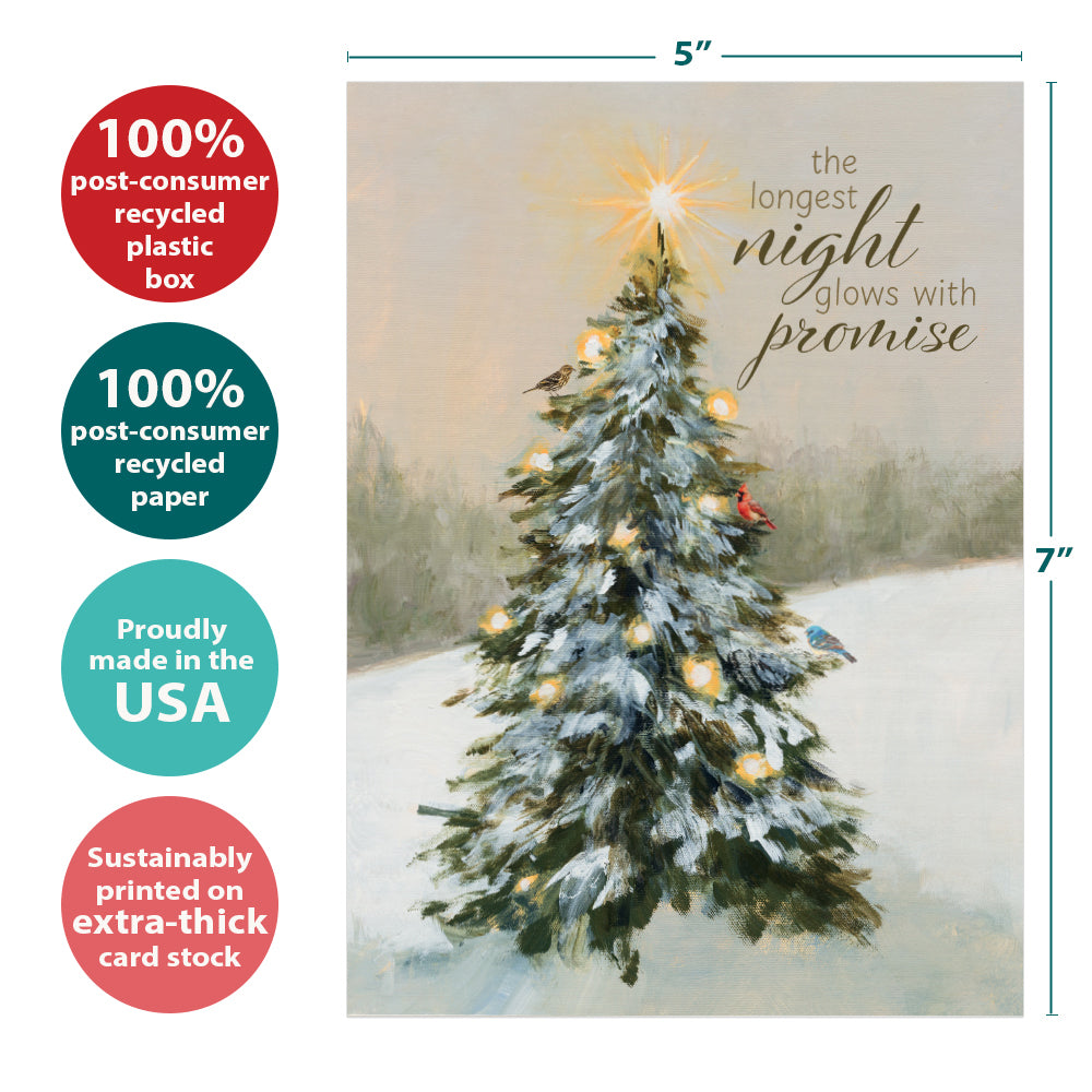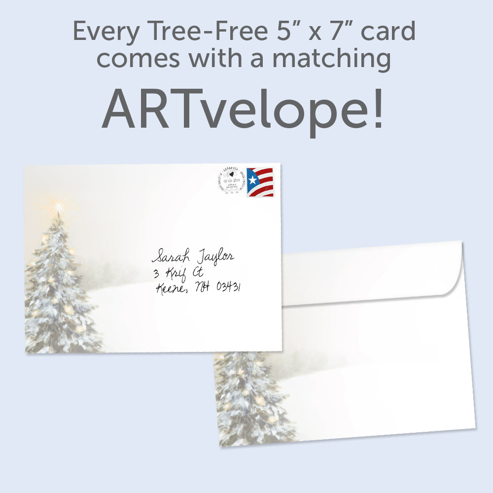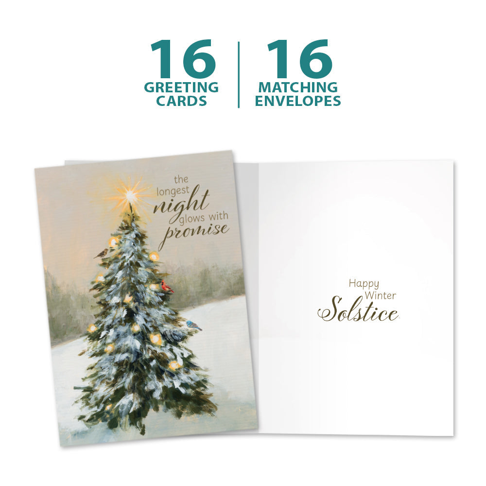 This Solstice card set shares the message "The longest night glows with promise" on the cover, and on the inside reads "Happy winter solstice". It features art by Julia Purinton and includes sixteen 5 x 7 greeting cards with matching ARTvelopes (all our 5 x 7 envelopes are designed to match the greeting card cover art). Printing powered by solar energy. 100% Post-consumer recycled. Proudly Made in the USA