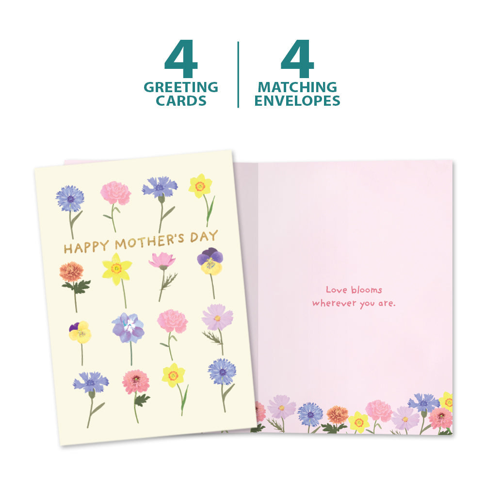 This Mother's Day card set shares the message "Happy Mother's Day" on the cover, and on the inside reads "Love blooms wherever you are". It features art by Hammond Gower Publications and includes four 5 x 7 greeting cards with matching ARTvelopes (all our 5 x 7 envelopes are designed to match the greeting card cover art). Printing powered by solar energy. 100% Post-consumer recycled. Proudly Made in the USA