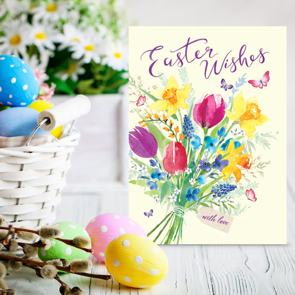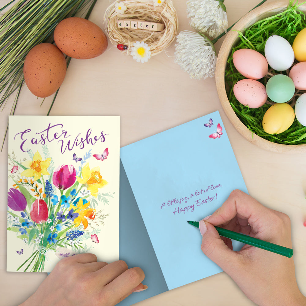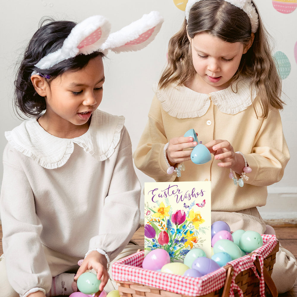 This Easter card set shares the message "Easter wishes" on the cover, and on the inside reads "A little joy, a lot of love. Happy Easter!". It features art by Di Brookes and includes one 5 x 7 greeting card with a matching ARTvelope (all our 5 x 7 envelopes are designed to match the greeting card cover art). Printing powered by solar energy. 100% Post-consumer recycled. Proudly Made in the USA