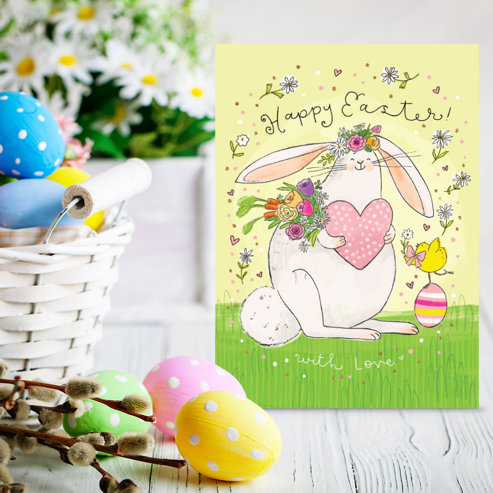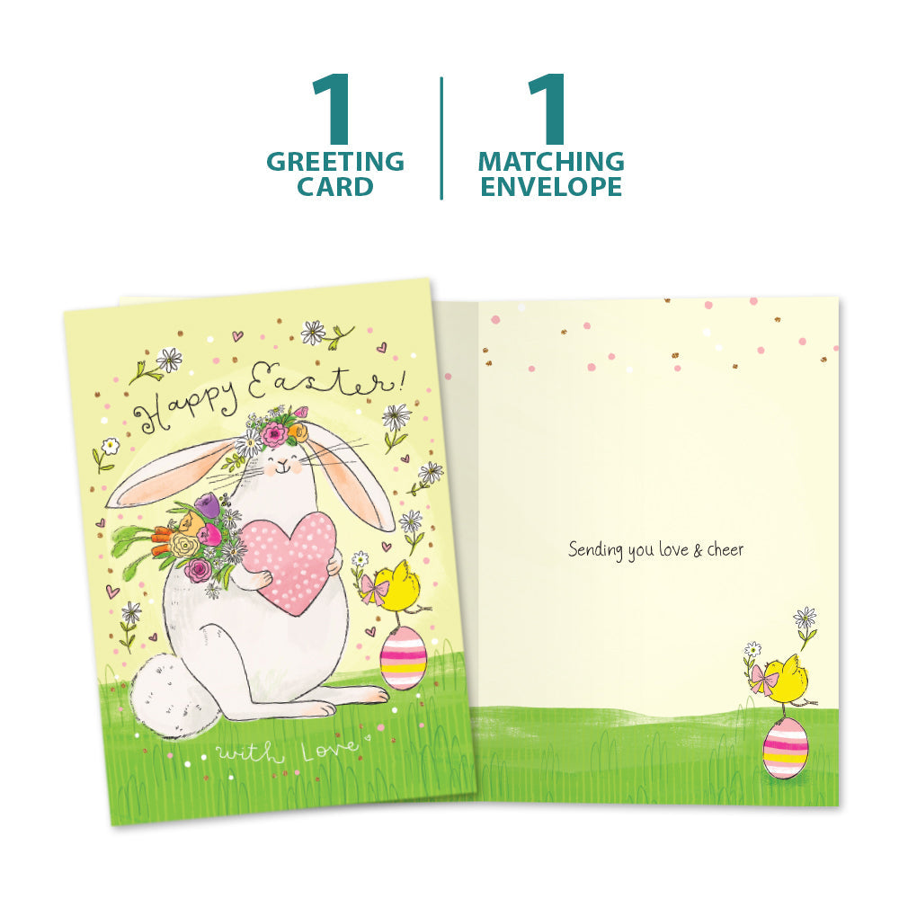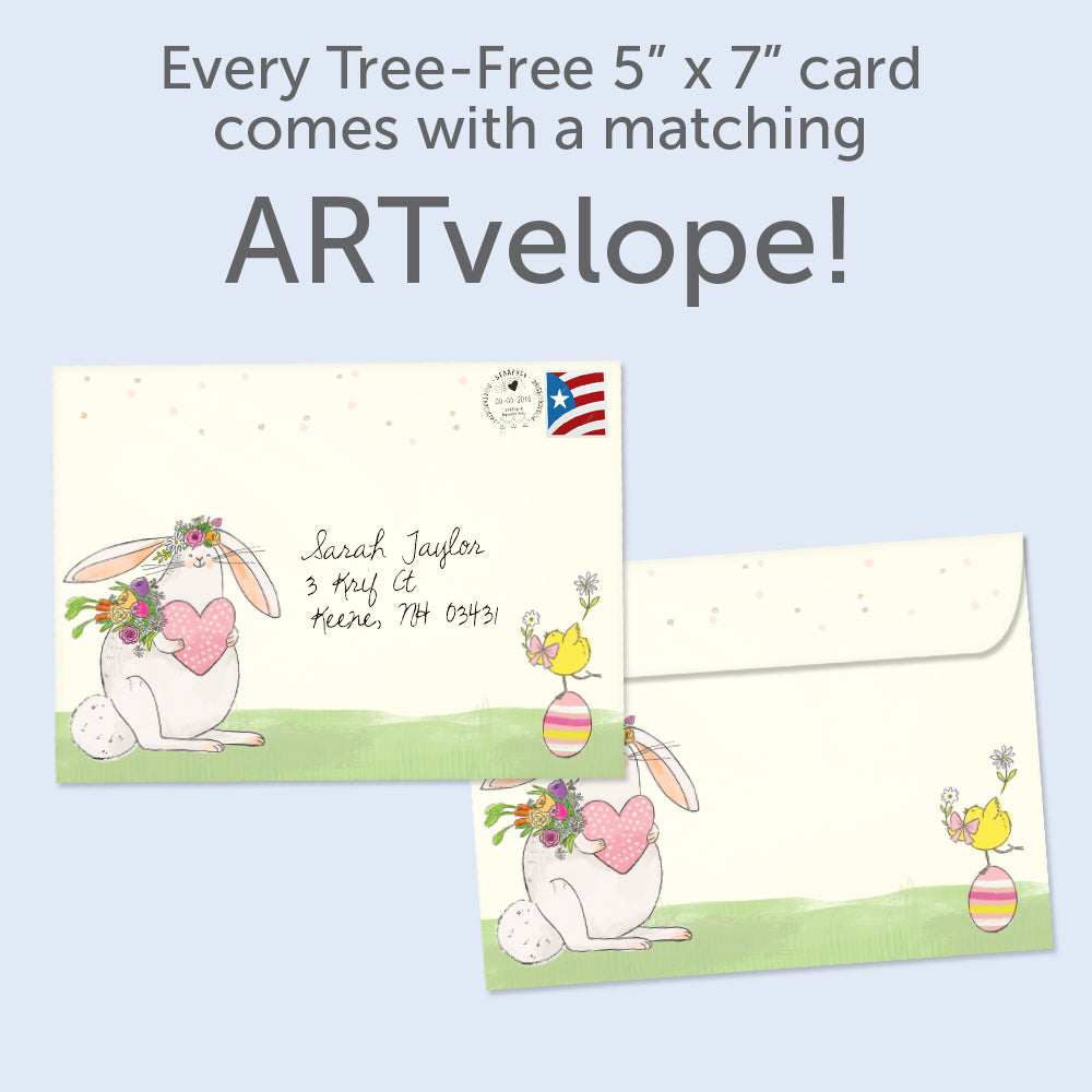 This Easter card set shares the message "Happy Easter!" on the cover, and on the inside reads "Sending you love and cheer". It features art by Cynthia Frenette and includes one 5 x 7 greeting card with a matching ARTvelope (all our 5 x 7 envelopes are designed to match the greeting card cover art). Printing powered by solar energy. 100% Post-consumer recycled. Proudly Made in the USA