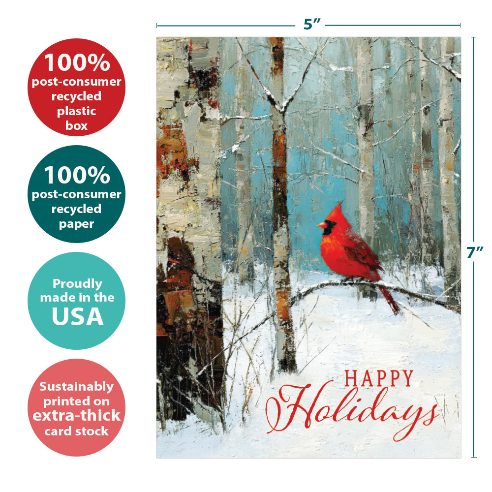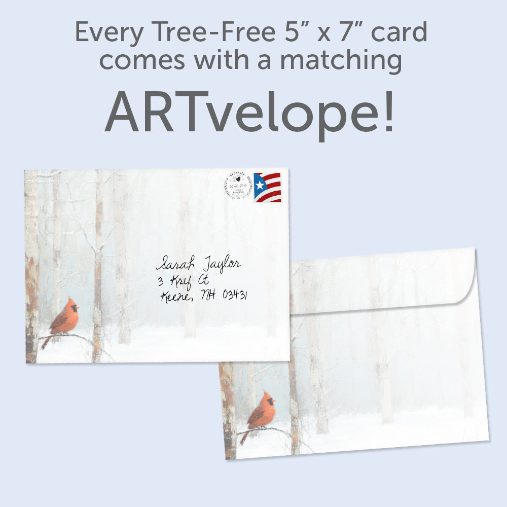 " on the cover, and on the inside reads "Wishing you a holiday season filled with the quiet beauty of nature". It features art by Claudia McKinney and includes sixteen 5 x 7 greeting cards with matching ARTvelopes (all our 5 x 7 envelopes are designed to match the greeting card cover art). Printing powered by solar energy. 100% Post-consumer recycled. Proudly Made in the USA