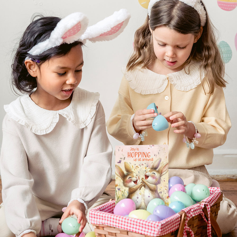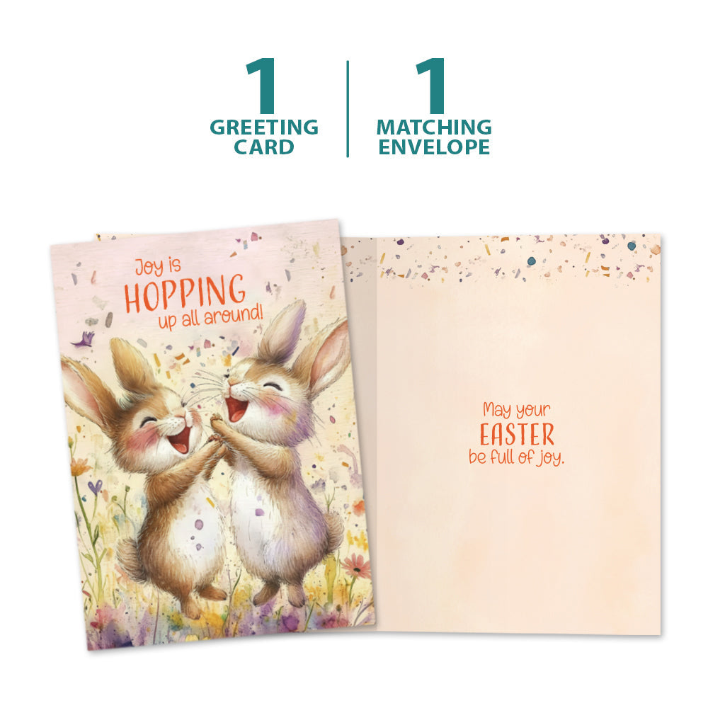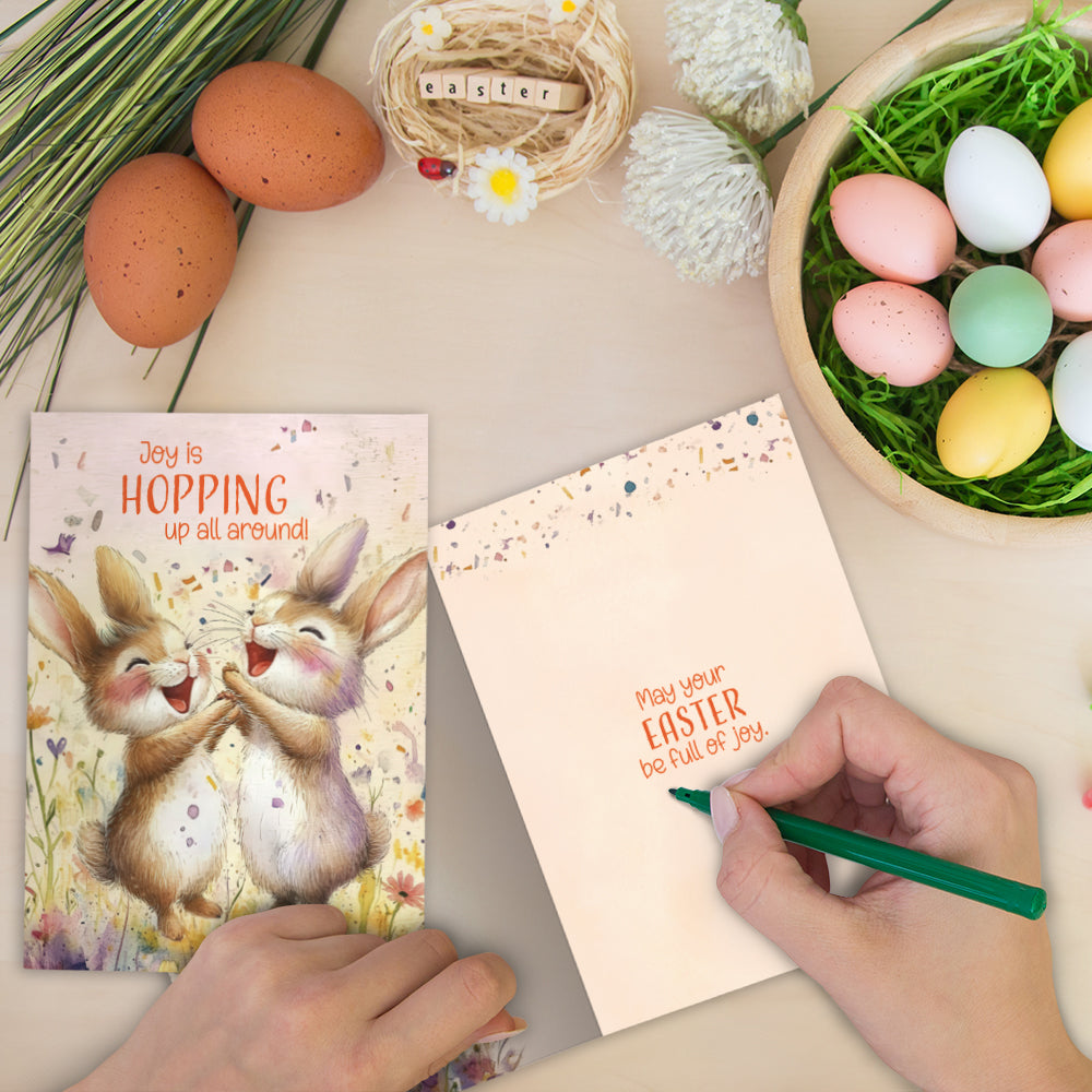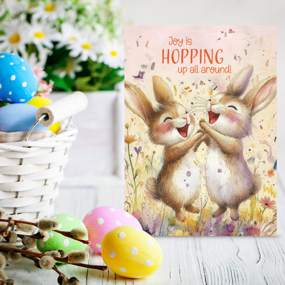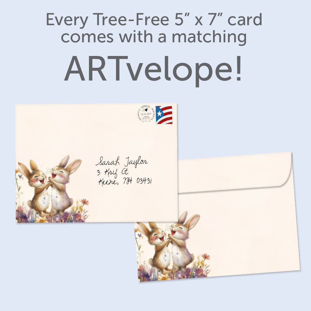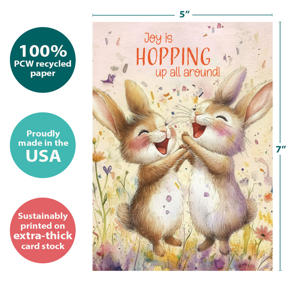 This Easter card set shares the message "Joy is hopping up all around!" on the cover, and on the inside reads "May your Easter be full of joy". It features art by J.K. Stewart and includes one 5 x 7 greeting card with a matching ARTvelope (all our 5 x 7 envelopes are designed to match the greeting card cover art). Printing powered by solar energy. 100% Post-consumer recycled. Proudly Made in the USA