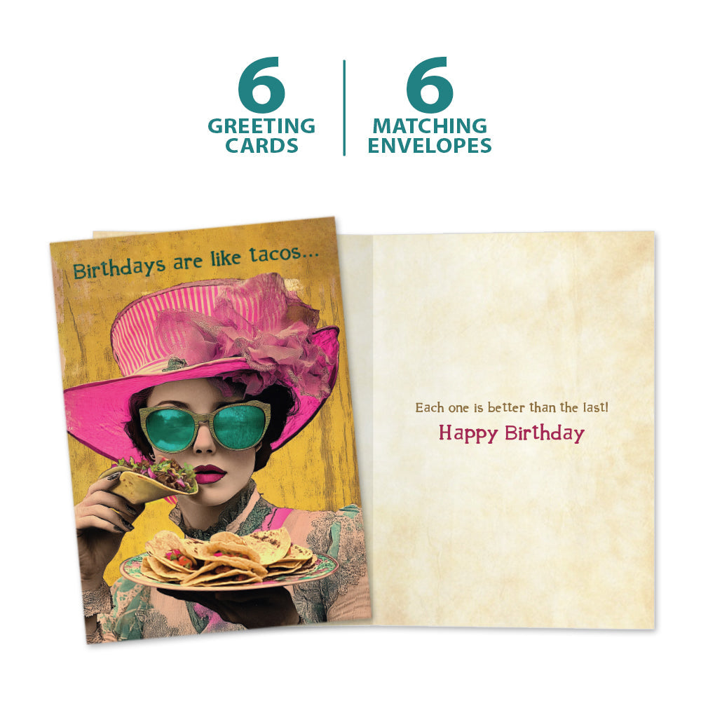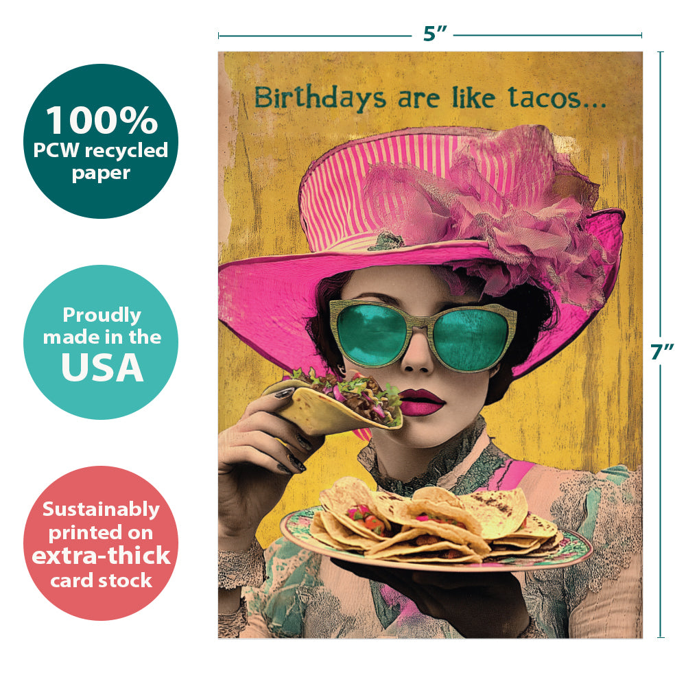 This Birthday card set shares the message "Birthdays are like tacos..." on the cover, and on the inside reads "Each one is better than the last! Happy birthday". It features art by J.K. Stewart and includes six 5 x 7 greeting cards with matching ARTvelopes (all our 5 x 7 envelopes are designed to match the greeting card cover art). Printing powered by solar energy. 100% Post-consumer recycled. Proudly Made in the USA