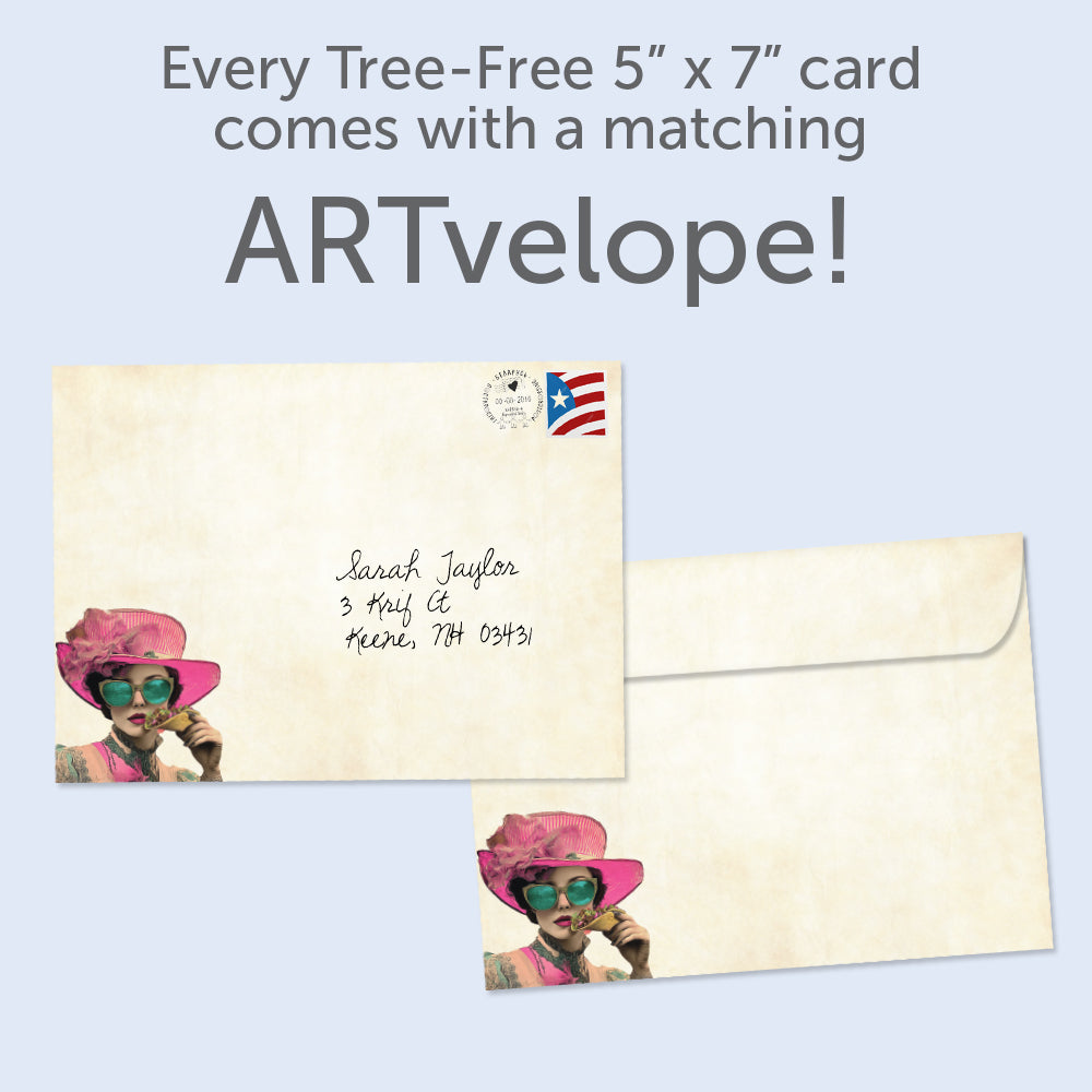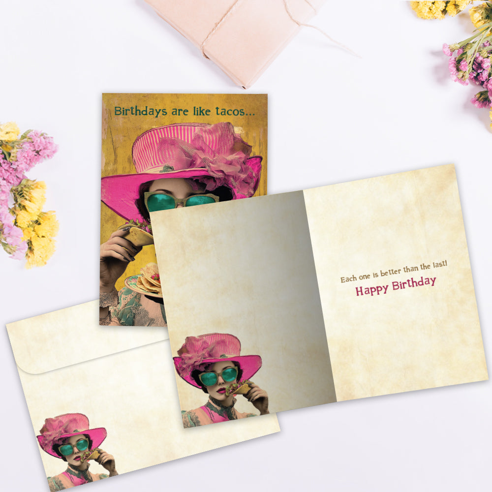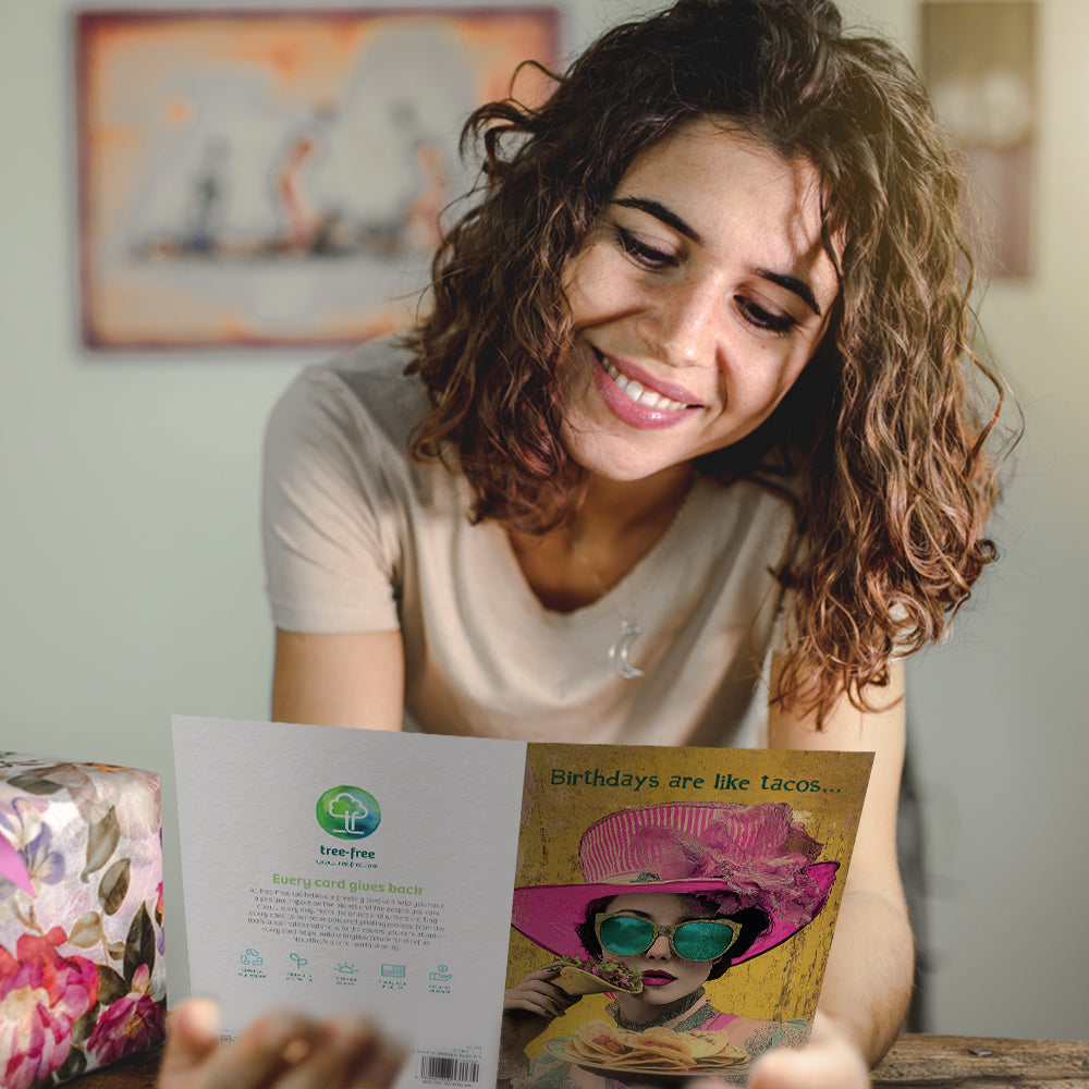 This Birthday card set shares the message "Birthdays are like tacos..." on the cover, and on the inside reads "Each one is better than the last! Happy birthday". It features art by J.K. Stewart and includes one 5 x 7 greeting card with a matching ARTvelope (all our 5 x 7 envelopes are designed to match the greeting card cover art). Printing powered by solar energy. 100% Post-consumer recycled. Proudly Made in the USA
