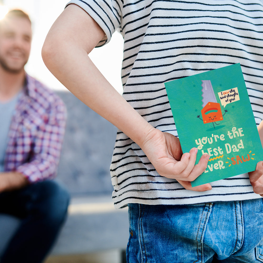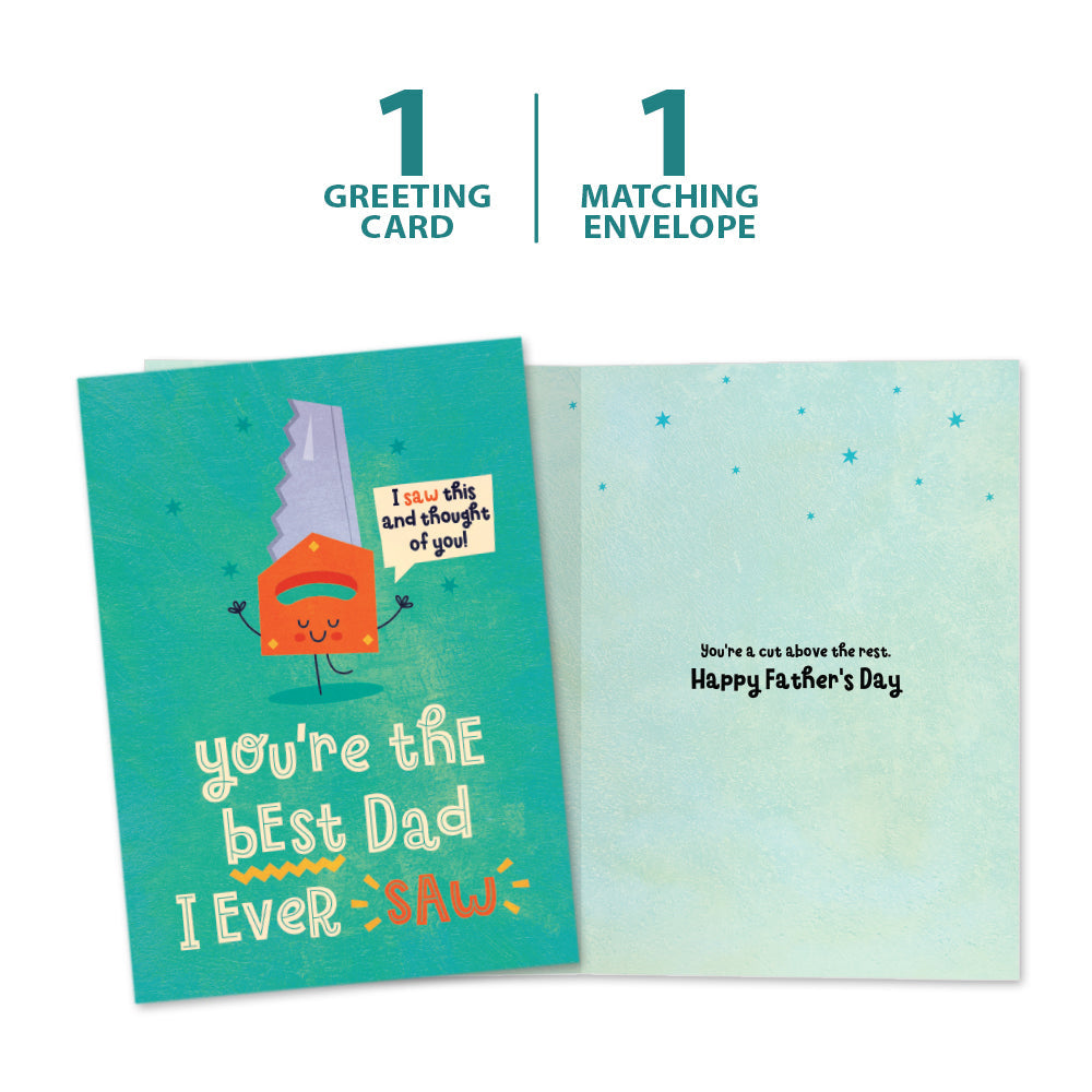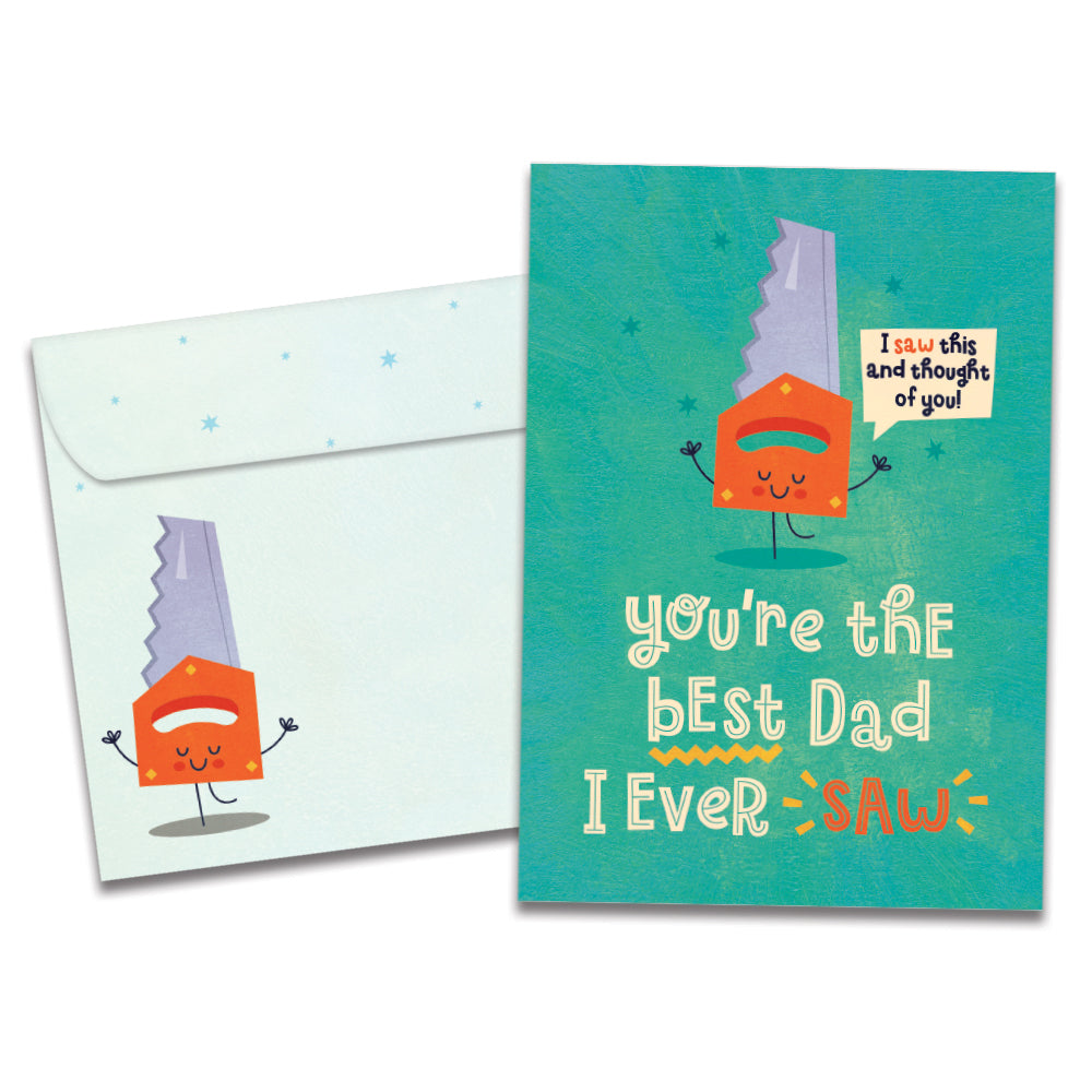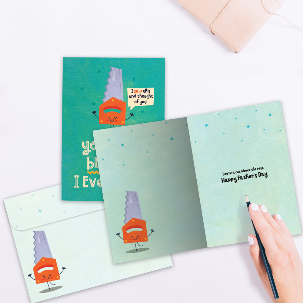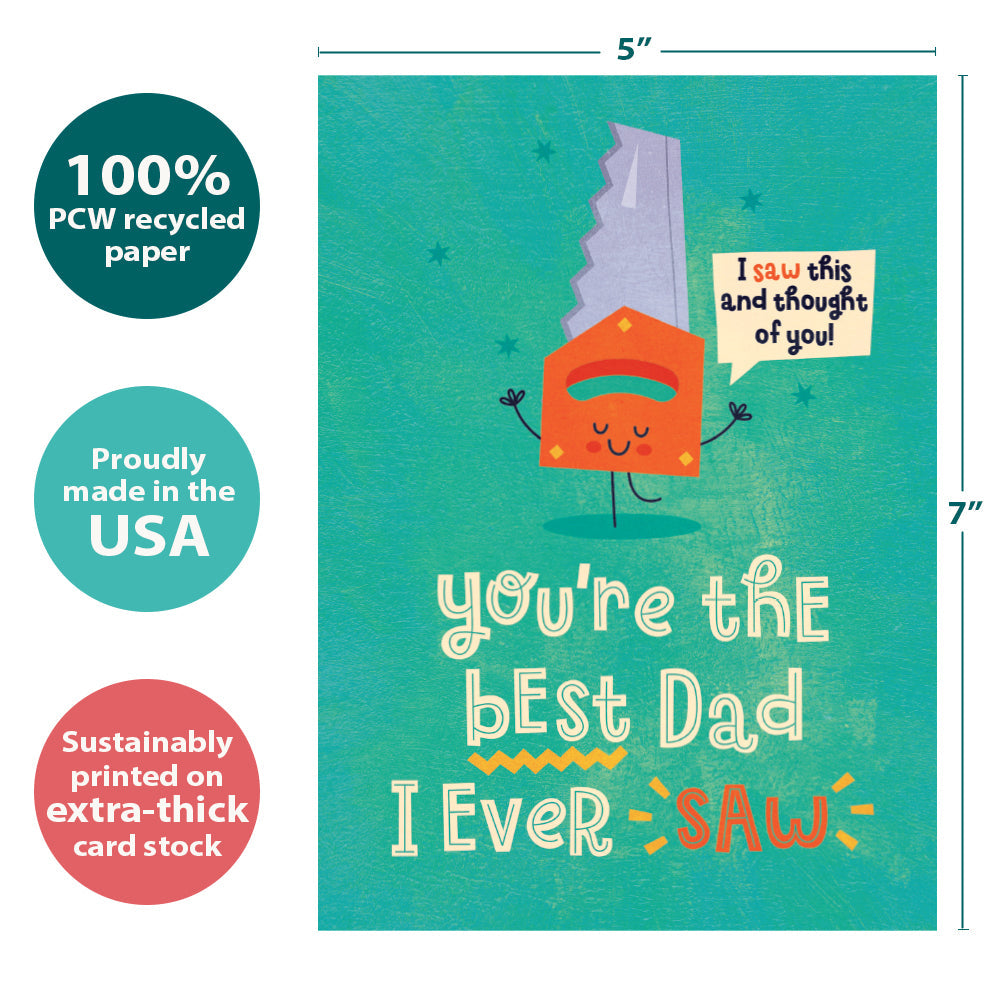 This Father's Day card set shares the message "I saw this and thought of you! You're the best dad I ever saw" on the cover, and on the inside reads "You're a cut above the rest. Happy Father's Day". It features art by Gareth Williams and includes one 5 x 7 greeting card with a matching ARTvelope (all our 5 x 7 envelopes are designed to match the greeting card cover art). Printing powered by solar energy. 100% Post-consumer recycled. Proudly Made in the USA