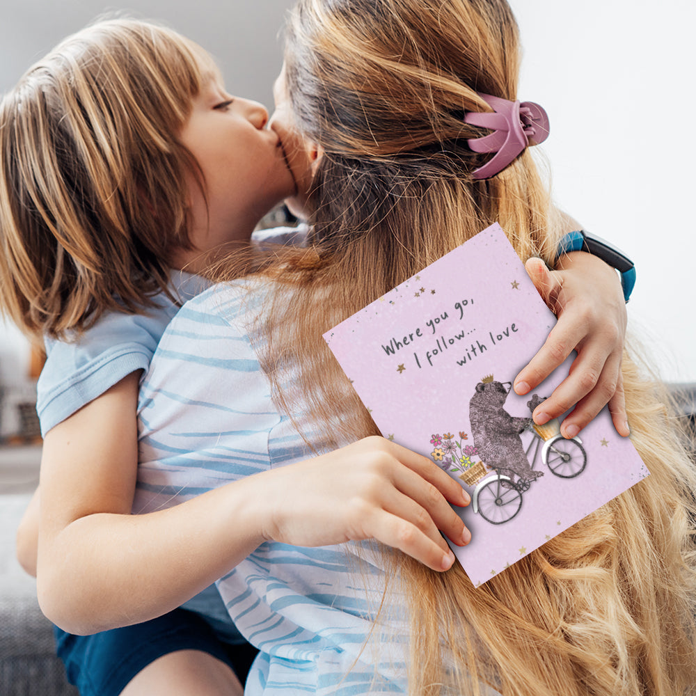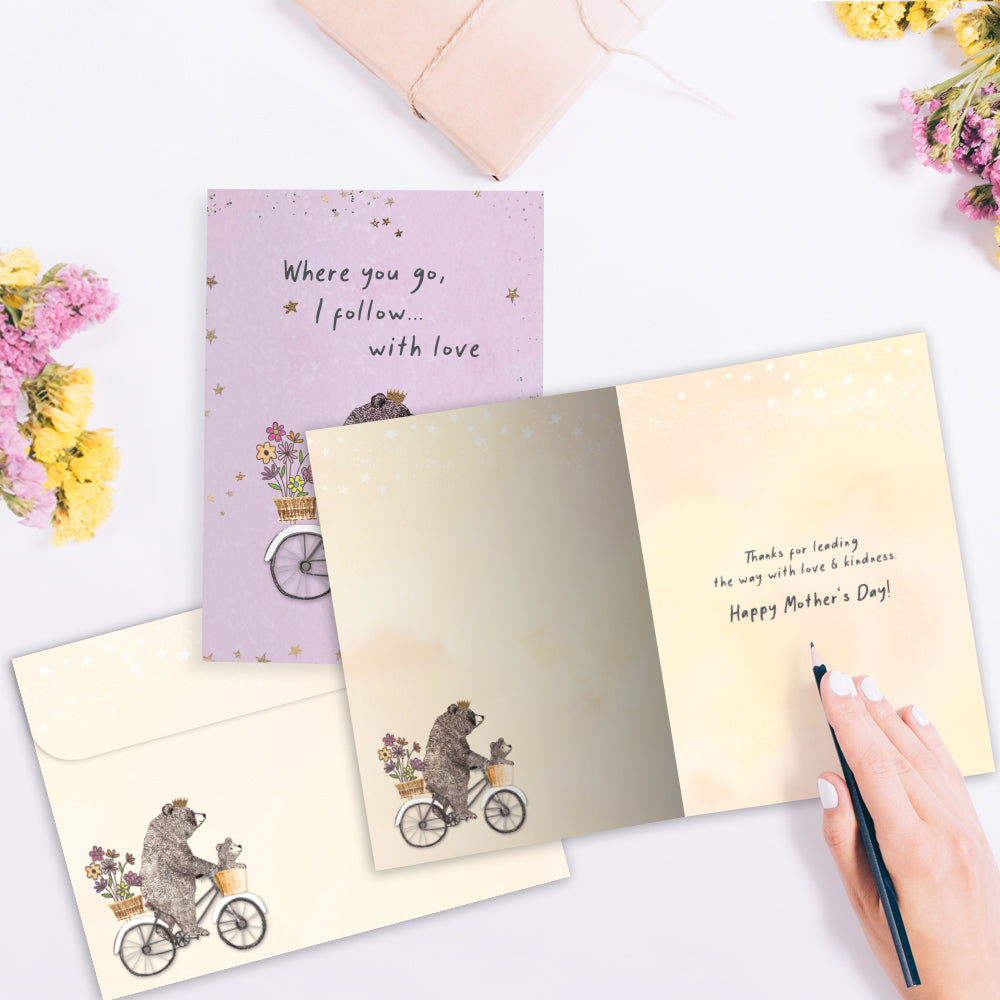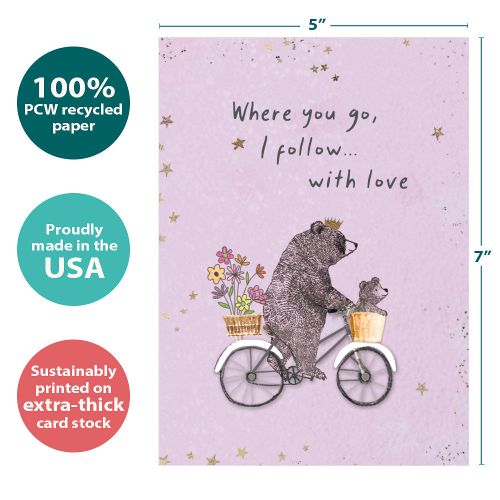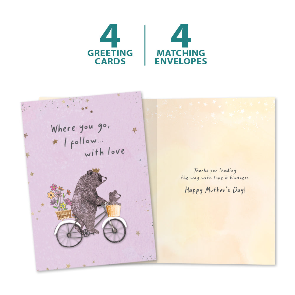 This Mother's Day card set shares the message "Where you go, I follow...with love" on the cover, and on the inside reads "Thanks for leading the way with love and kindness. Happy Mother's Day!". It features art by Hammond Gower Publications and includes four 5 x 7 greeting cards with matching ARTvelopes (all our 5 x 7 envelopes are designed to match the greeting card cover art). Printing powered by solar energy. 100% Post-consumer recycled. Proudly Made in the USA