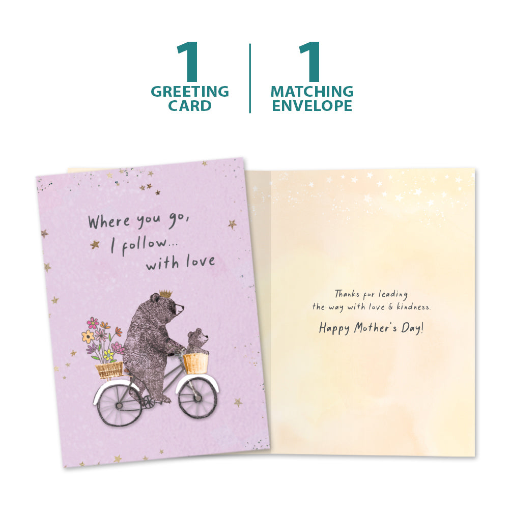 This Mother's Day card set shares the message "Where you go, I follow...with love" on the cover, and on the inside reads "Thanks for leading the way with love and kindness. Happy Mother's Day!". It features art by Hammond Gower Publications and includes one 5 x 7 greeting card with a matching ARTvelope (all our 5 x 7 envelopes are designed to match the greeting card cover art). Printing powered by solar energy. 100% Post-consumer recycled. Proudly Made in the USA