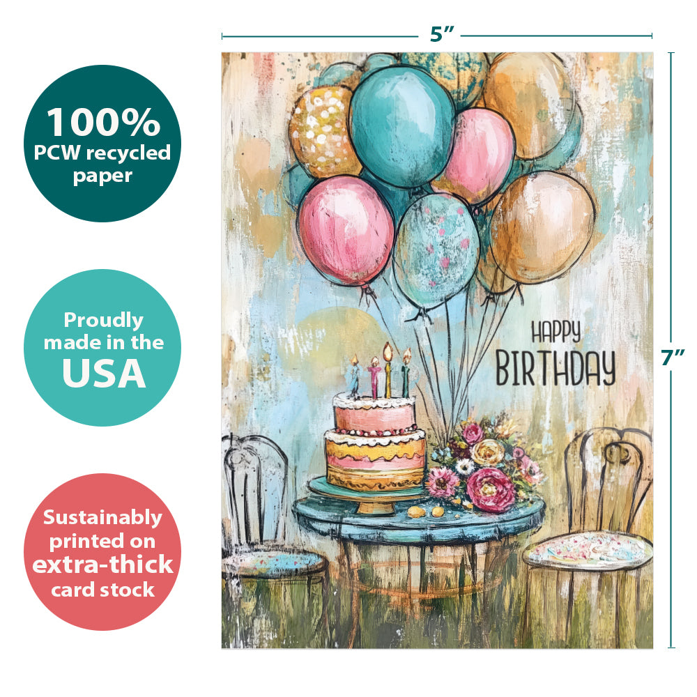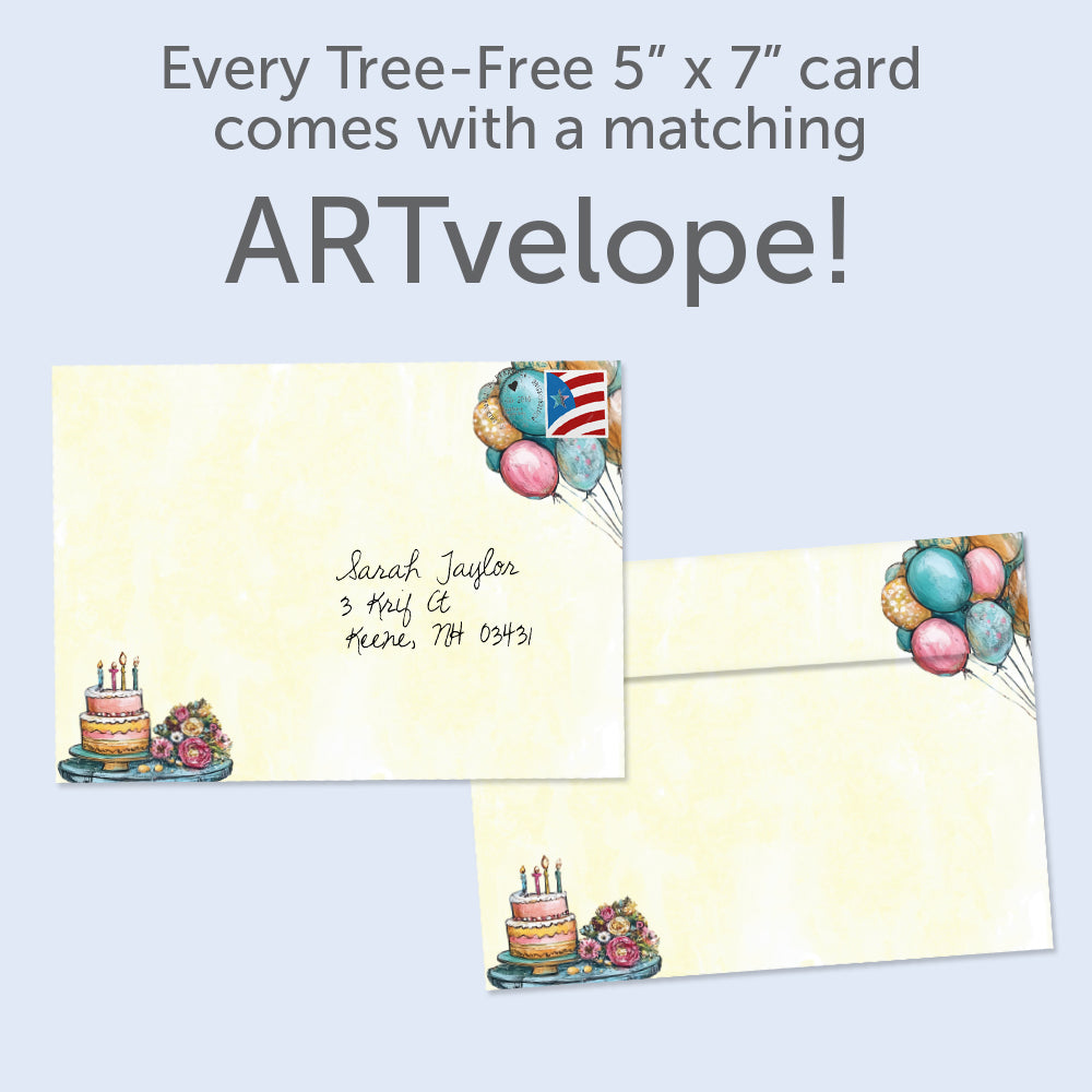 This Birthday card set shares the message "Happy birthday" on the cover, and on the inside reads "All the love. All the joy. All for you! ". It features art by J.K. Stewart and includes one 5 x 7 greeting card with a matching ARTvelope (all our 5 x 7 envelopes are designed to match the greeting card cover art). Printing powered by solar energy. 100% Post-consumer recycled. Proudly Made in the USA