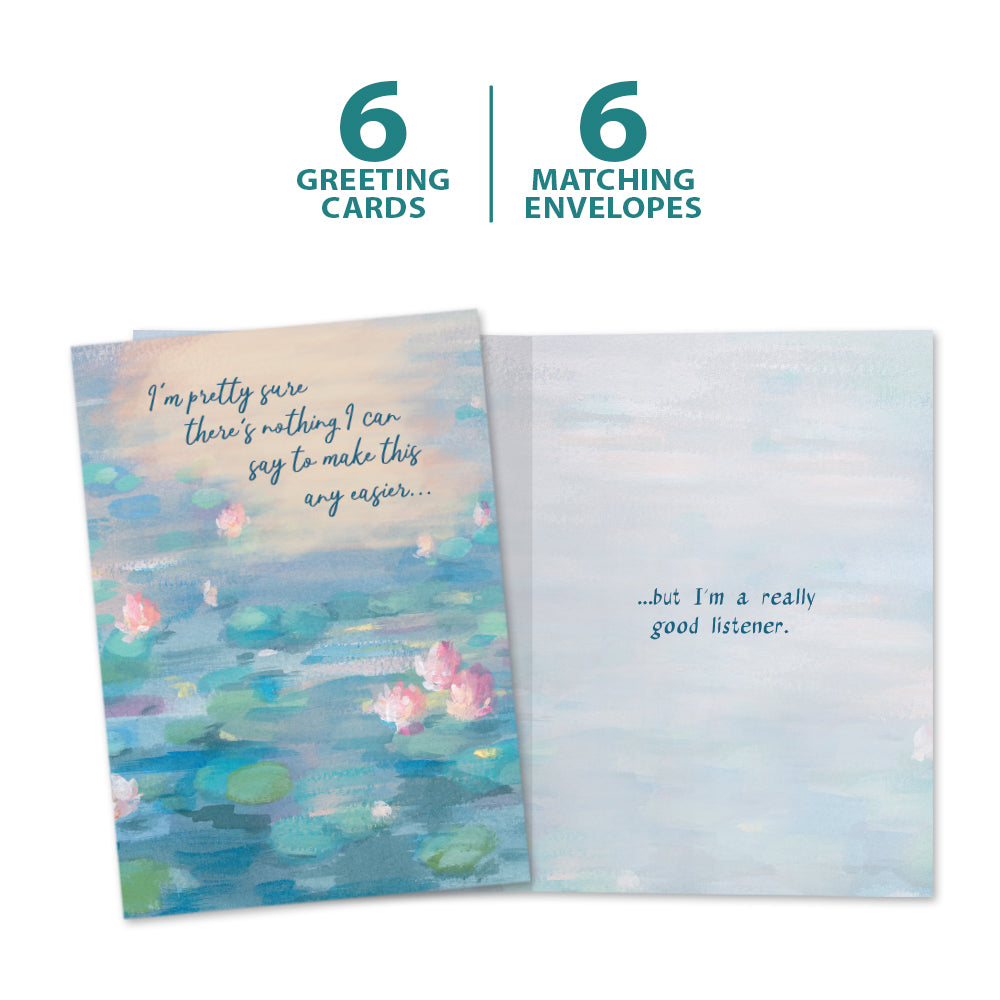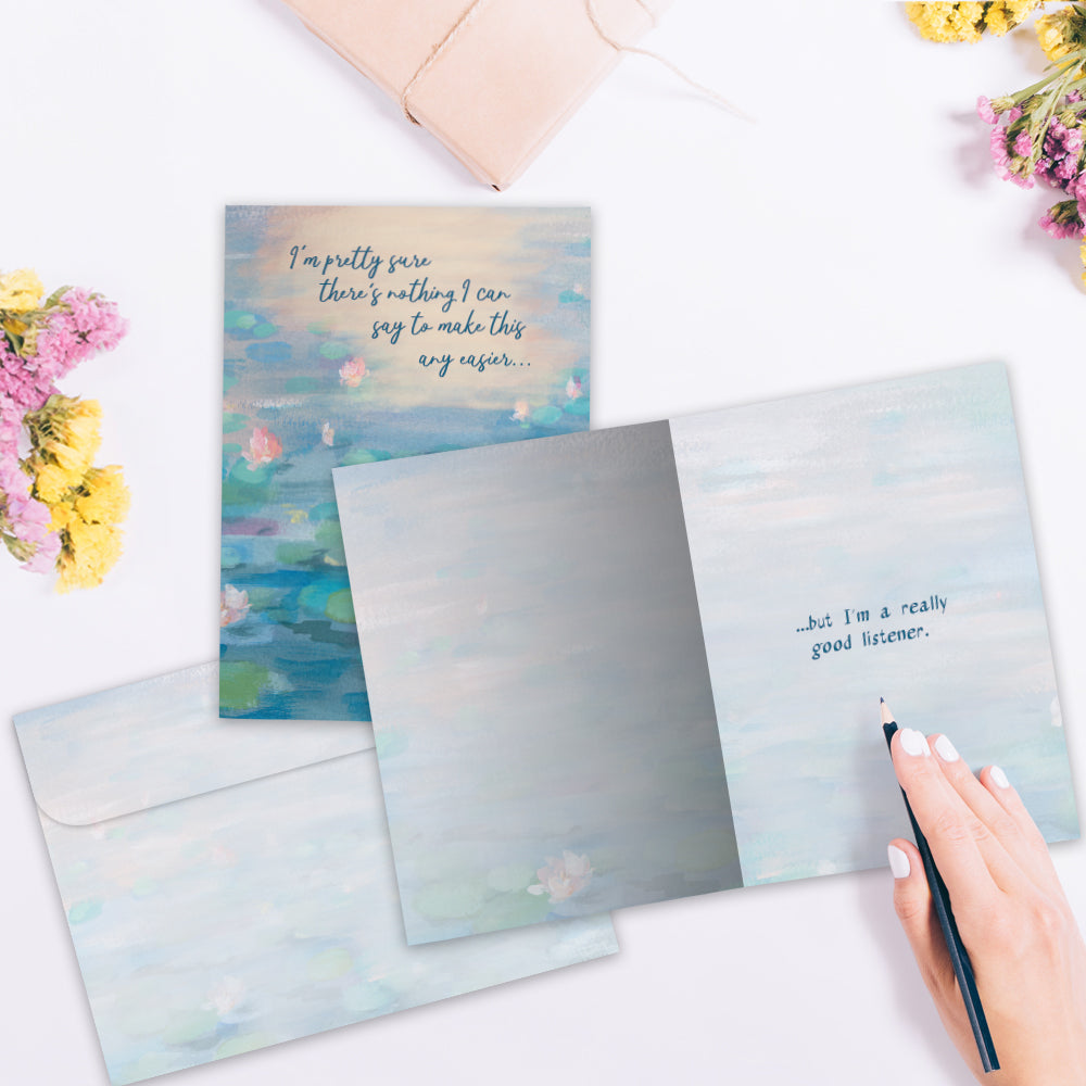 This 5 x 7 Support and Encouragement greeting card reads "I'm pretty sure there's nothing I can say to make this any easier…" on the cover, and on the inside shares the message "But I'm a really good listener". It features art by Danhui Nai, includes a fully printed matching ARTvelope, and is made from 100% post-consumer recycled material. Our printing processes are powered by solar energy and are proudly made in the USA. This is for a retail ready 6 Pack