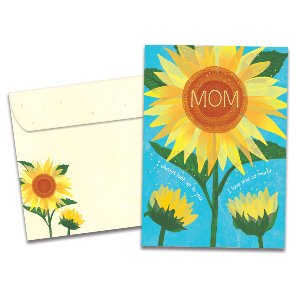 This Mother's Day card set shares the message "Mom - I always look up to you - I love you so much!" on the cover, and on the inside reads "Happy Mother's Day". It features art by Debbie Edwards and includes four 5 x 7 greeting cards with matching ARTvelopes (all our 5 x 7 envelopes are designed to match the greeting card cover art). Printing powered by solar energy. 100% Post-consumer recycled. Proudly Made in the USA
