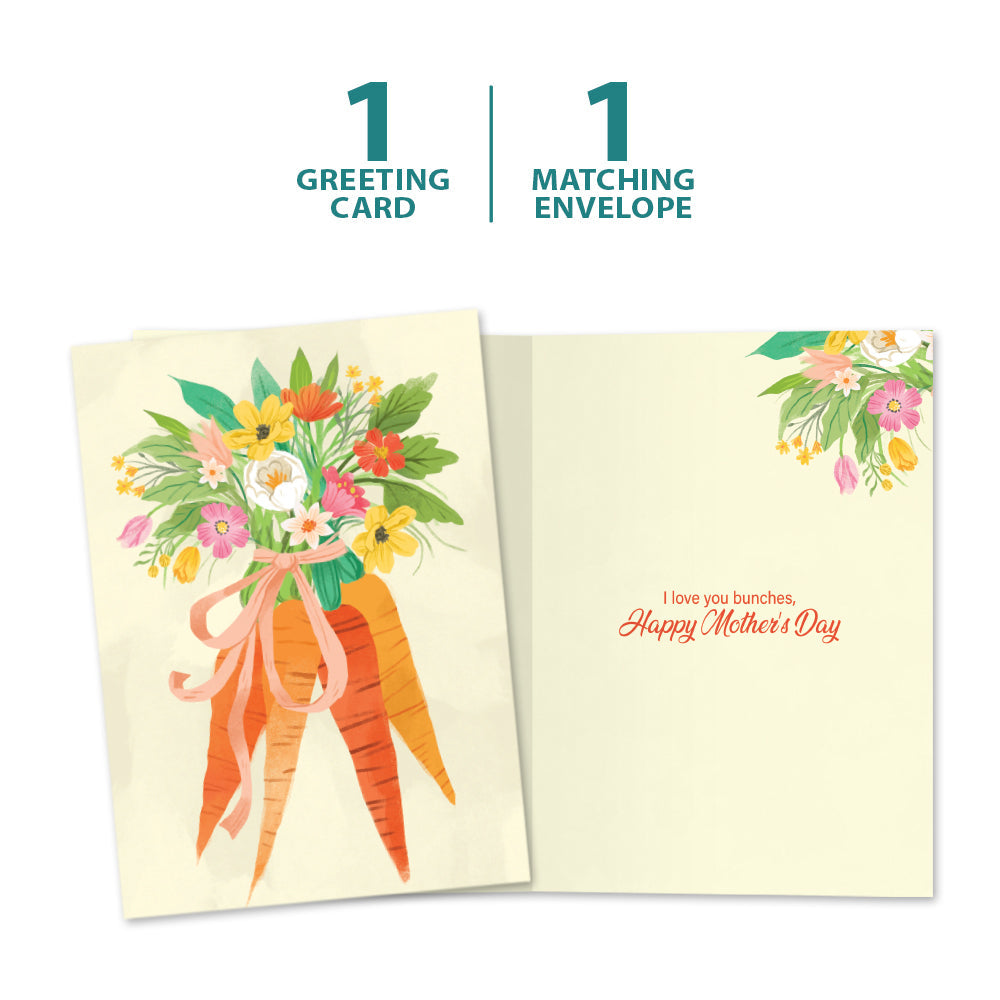 This Mother's Day card set is blank on the cover, and on the inside reads "I love you bunches - happy Mother's Day". It features art by Kathryn Selbert and includes one 5 x 7 greeting card with a matching ARTvelope (all our 5 x 7 envelopes are designed to match the greeting card cover art). Printing powered by solar energy. 100% Post-consumer recycled. Proudly Made in the USA