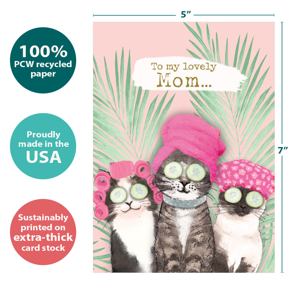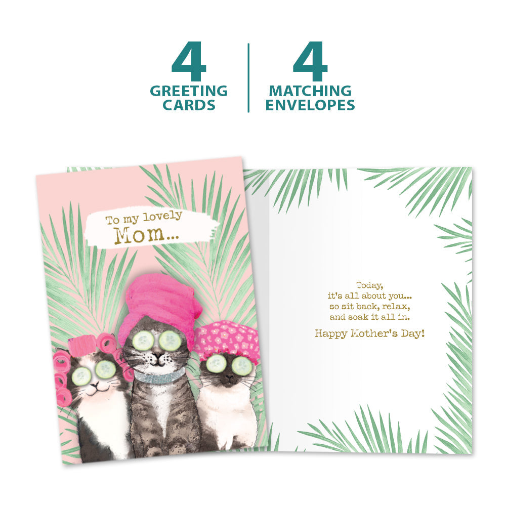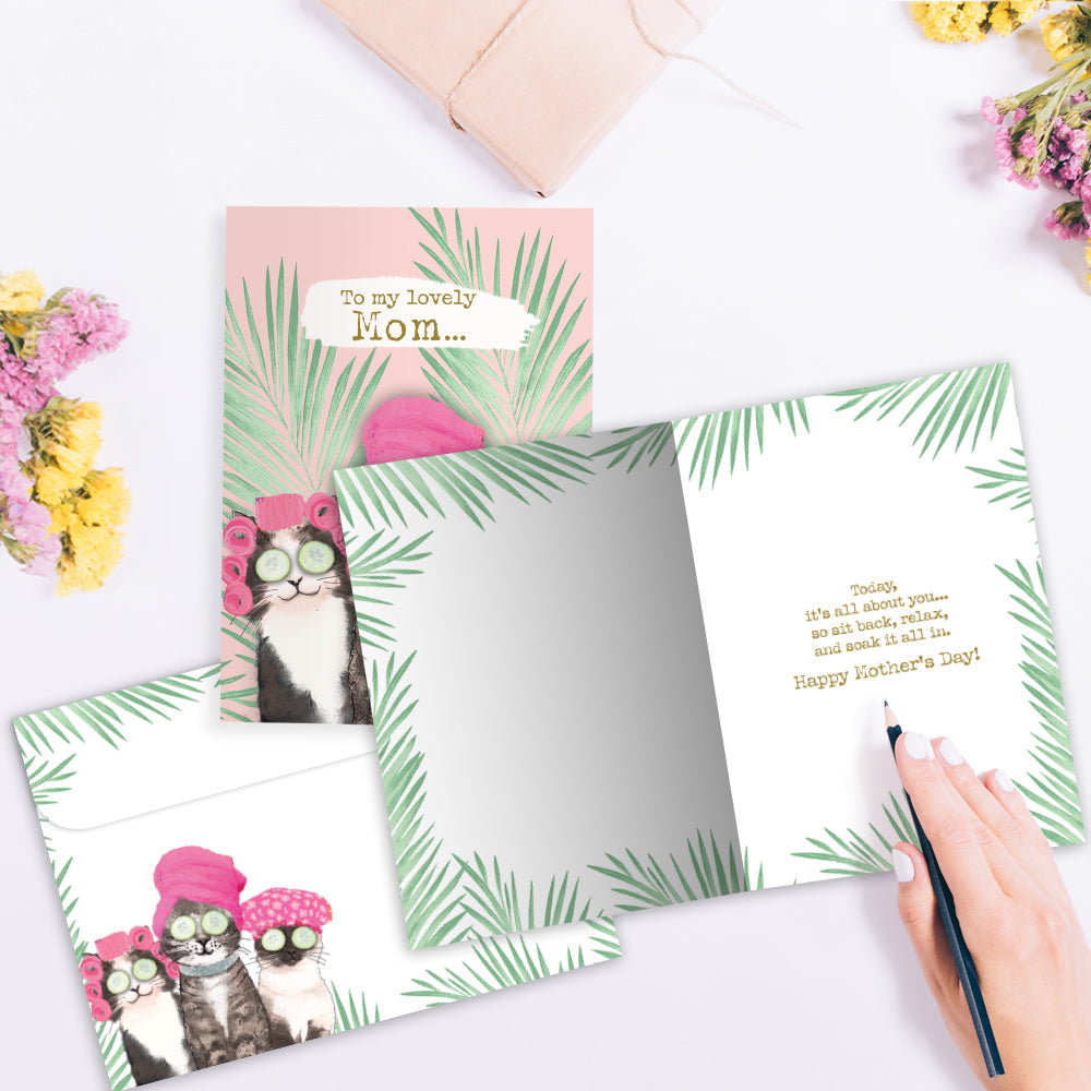 This Mother's Day card set shares the message "To my lovely mom..." on the cover, and on the inside reads "Today, it’s all about you...so sit back, relax, and soak it all in. Happy Mother’s Day!". It features art by Hammond Gower Publications and includes four 5 x 7 greeting cards with matching ARTvelopes (all our 5 x 7 envelopes are designed to match the greeting card cover art). Printing powered by solar energy. 100% Post-consumer recycled. Proudly Made in the USA