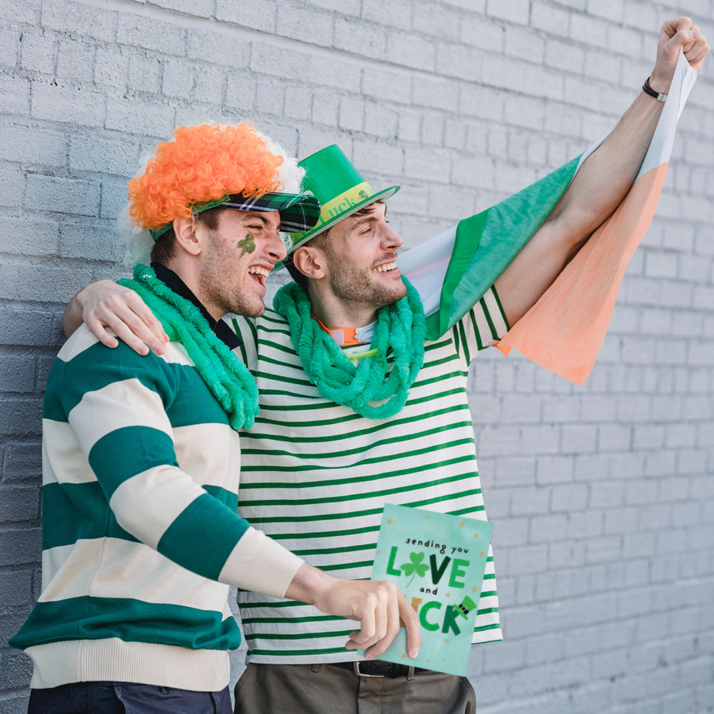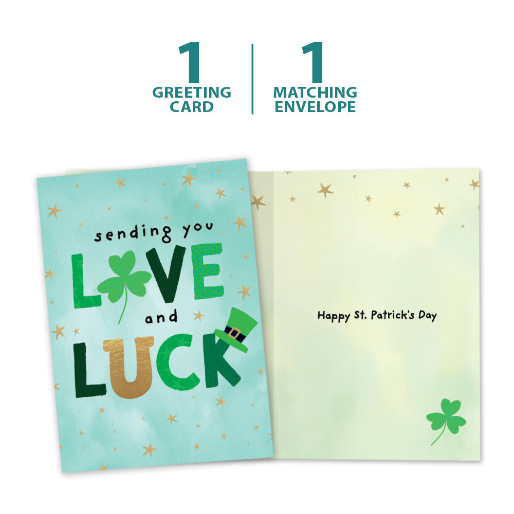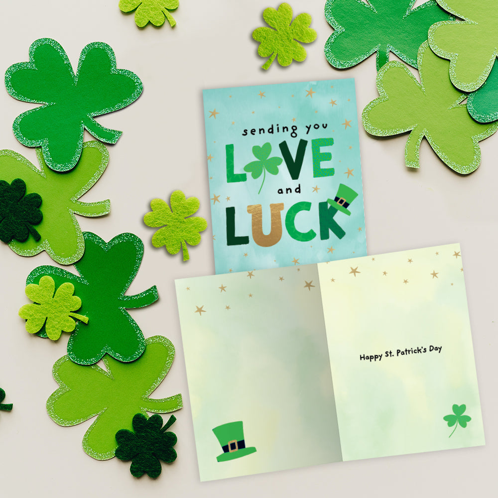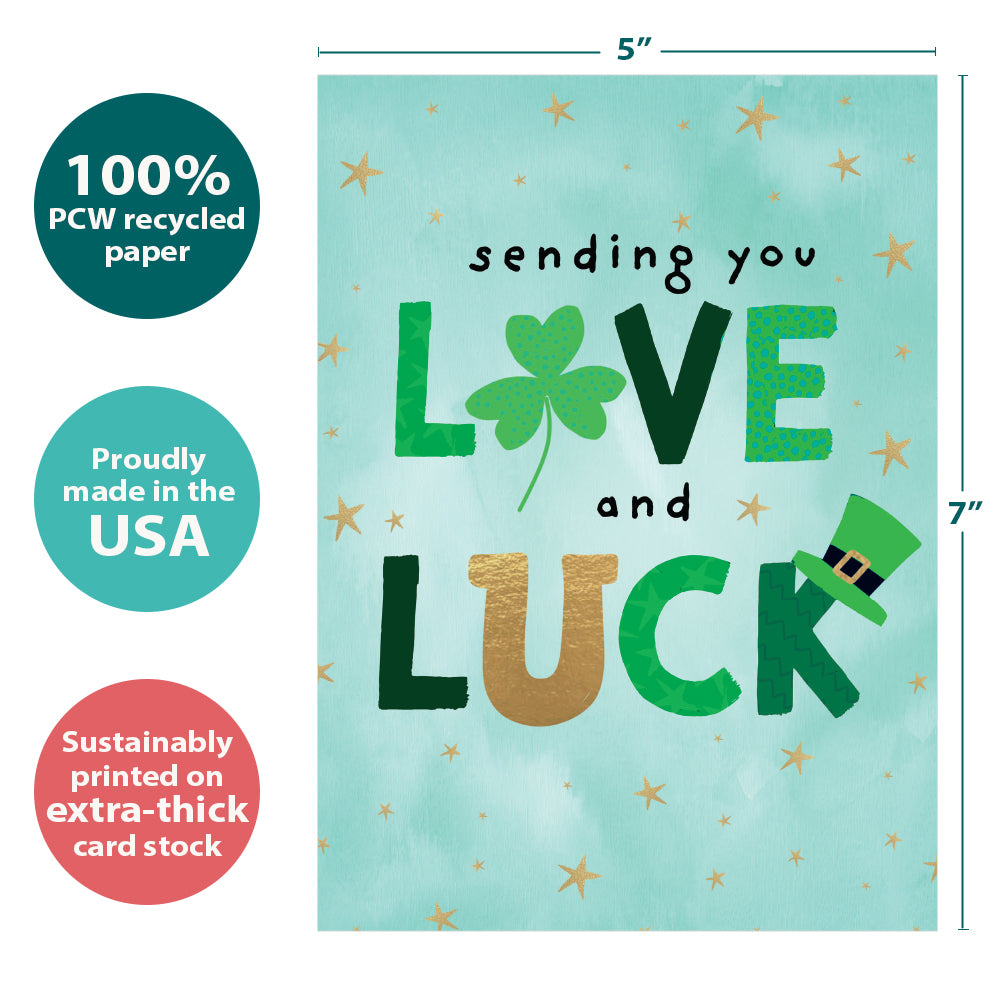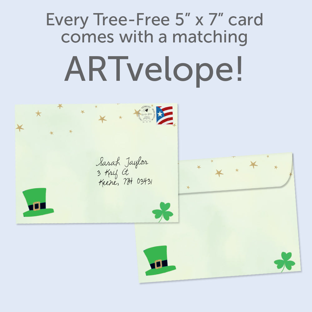 This St. Patrick's Day card set shares the message "Sending you love and luck" on the cover, and on the inside reads "Happy St. Patrick's Day". It features art by Hammond Gower Publications and includes one 5 x 7 greeting card with a matching ARTvelope (all our 5 x 7 envelopes are designed to match the greeting card cover art). Printing powered by solar energy. 100% Post-consumer recycled. Proudly Made in the USA