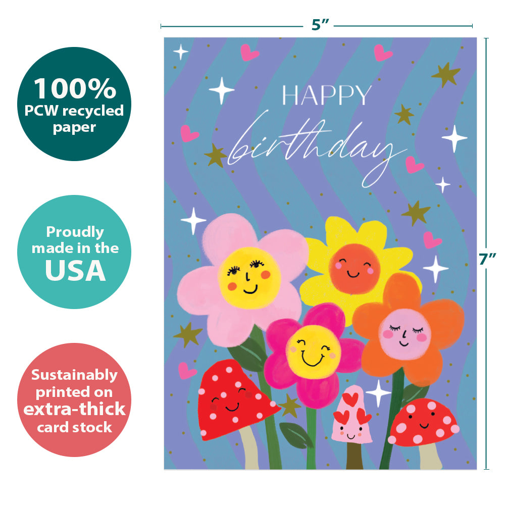 This Birthday card set shares the message "Happy birthday" on the cover, and on the inside reads "I'm so happy we get to celebrate you!". It features art by Hammond Gower Publications and includes one 5 x 7 greeting card with a matching ARTvelope (all our 5 x 7 envelopes are designed to match the greeting card cover art). Printing powered by solar energy. 100% Post-consumer recycled. Proudly Made in the USA