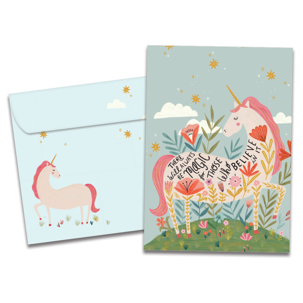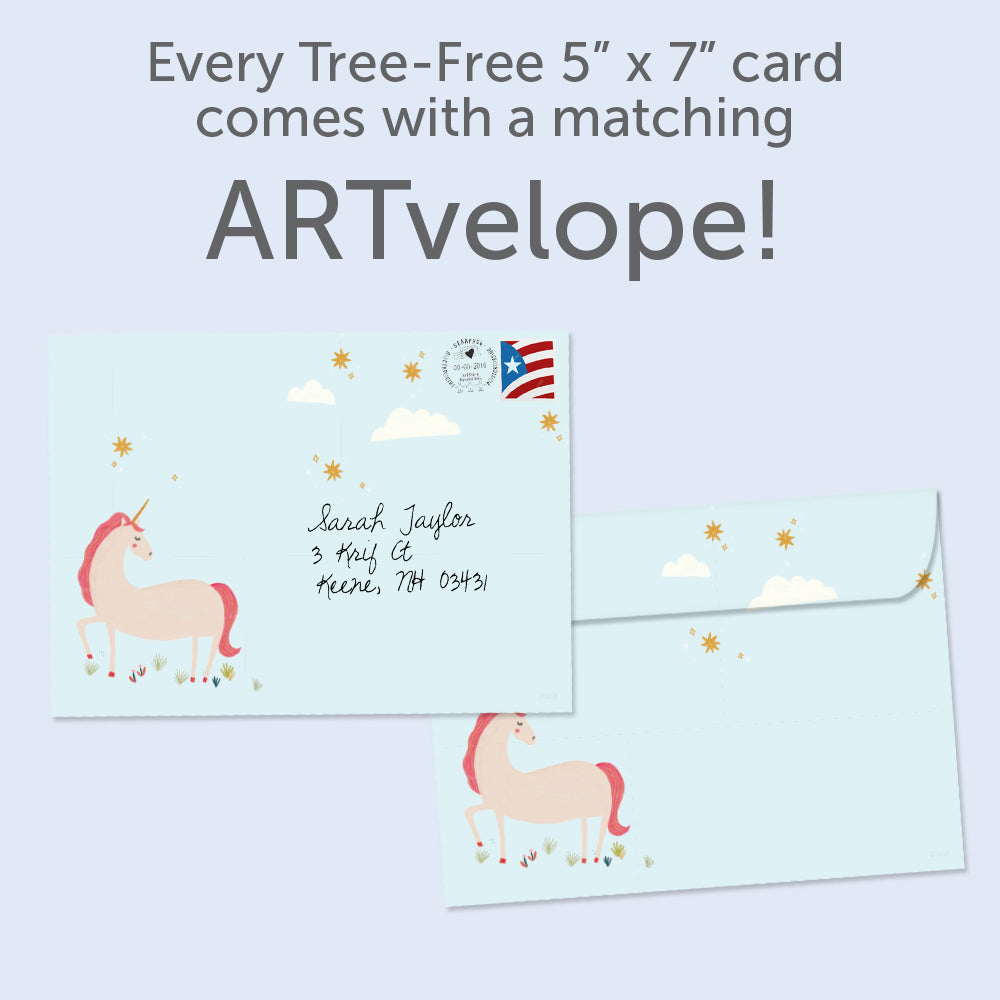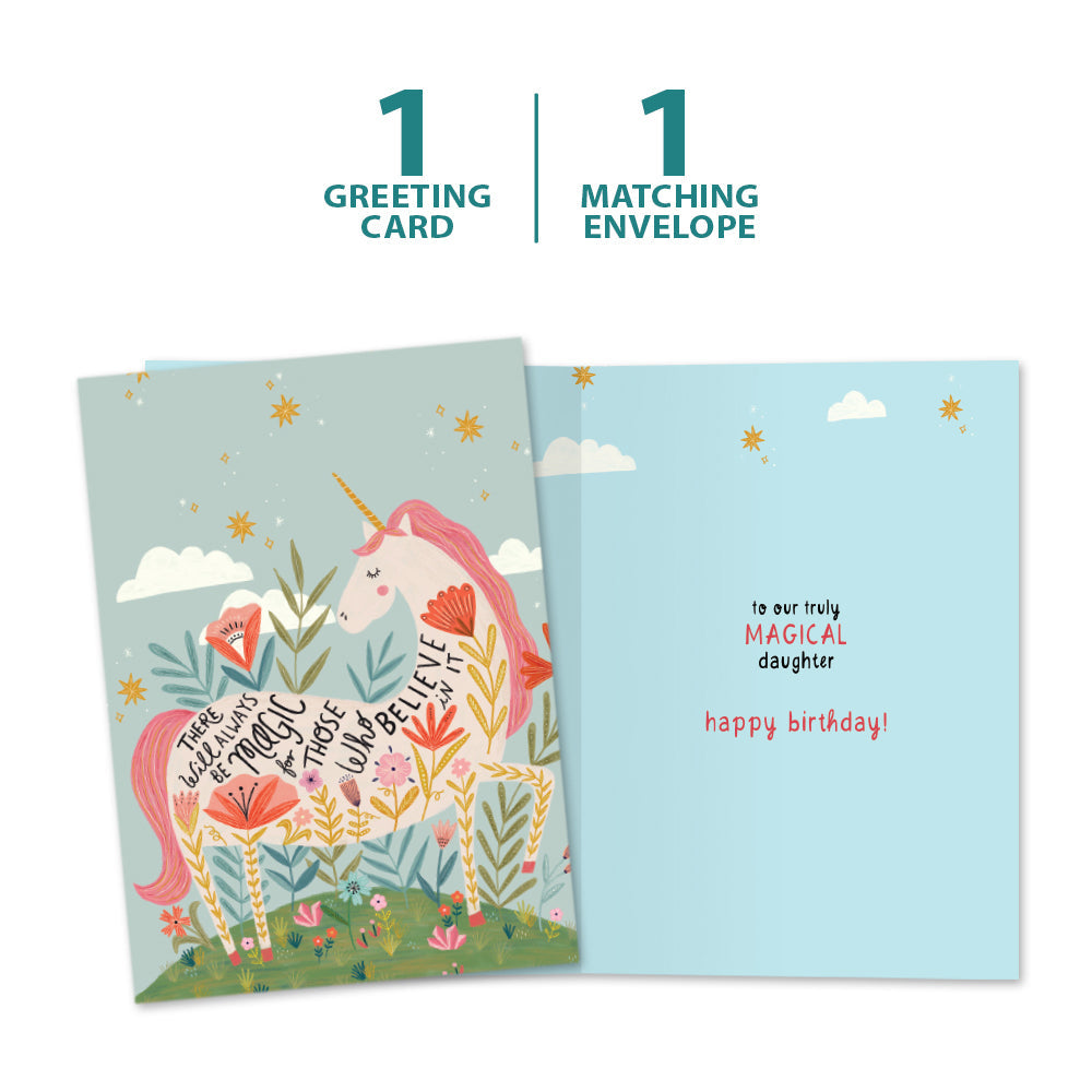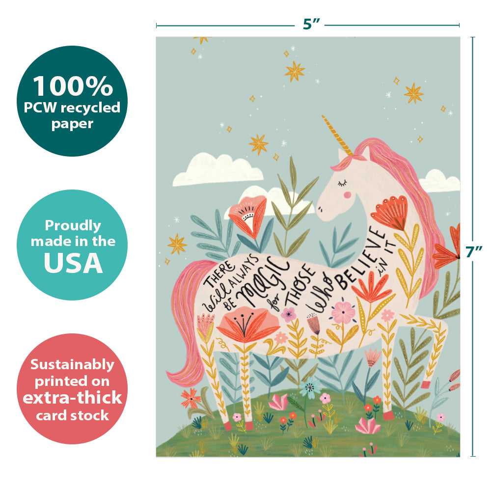 This Birthday card set shares the message "There will always be magic for those who believe in it" on the cover, and on the inside reads "To our truly magical daughter, happy birthday!". It features art by Kenzie Kae and includes one 5 x 7 greeting card with a matching ARTvelope (all our 5 x 7 envelopes are designed to match the greeting card cover art). Printing powered by solar energy. 100% Post-consumer recycled. Proudly Made in the USA
