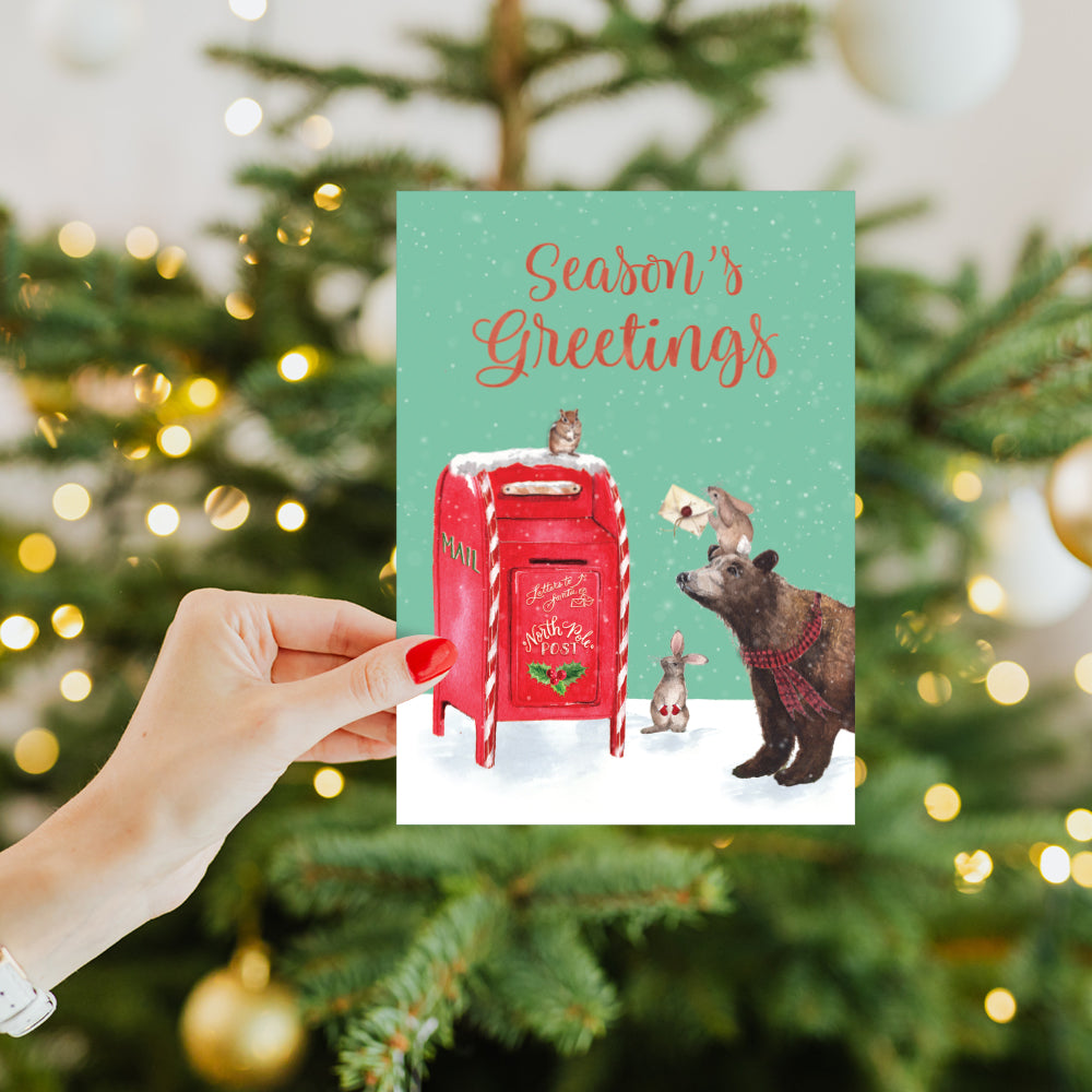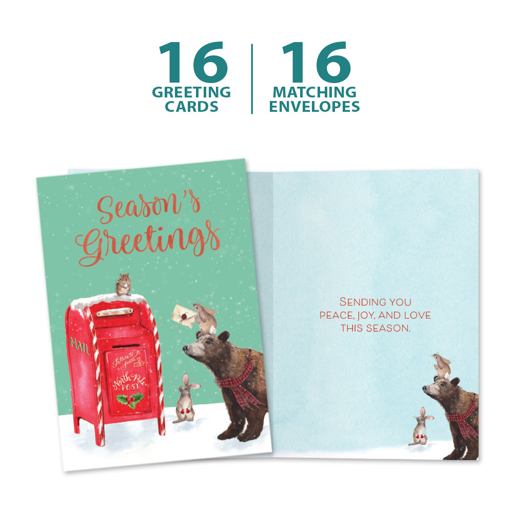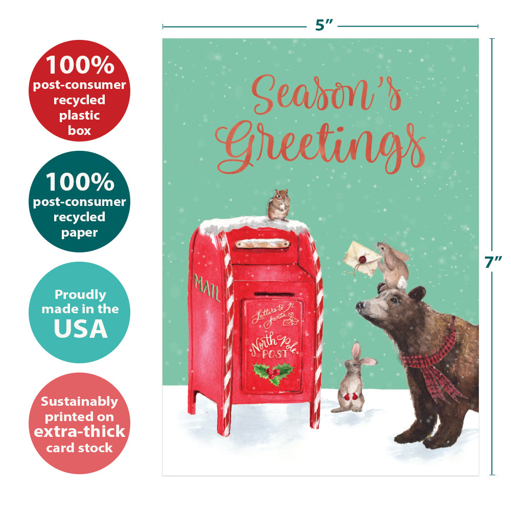 This Christmas card set shares the message "Season's greetings" on the cover, and on the inside reads "Sending you peace, joy, and love this season". It features art by Cami Monet and includes sixteen 5 x 7 greeting cards with matching ARTvelopes (all our 5 x 7 envelopes are designed to match the greeting card cover art). Printing powered by solar energy. 100% Post-consumer recycled. Proudly Made in the USA