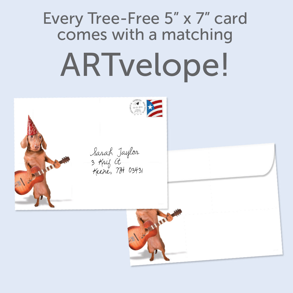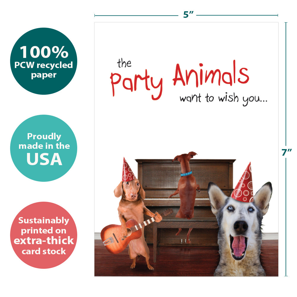 This 5 x 7 Birthday greeting card reads "The party animals want to wish you..." on the cover, and on the inside shares the message "A doggone happy birthday". It features art by Annette Shaff, includes a fully printed matching ARTvelope, and is made from 100% post-consumer recycled material. Our printing processes are powered by solar energy and are proudly made in the USA. This is for a retail ready 6 Pack