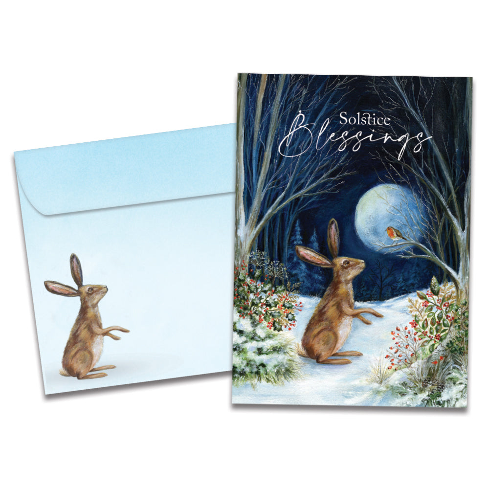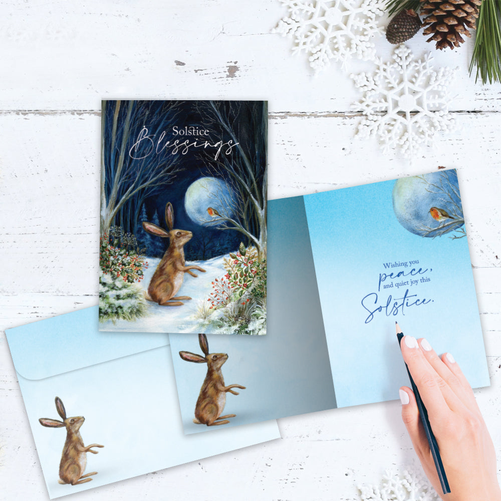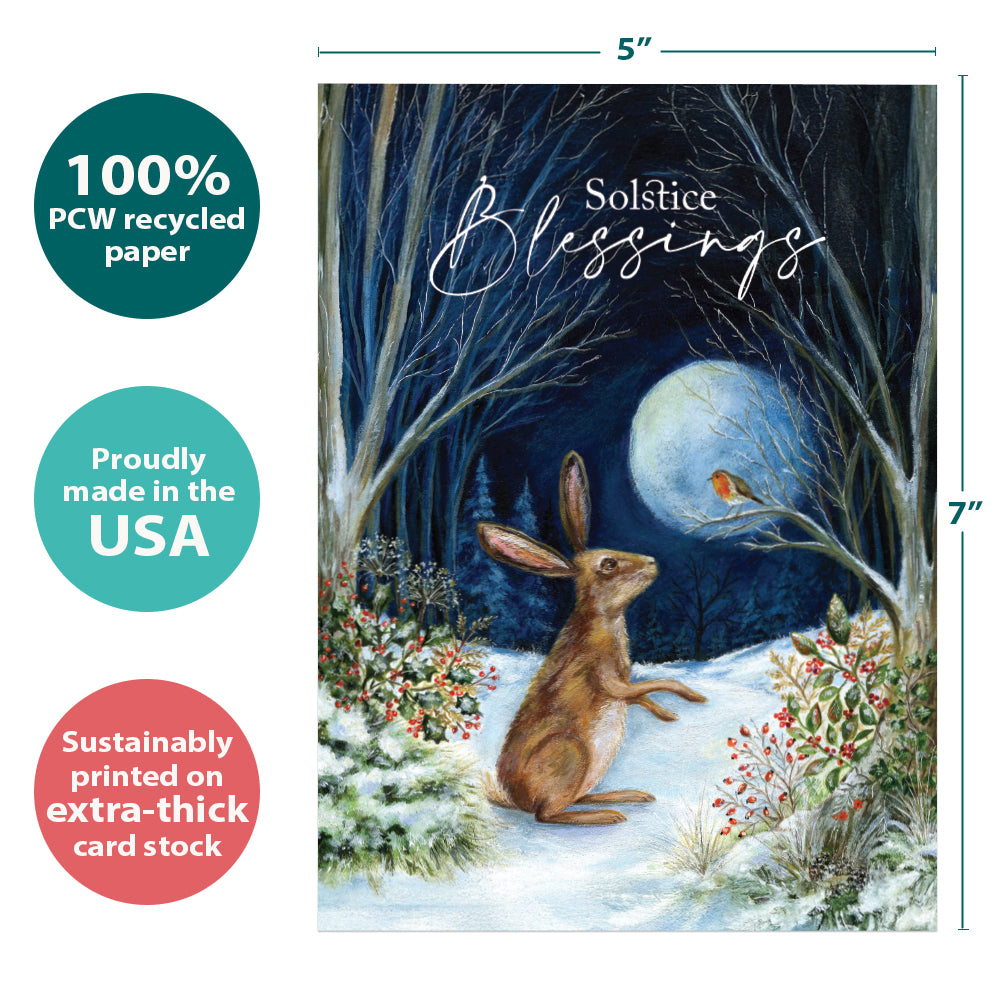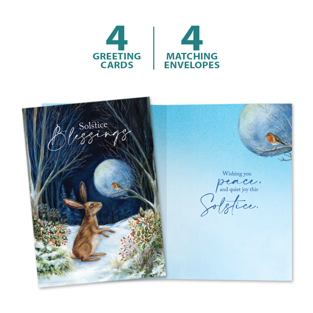 This Solstice card set shares the message "Solstice blessings" on the cover, and on the inside reads "Wishing you peace and quiet joy this solstice". It features art by Ileana Oakley and includes four 5 x 7 greeting cards with matching ARTvelopes (all our 5 x 7 envelopes are designed to match the greeting card cover art). Printing powered by solar energy. 100% Post-consumer recycled. Proudly Made in the USA