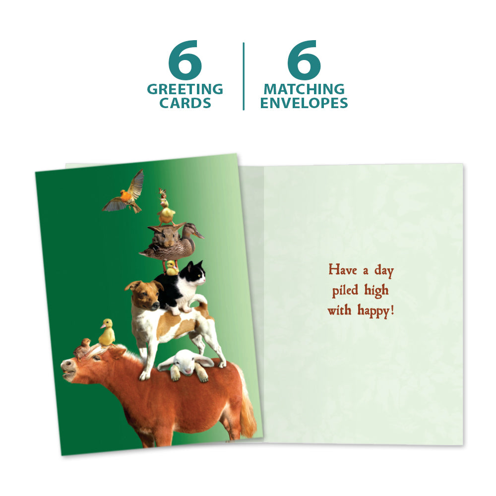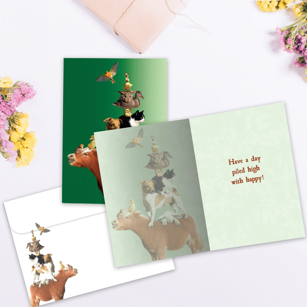 This 5 x 7 Birthday greeting card is blank on the cover, and on the inside shares the message "Have a day piled high with happy!". It features art by Chiara Castellini, includes a fully printed matching ARTvelope, and is made from 100% post-consumer recycled material. Our printing processes are powered by solar energy and are proudly made in the USA. This is for a retail ready 6 Pack