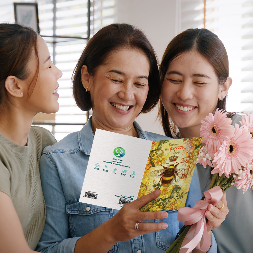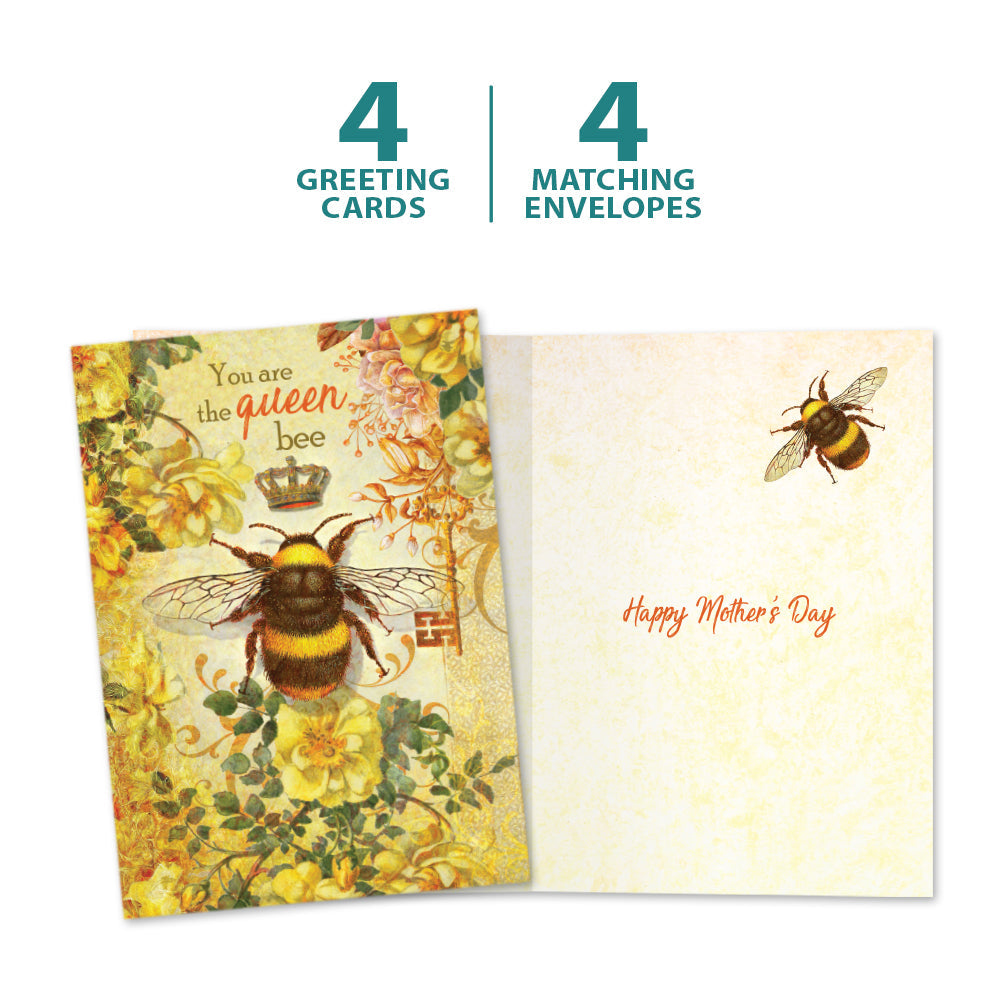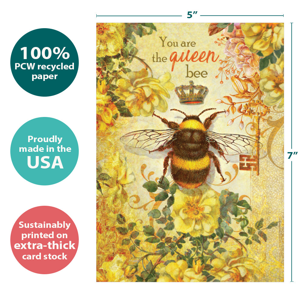 This Mother's Day card set shares the message "You are the queen bee" on the cover, and on the inside reads "Happy Mother's Day". It features art by Jena Dellagrottaglia and includes four 5 x 7 greeting cards with matching ARTvelopes (all our 5 x 7 envelopes are designed to match the greeting card cover art). Printing powered by solar energy. 100% Post-consumer recycled. Proudly Made in the USA