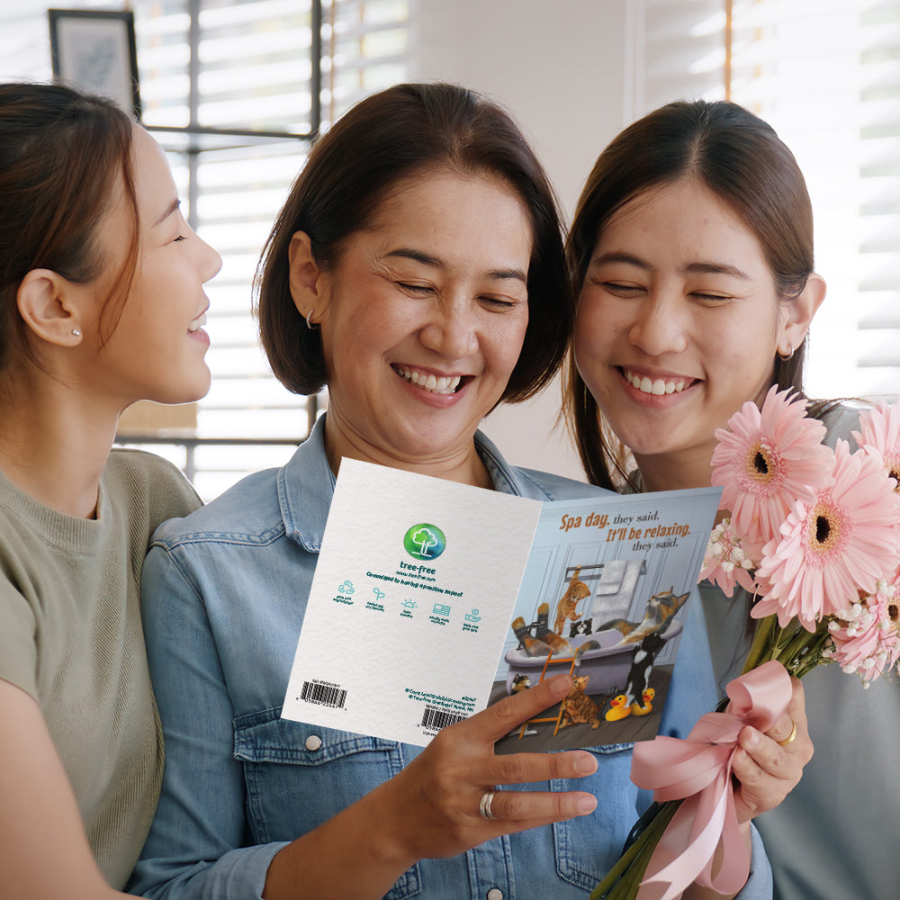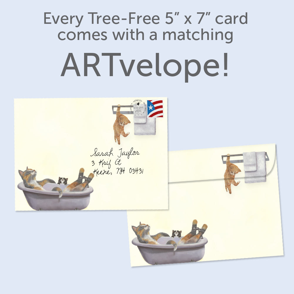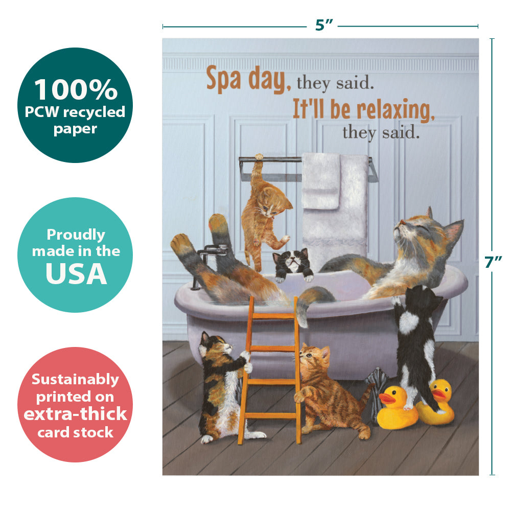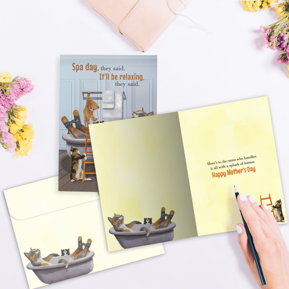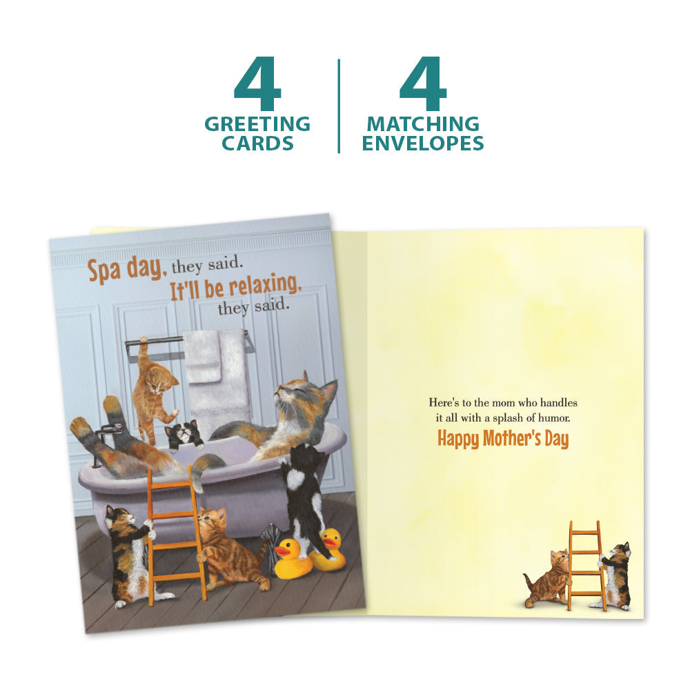 This Mother's Day card set shares the message "Spa day, they said. It'll be relaxing, they said" on the cover, and on the inside reads "Here's to the mom who handles it all with a splash of humor. Happy Mother's Day". It features art by Carol Lew and includes four 5 x 7 greeting cards with matching ARTvelopes (all our 5 x 7 envelopes are designed to match the greeting card cover art). Printing powered by solar energy. 100% Post-consumer recycled. Proudly Made in the USA