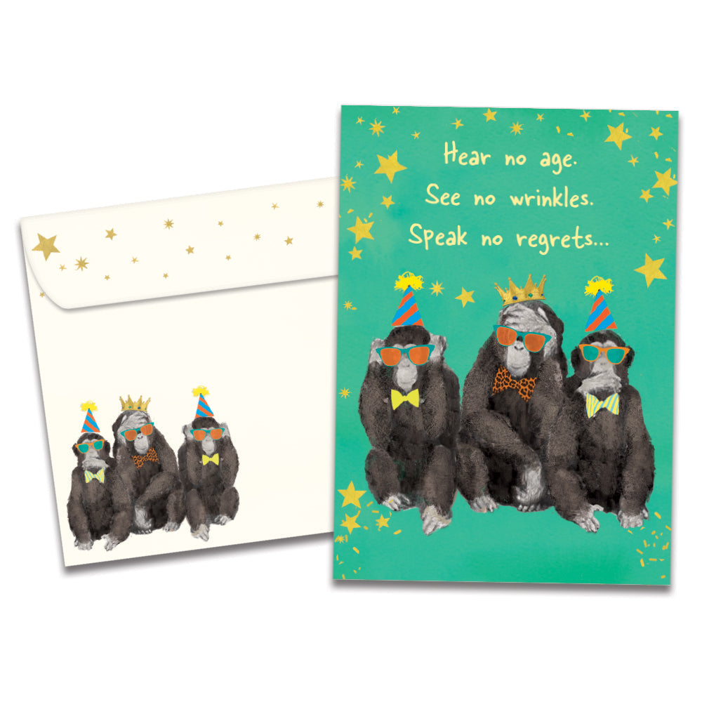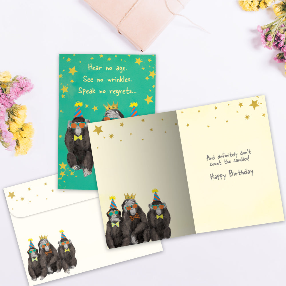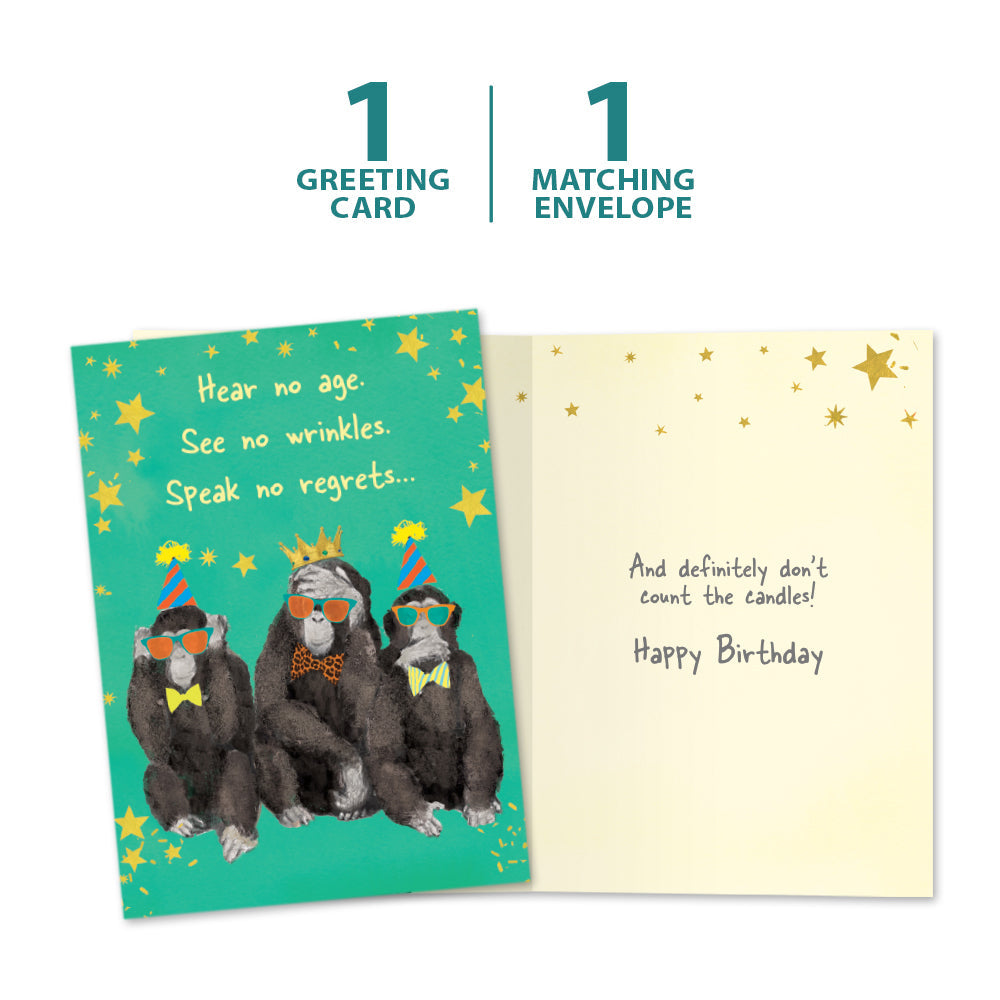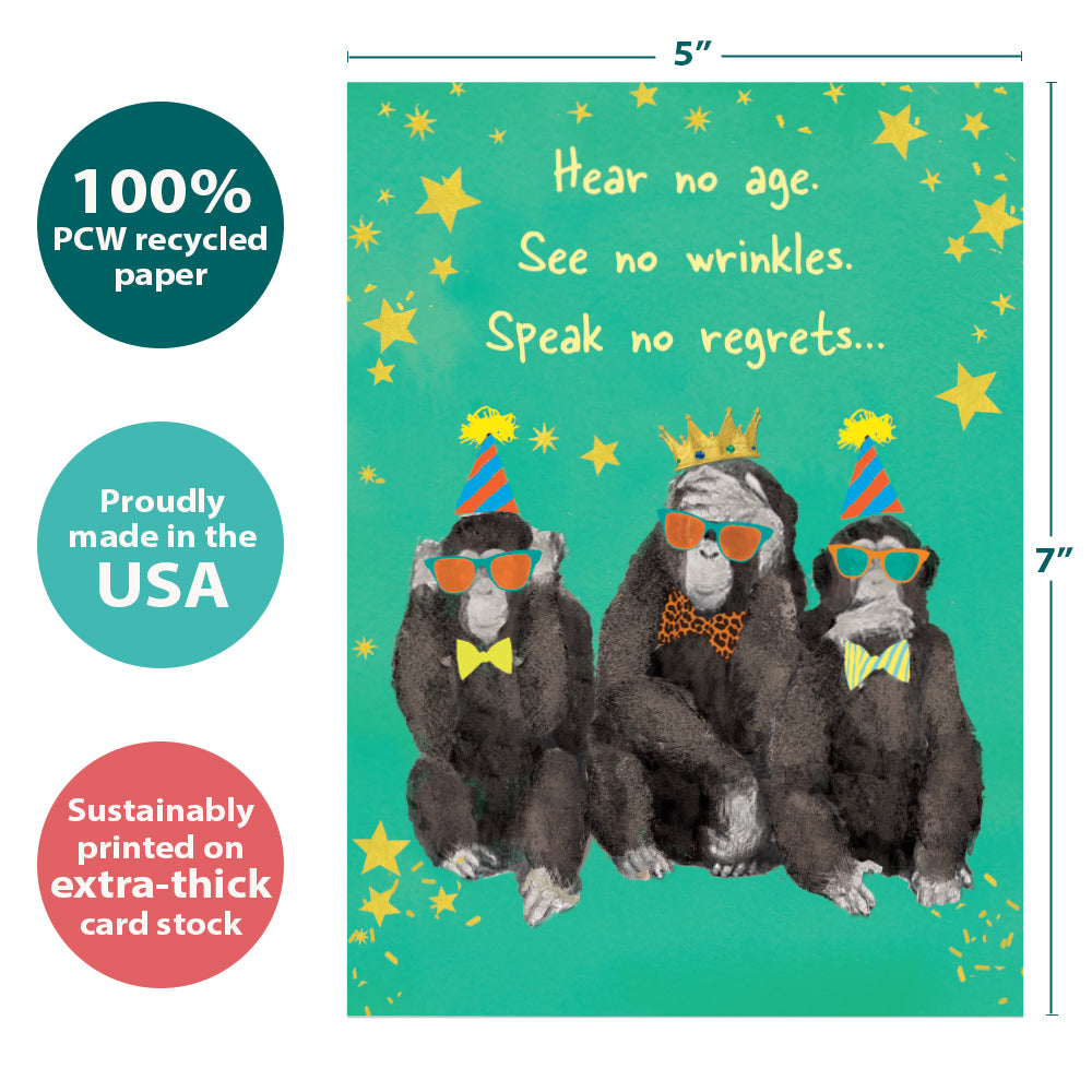 This Birthday card set shares the message "Hear no age. See no wrinkles. Speak no regrets..." on the cover, and on the inside reads "And definitely don't count the candles! Happy birthday". It features art by Hammond Gower Publications and includes one 5 x 7 greeting card with a matching ARTvelope (all our 5 x 7 envelopes are designed to match the greeting card cover art). Printing powered by solar energy. 100% Post-consumer recycled. Proudly Made in the USA
