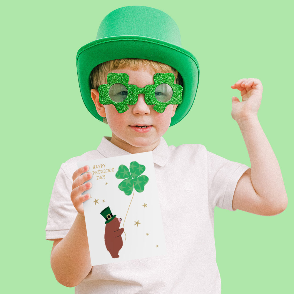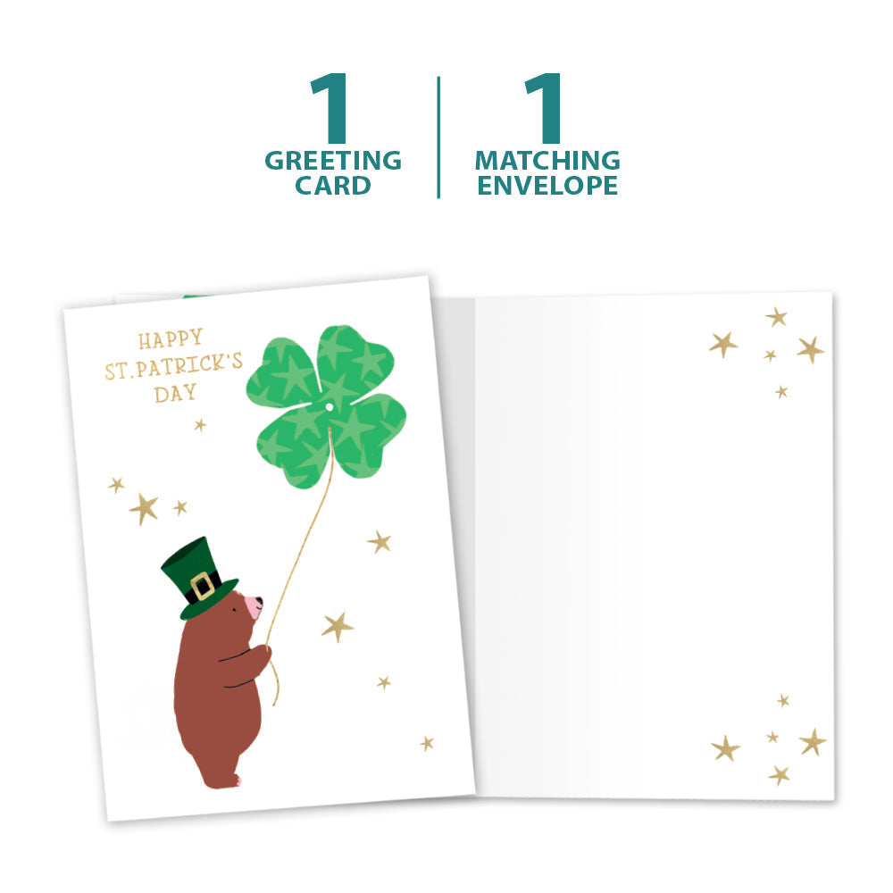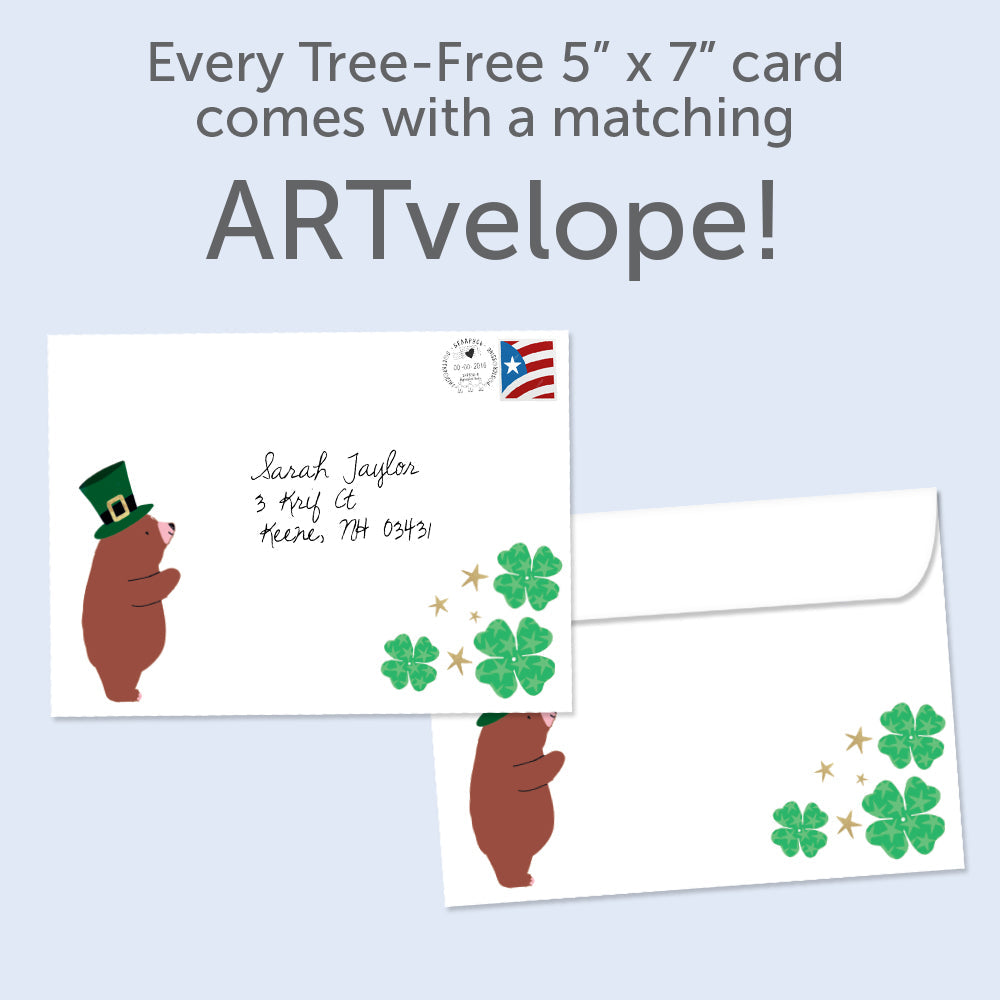 This St. Patrick's Day card set shares the message "Happy St. Patrick's Day" on the cover and is blank on the inside. It features art by Hammond Gower Publications and includes one 5 x 7 greeting card with a matching ARTvelope (all our 5 x 7 envelopes are designed to match the greeting card cover art). Printing powered by solar energy. 100% Post-consumer recycled. Proudly Made in the USA